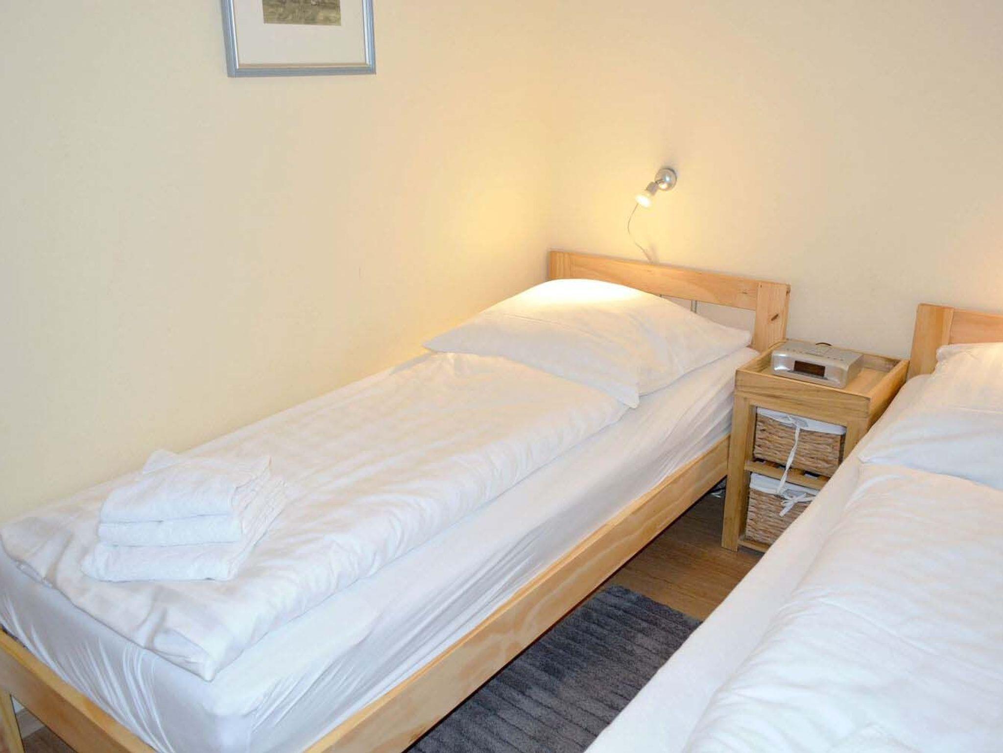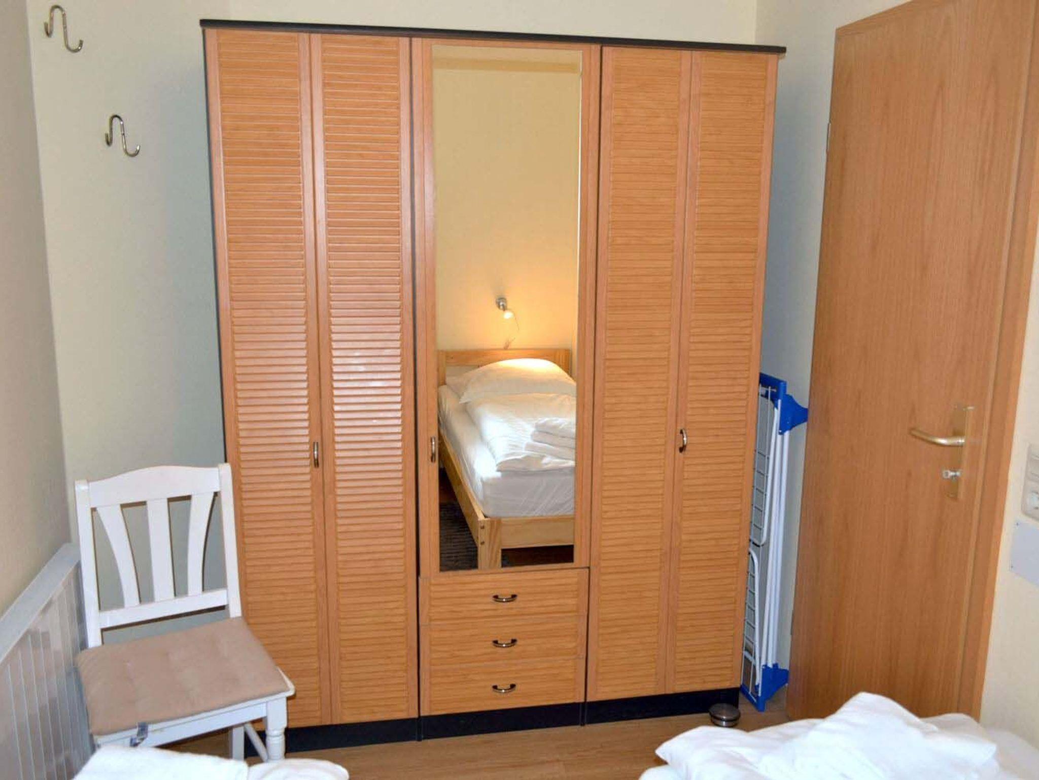 Schlafzimmer: 2 Einzelbetten, E-Heizung, Kleiderschrank, Nachttisch, Radiowecker, Spiegel, Stuhl, Wäscheständer