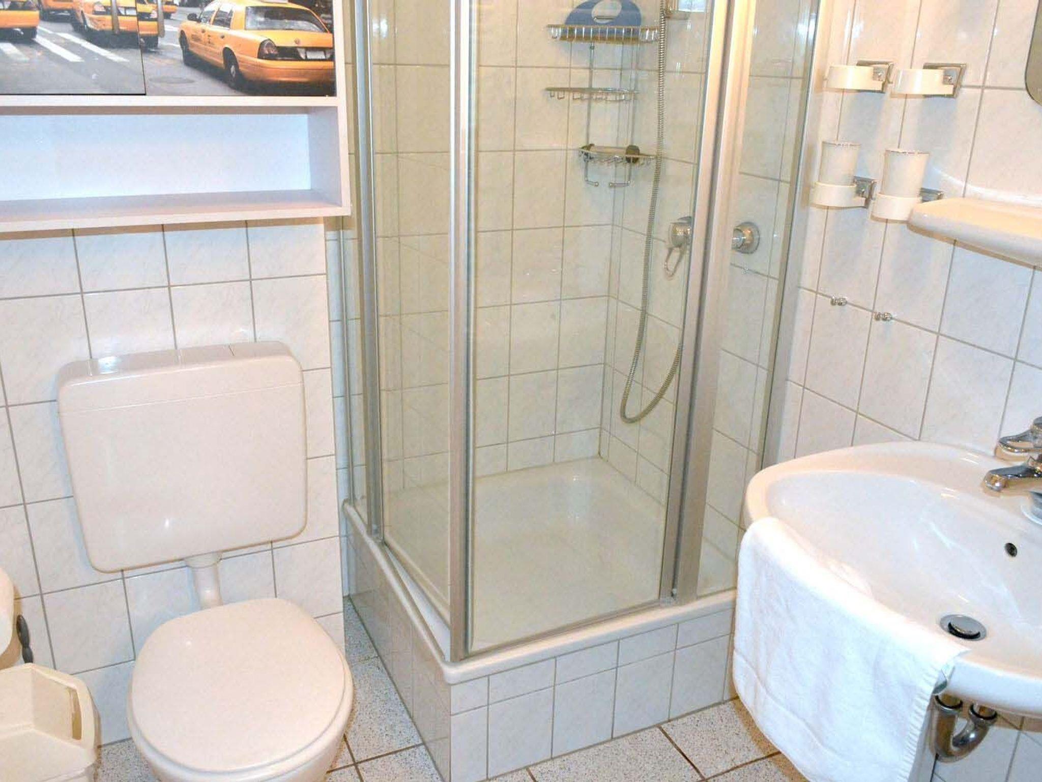 Bad: Dusche, Duschkabine, Fön, Handtuchheizkörper, Hängeschrank, Spiegel, Waschbecken, WC