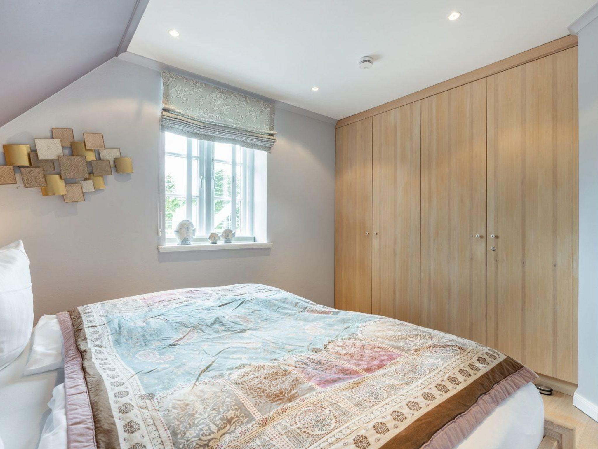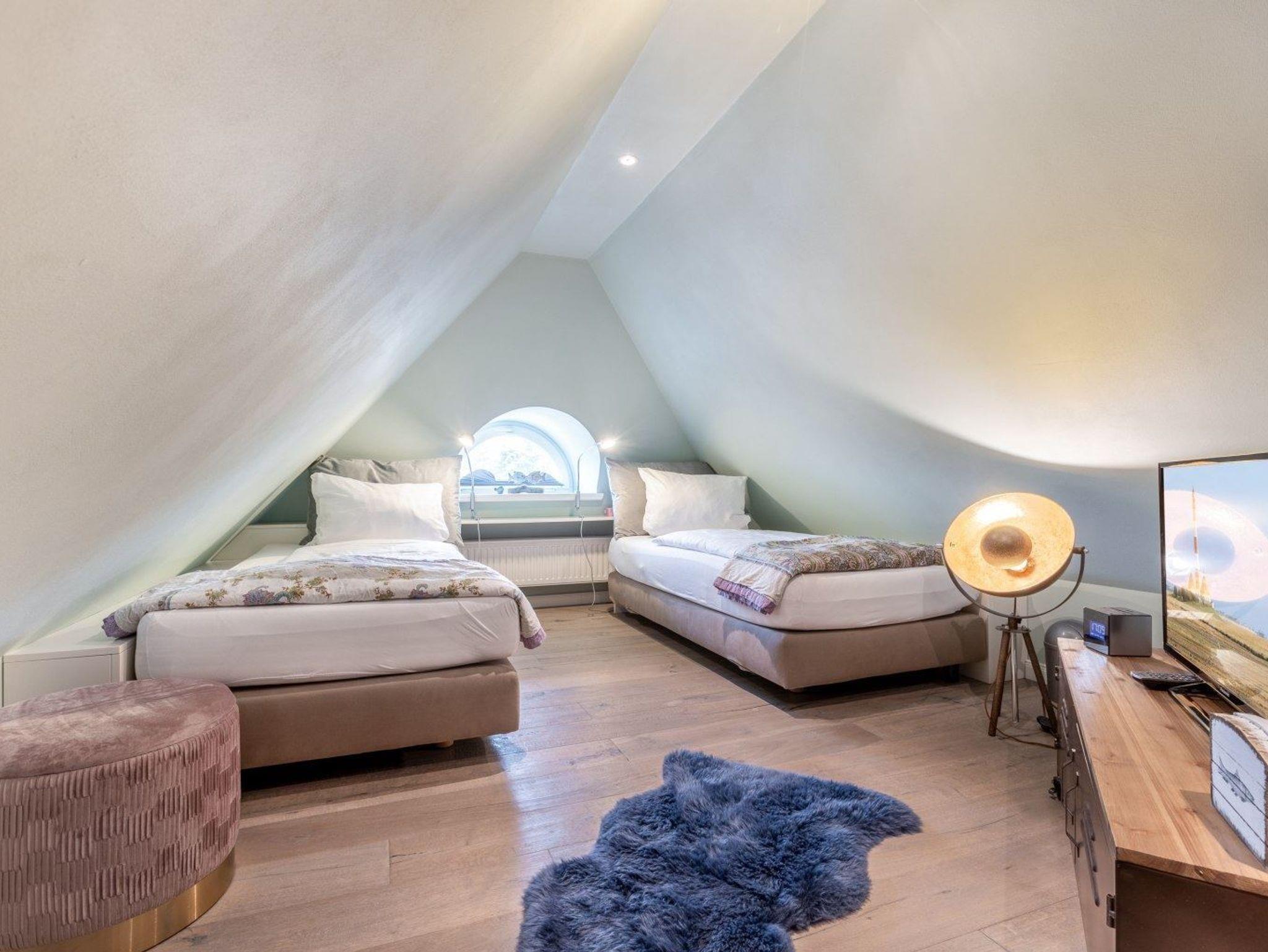 3 Schlafzimmer: Doppelbett (OG), Etagenbetten (OG), 2 Einzelbetten (DG, kombinierbar). 2 Bäder: Duschbad (EG), Vollbad mit Sauna (OG).