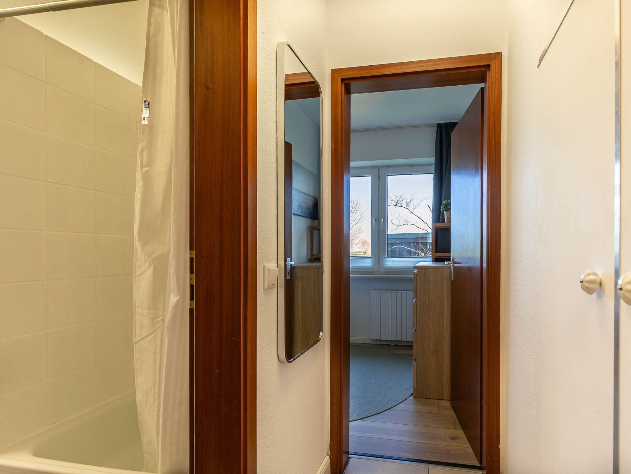 Badezimmer (Duschbad) mit Dusche (hoher Eintritt: ca. 45cm), WC, Waschmaschine, Föhn und Tageslicht.