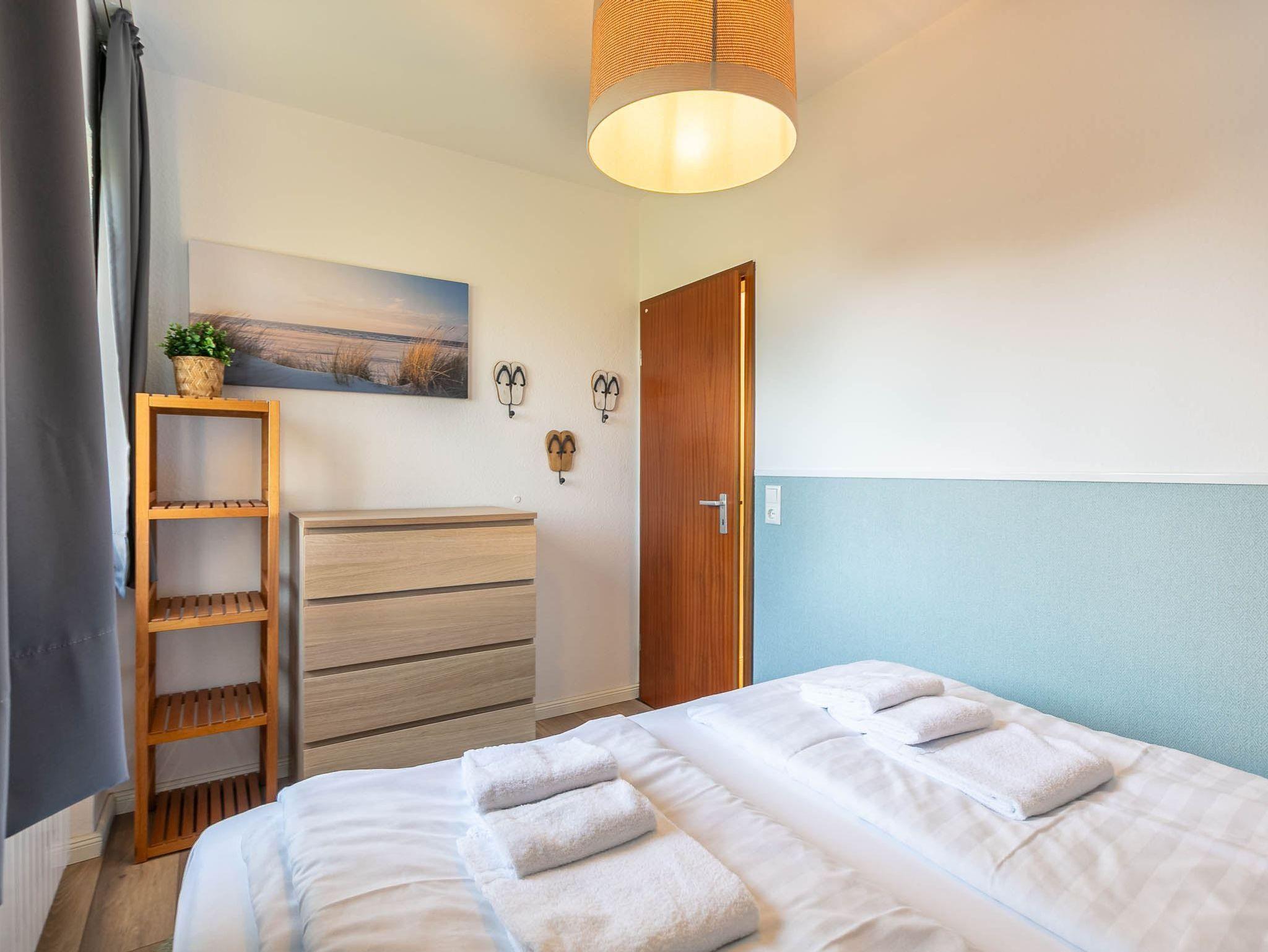 Schlafzimmer mit Doppelbett (160x200cm, Boxspring) und Kommode.