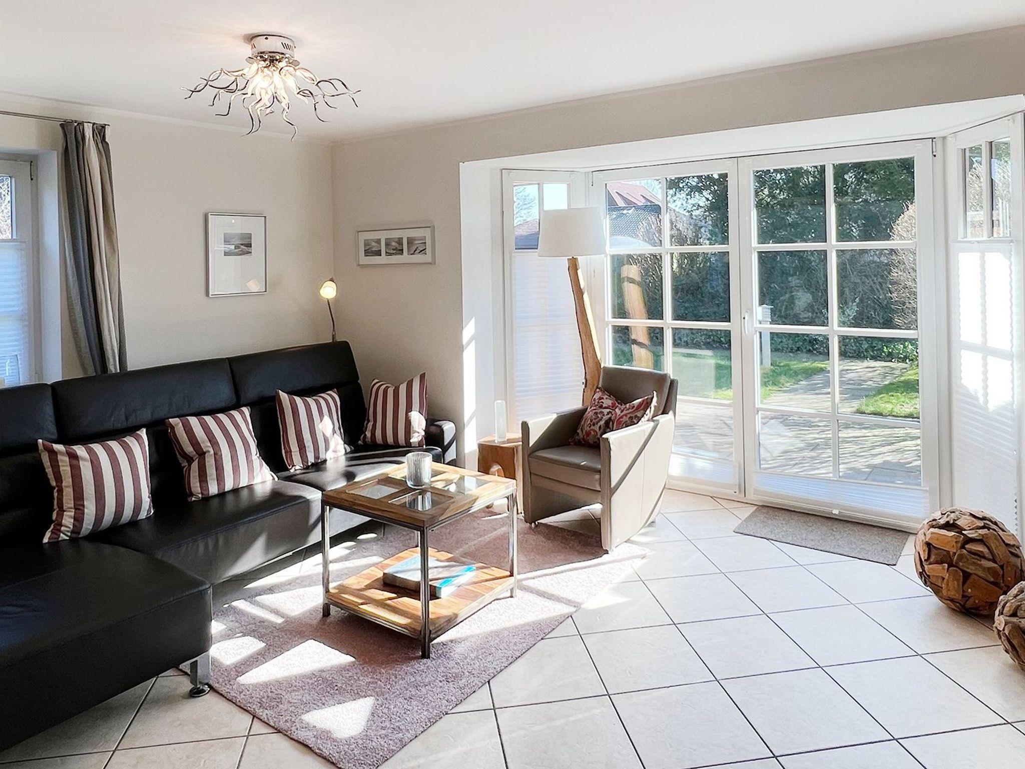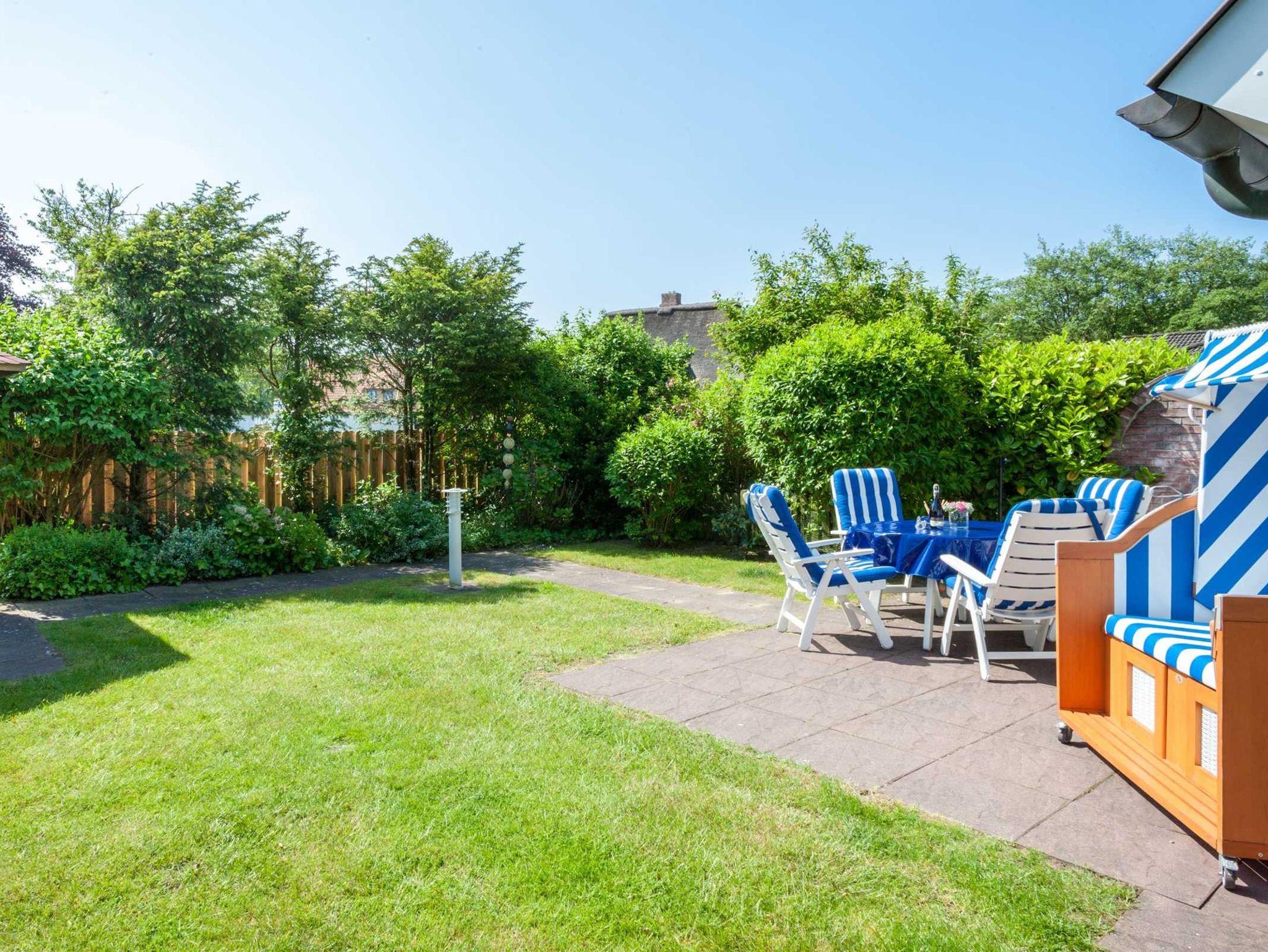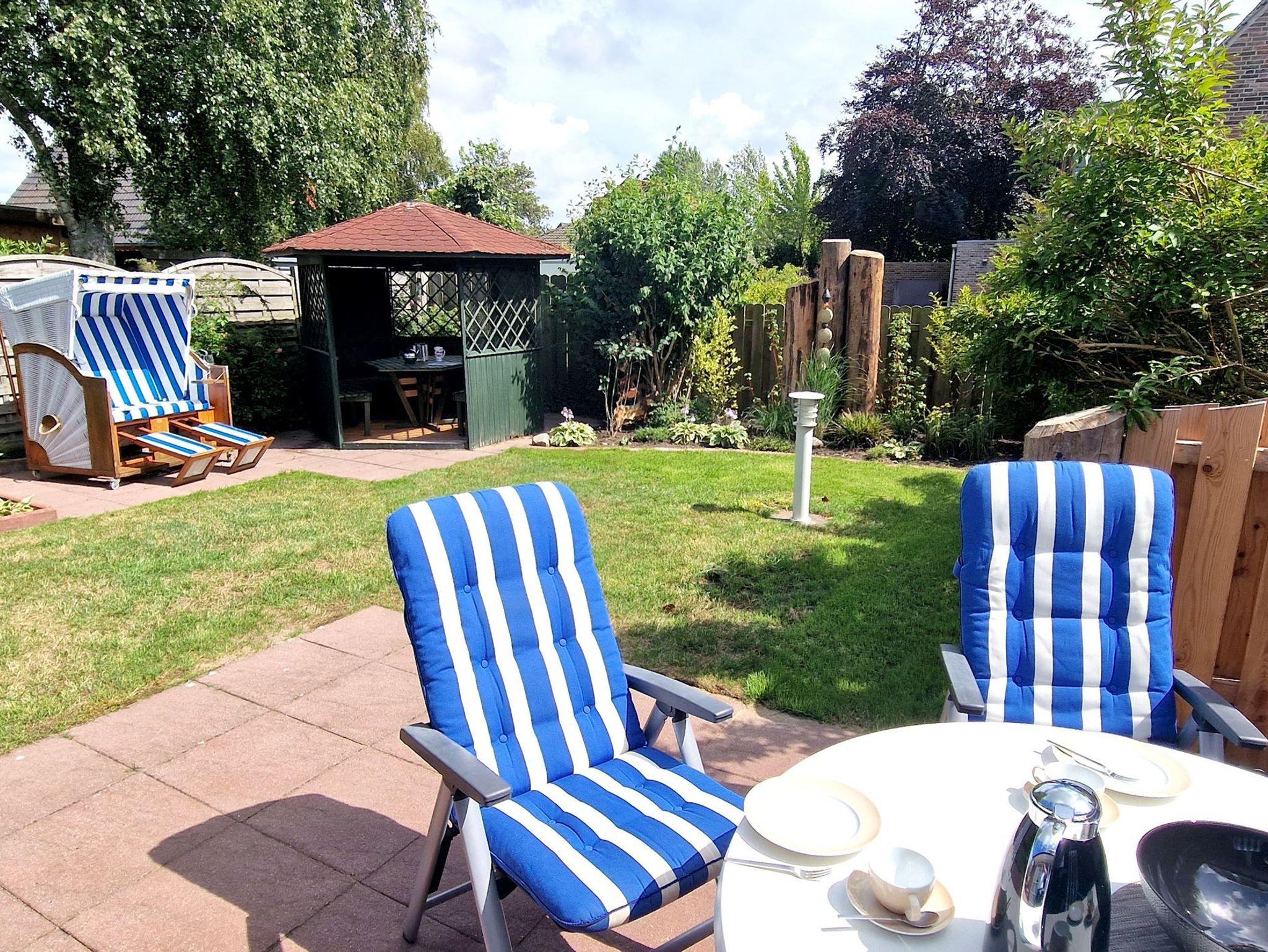 Südterrasse: Direkter Zugang vom Wohnzimmer, ausgestattet mit Gartenmöbeln für 6 Personen und einem Strandkorb.