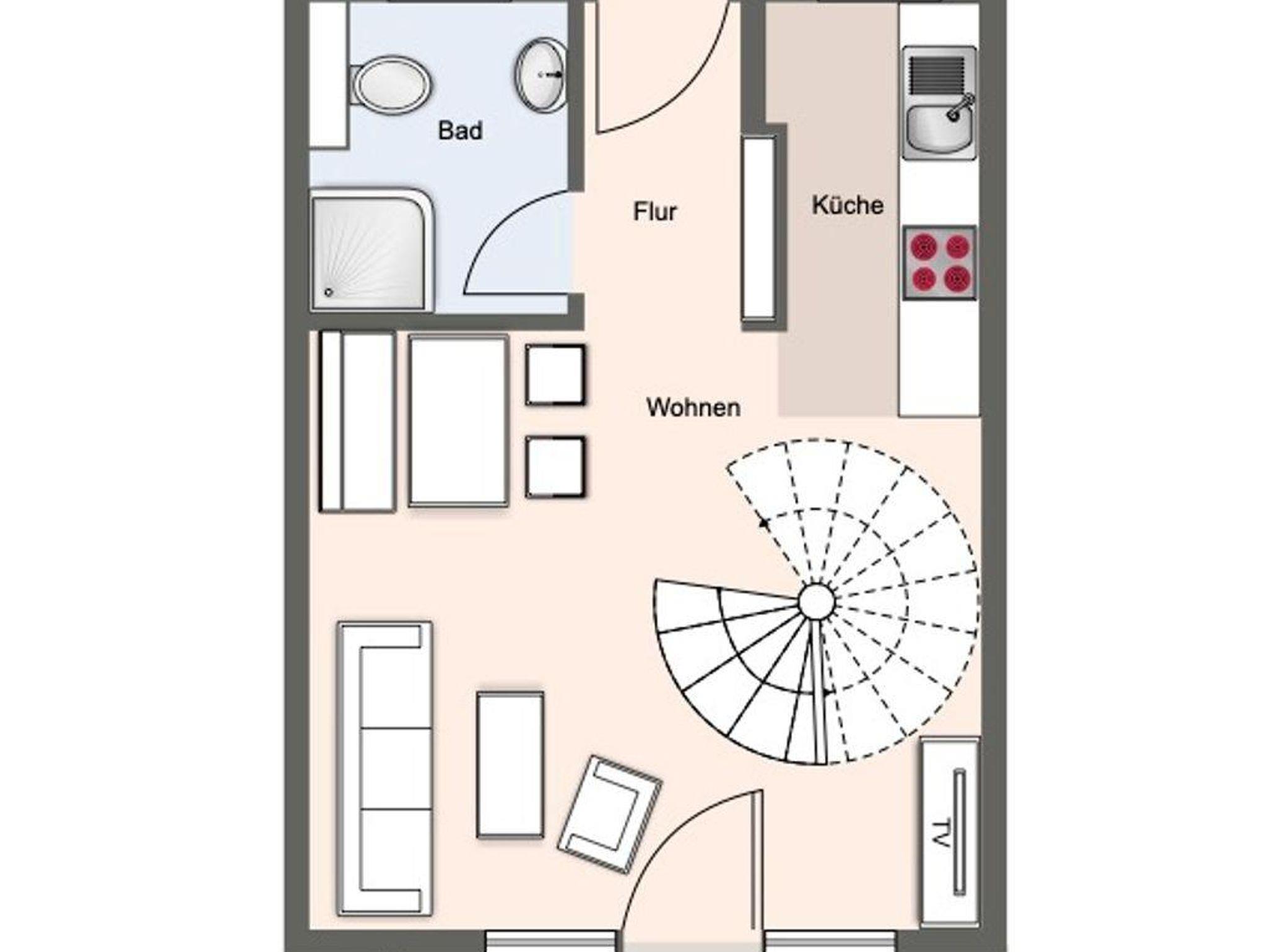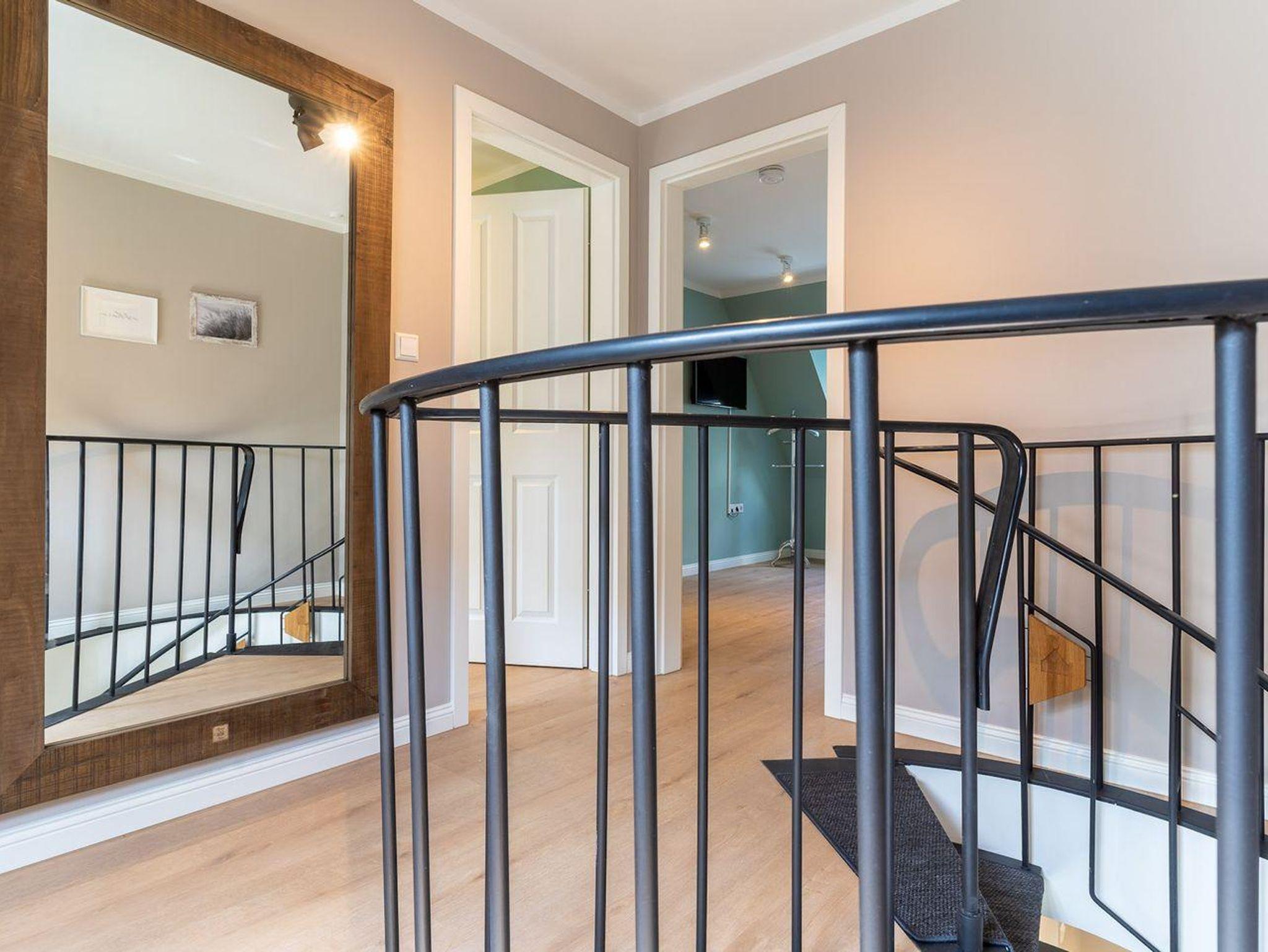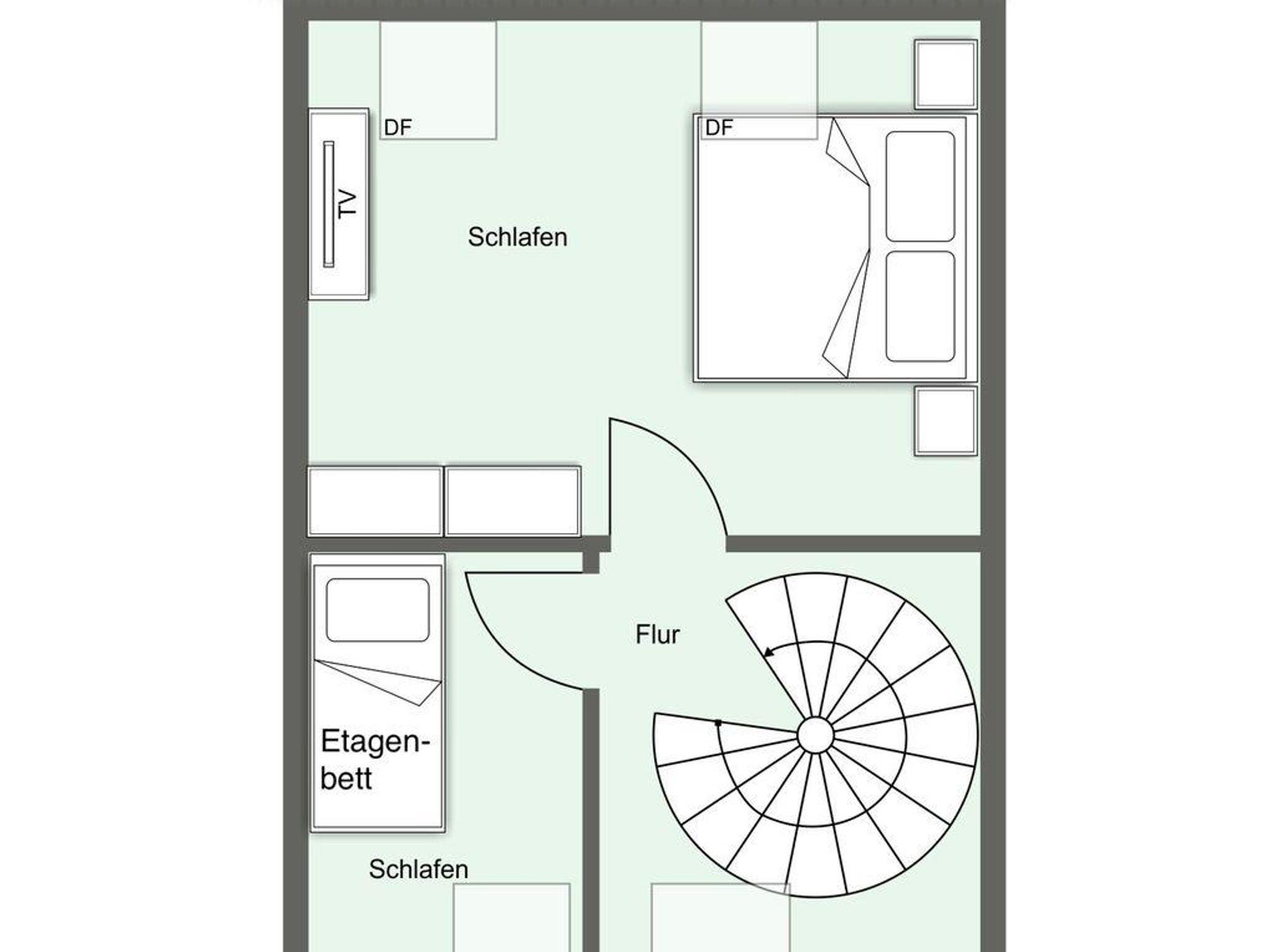 Über eine Wendeltreppe aus dem Wohnraum gelangt man in das Obergeschoss. Hier befinden sich zwei gemütliche Schlafzimmer, eines mit einem Doppelbett und eines mit einem Etagenbett.