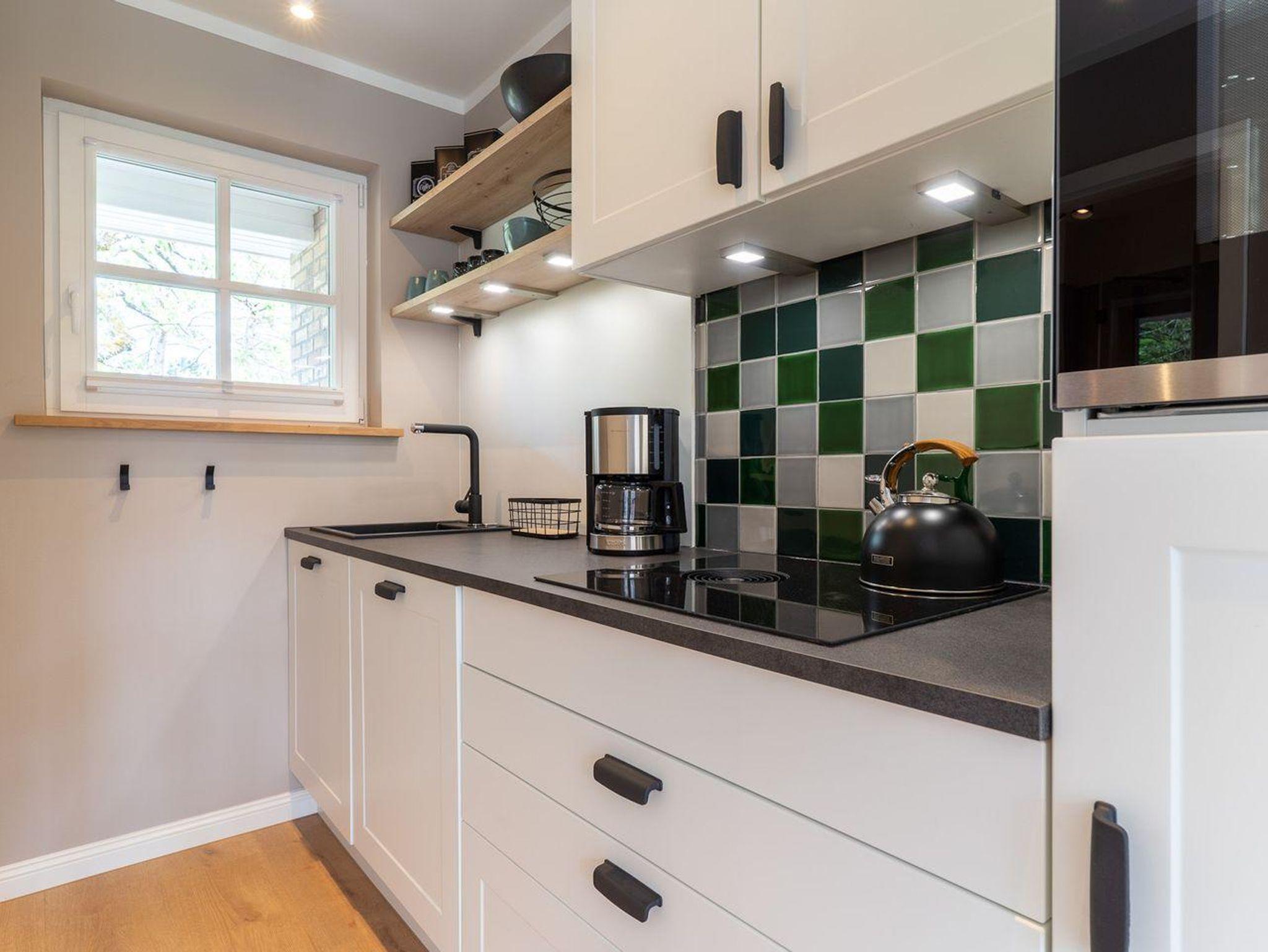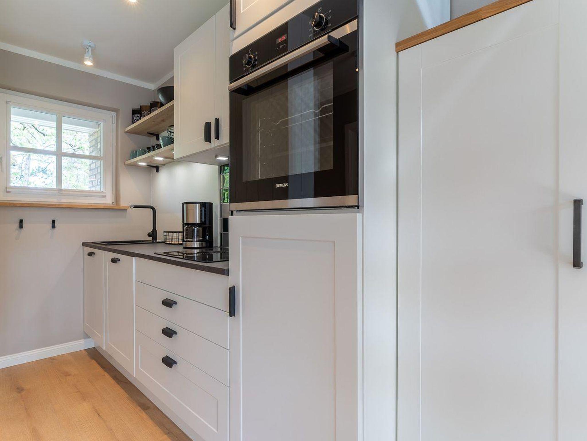 Im Erdgeschoss befindet sich ein großzügiger Wohnraum mit TV und einer modernen Wohnküche. Die Küche ist voll ausgestattet und verfügt über hochwertige Elektrogeräte.