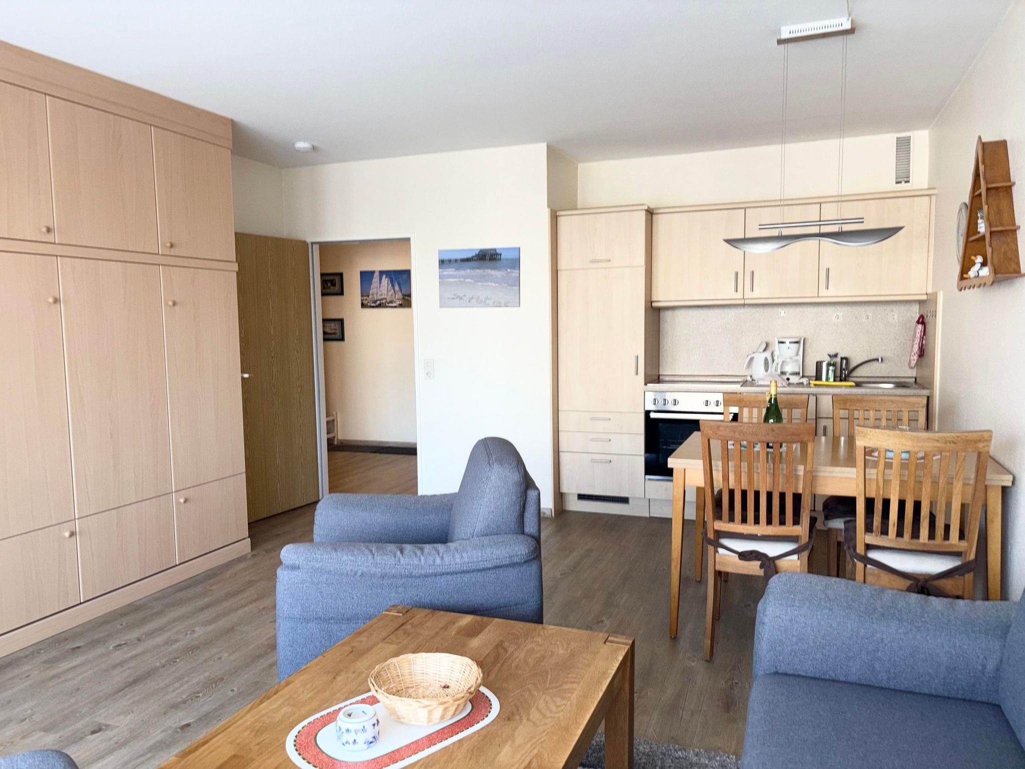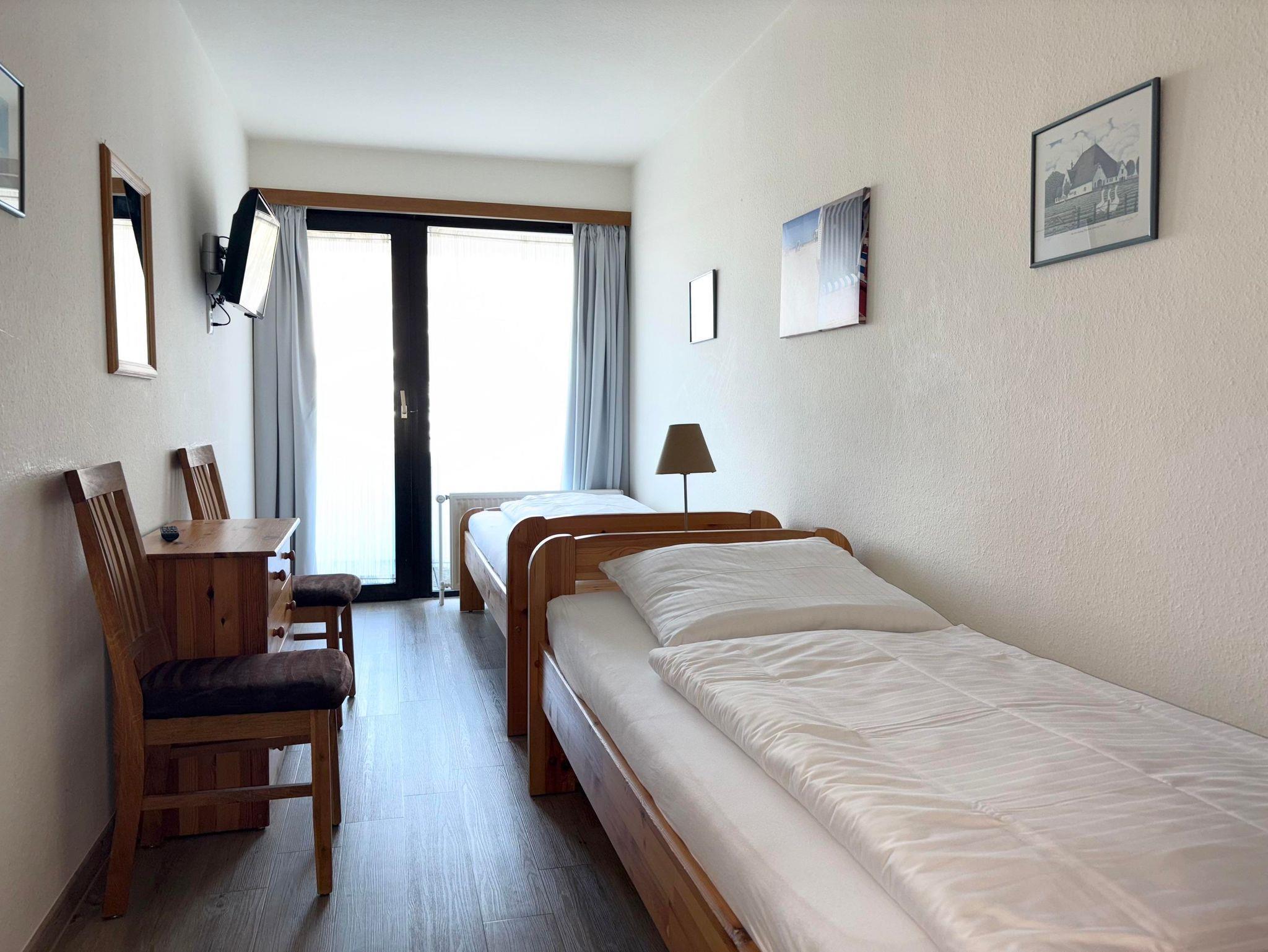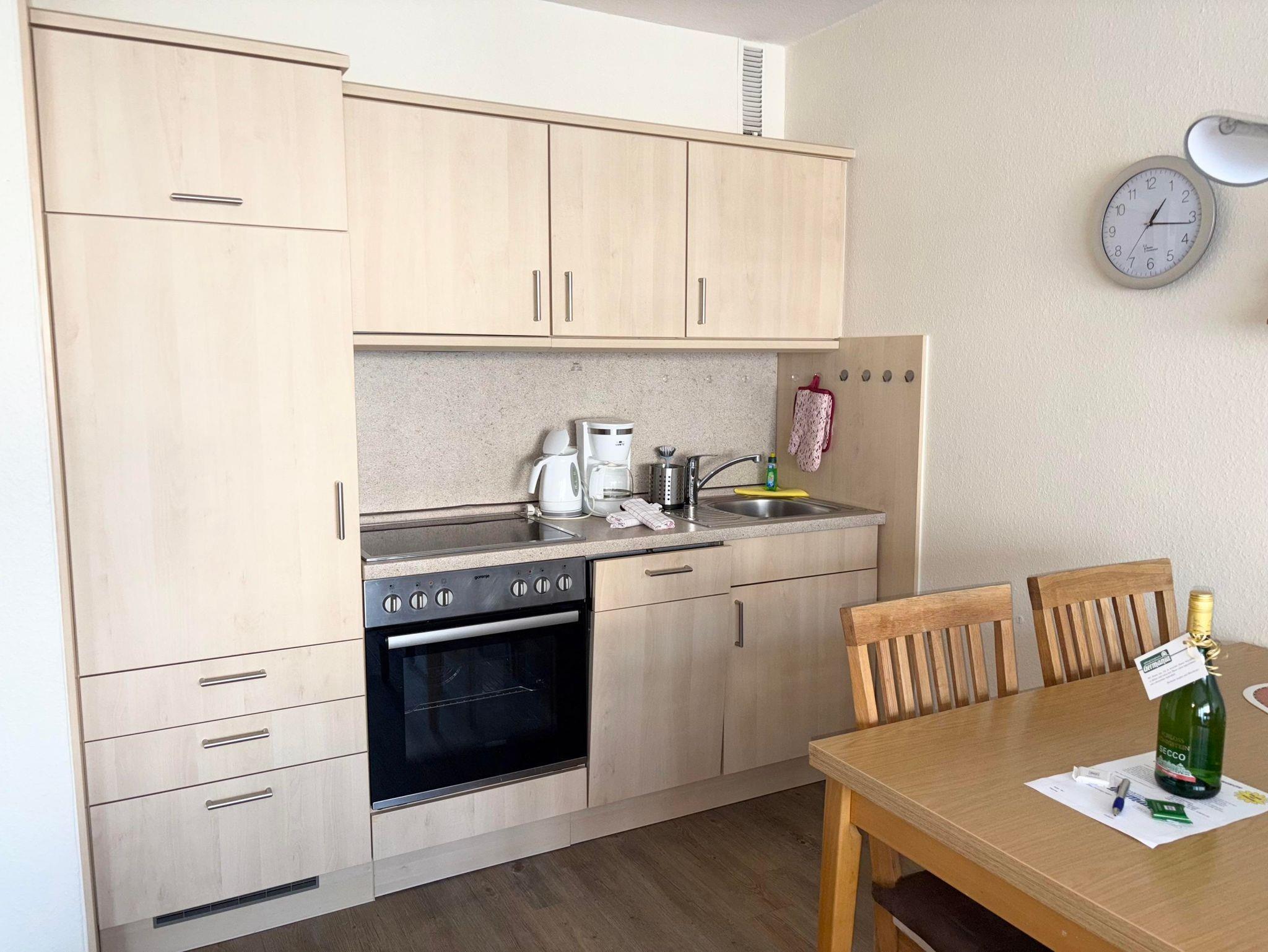 Schlafraum mit 2 Einzelbetten, Wohn-Schlafraum mit 2 Wandschrankbetten (Februar 2018 neu), PVC-Fußboden, Sitzecke, Essecke, Küchenzeile mit Geschirrspüler und Backofen, 2 x Kabel-TV, Dusche/WC, Durchwahltelefon, Balkon, PKW-Platz-Nr.28, Aufzug und Fahrradkeller vorhanden. Rezeption, Brötchenservice, Schwimmbad, Sauna kostenpflichtig,