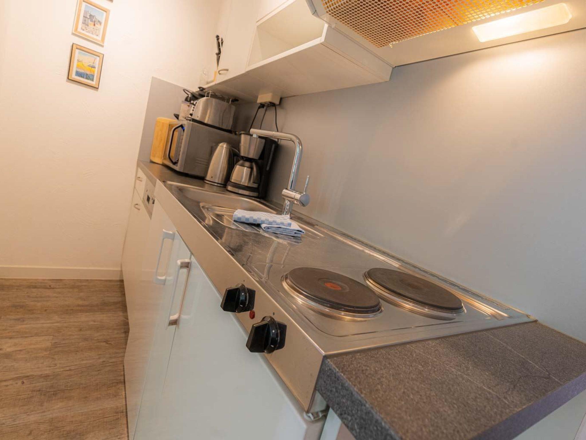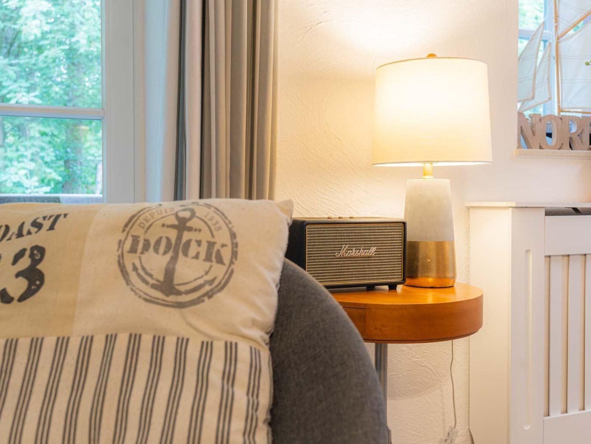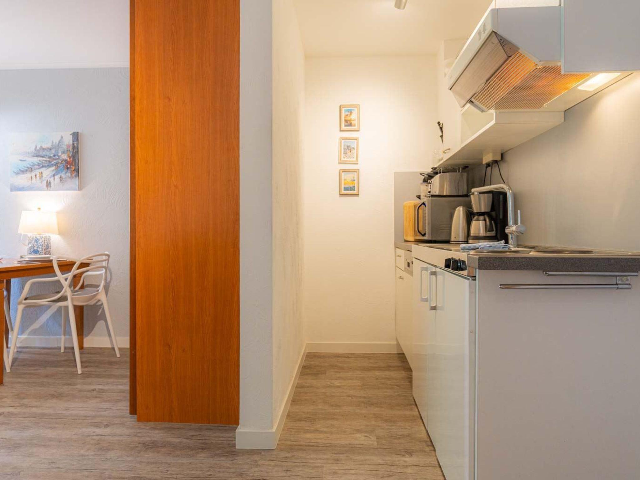 Wohnzimmer mit ausklappbarem (Schlaf-) Sofa (140x190cm), Sessel, großem TV (Kabel), Sony Playstation 3, Bluetooth-Lautsprecher von Marshall, Kleiderschrank und Esstisch mit 3 Stühlen. Direkter Zugang zum möblierten Balkon nach Südwesten mit Ausblick auf das Kurwäldchen. Offene Küche mit Herd mit 2 Kochstellen, Mikrowelle mit Grillfunktion, Geschirrspüler und Kühlschrank mit Gefrierfach.