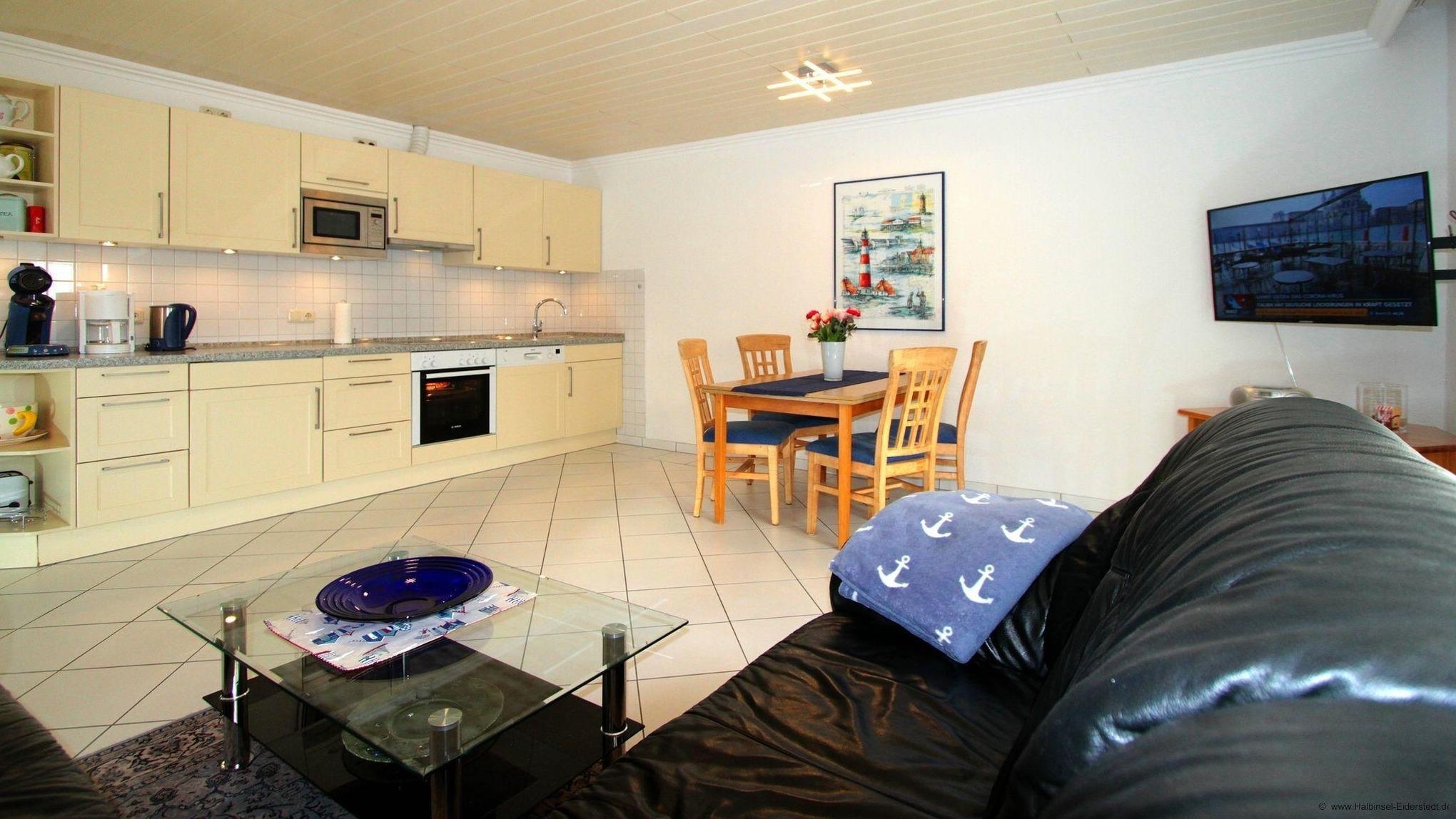 Im Wohnraum erwarten Sie eine Ledercouch , LCD Fernseher, DVD- Player und eine Stereoanlage. Die Küchenzeile ist mit folgenden ausgestattet: Herd mit Ceranfeld, Backofen, Mikrowelle, Kühlschrank, Geschirrspülmaschine, Kaffeemaschine, Wasserkocher, Mixer, Eierkocher sowie ausreichend Töpfe, Besteck und Geschirr für 5 Personen. Ein Esstisch mit 5 Stühlen steht für Sie bereit. Ein Kinderhochstuhl kann auf Anfrage gestellt werden. Das Duschbad (walk in Dusche) mit Fenster bietet genug Platz für Ihre Utensilien.