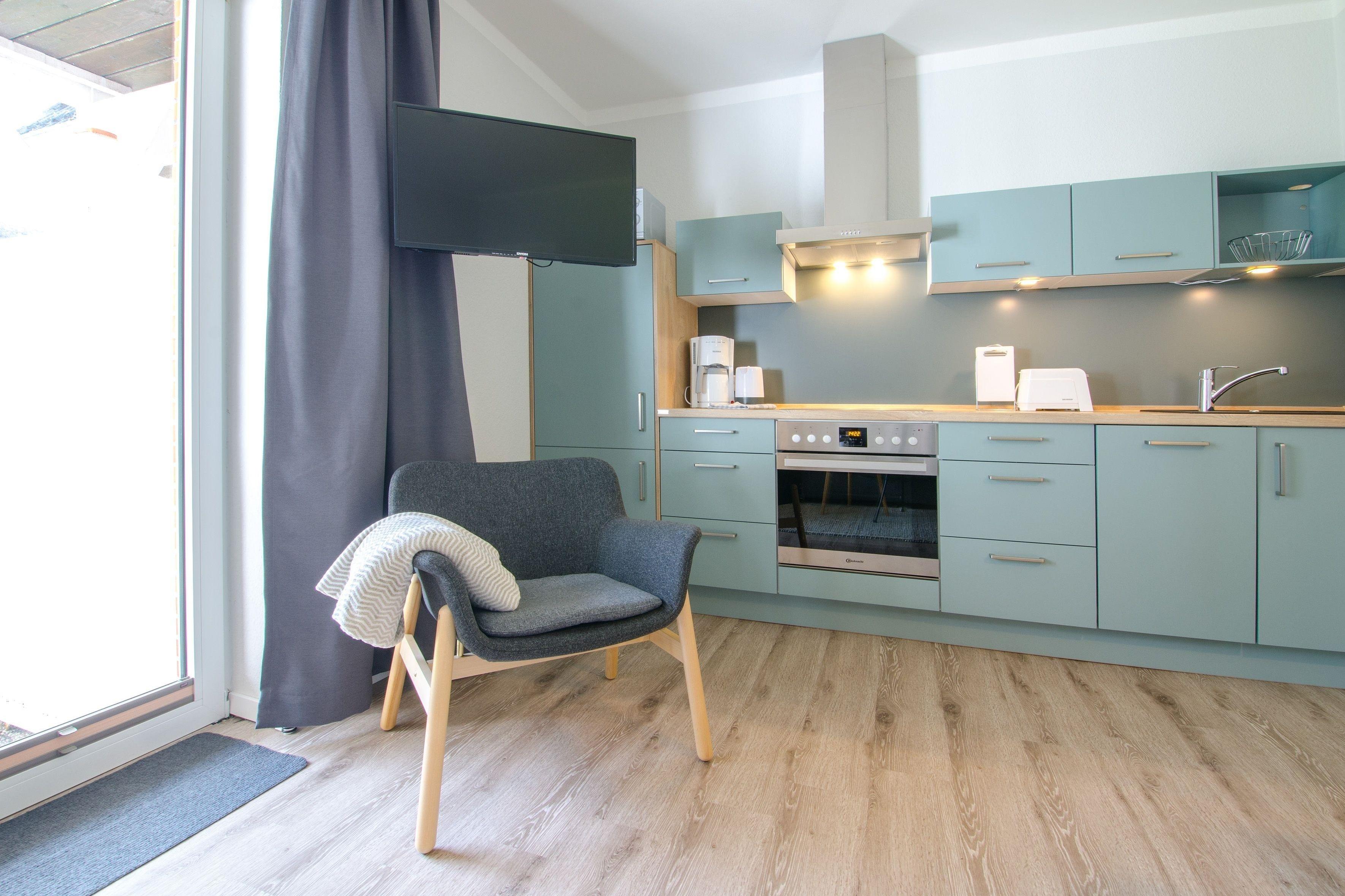 Ein gemütlicher Wohnraum mit Sat-TV, Radio und Essbereich, eine möblierte Terrasse, ein Schlafraum mit einem Doppelbett und TV, Bettwäsche und Handtücher können hinzugebucht werden, immer enthalten sind eine Duschmatte sowie Geschirrtücher und Spültuch. Vollausgestattete Küche mit Ceranfeld, Backofen, Kühlschrank, Geschirrspüler, Kaffeemaschine, Toaster, Wasserkocher. Bad mit ebenerdiger Dusche, Handtuchtrockner, WC und Fön, kostenfreies WLAN, überall Insektenschutz