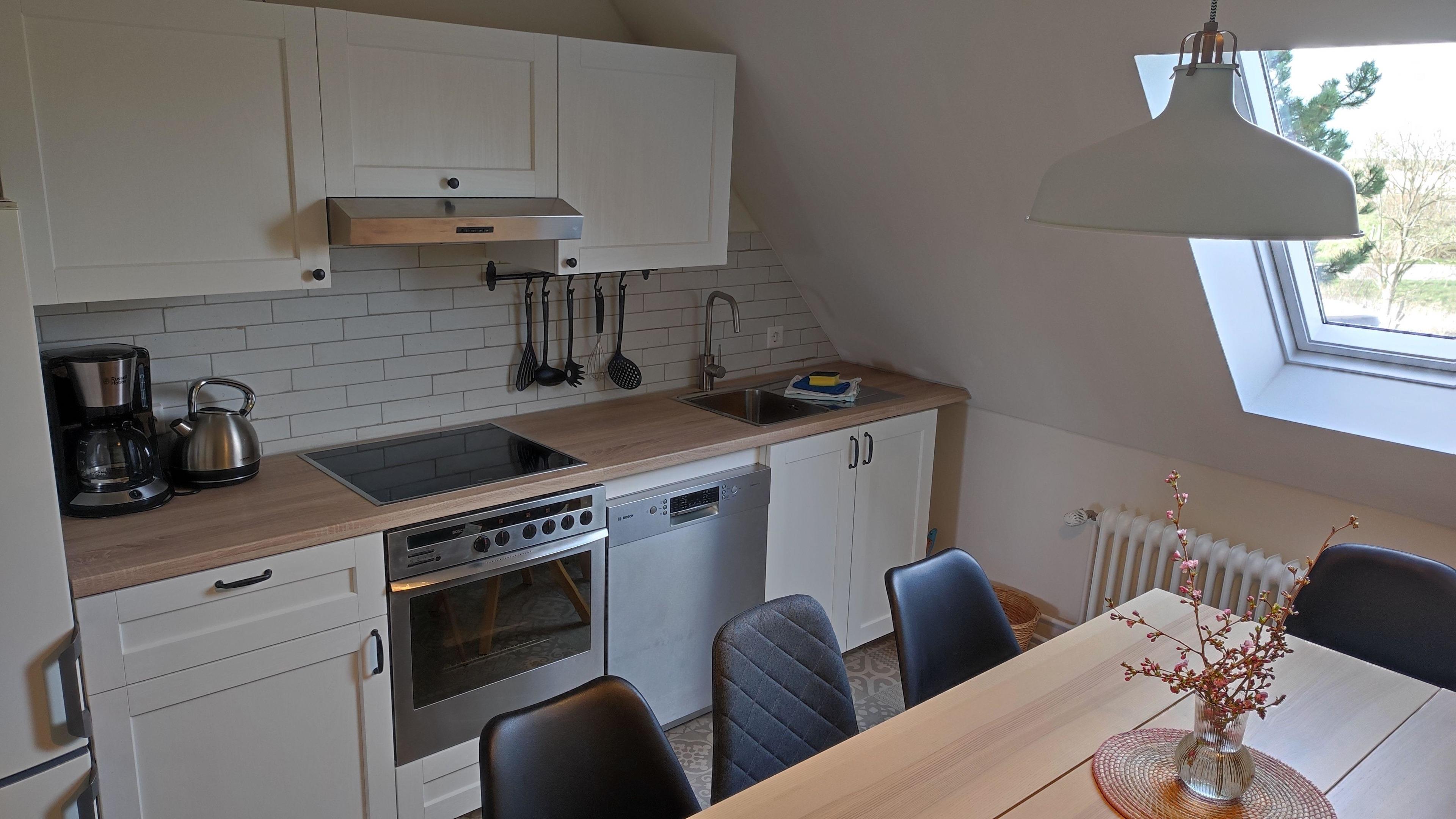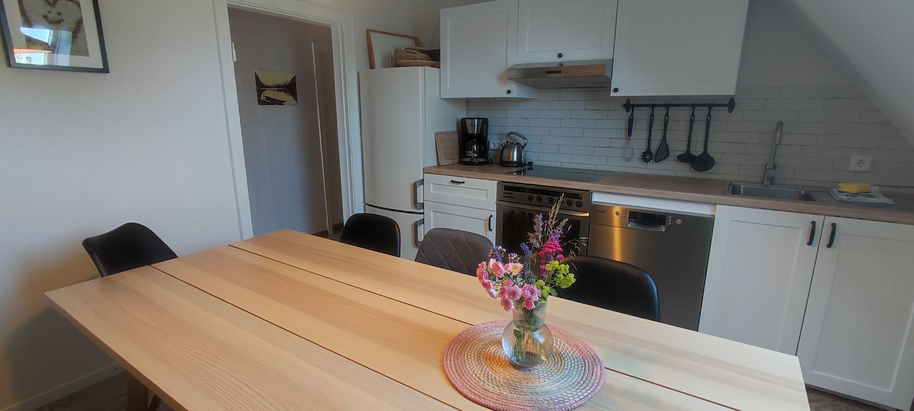 Die Wohnküche ist gut ausgestattet mit einem 4-Zonen Ceranfeld und Backofen, Dunstabzugshaube, Spülmaschine, Kühlschrank, separatem Gefrierfach, Kaffeemaschine, Wasserkocher und ausreichend Geschirr, dass Sie nach Herzenslust bekannte und auch neue nordfriesische Rezepte ausprobieren können.