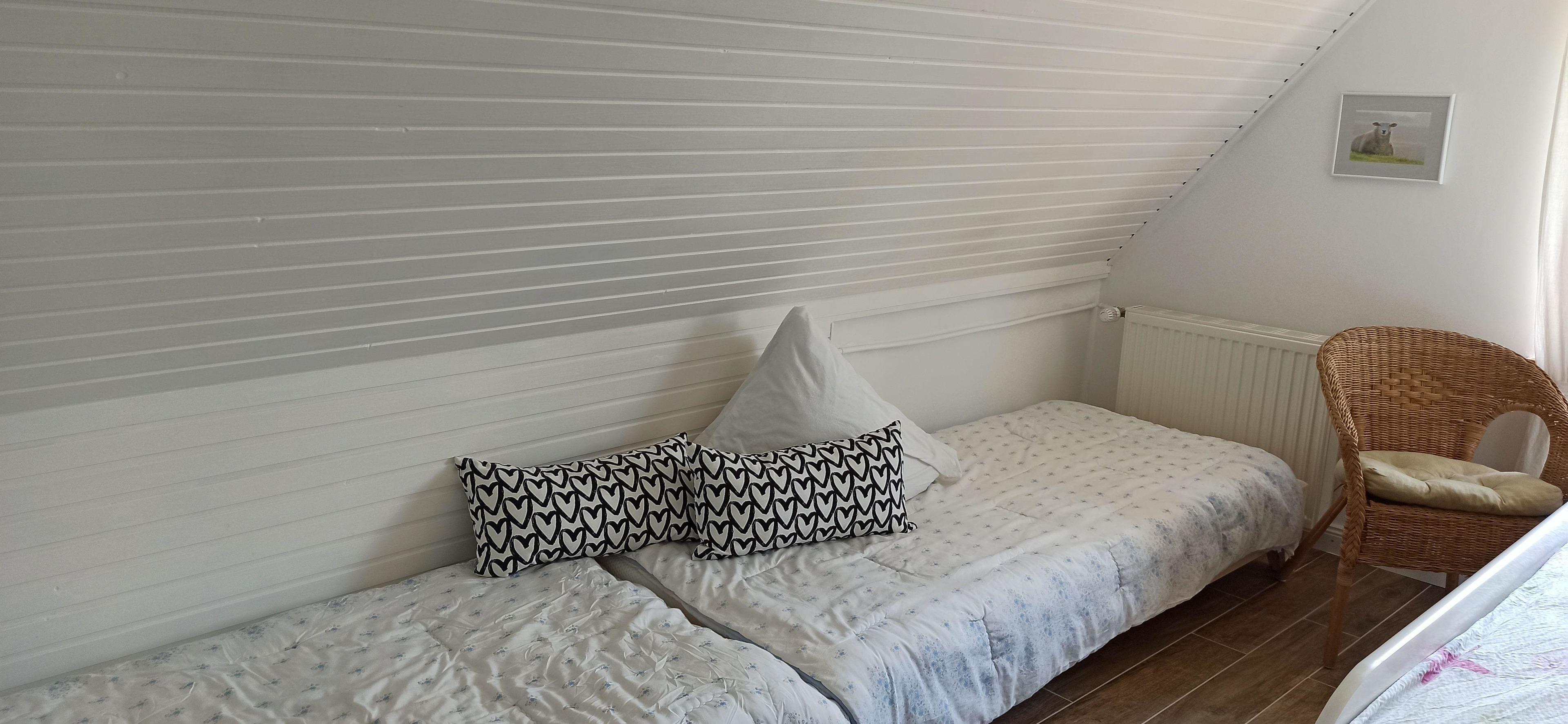 Im Schlafzimmer stehen neben dem Doppelbett zwei Einzelbetten. Hier schlafen alle im gemütlichen Schlafzimmer zusammen.