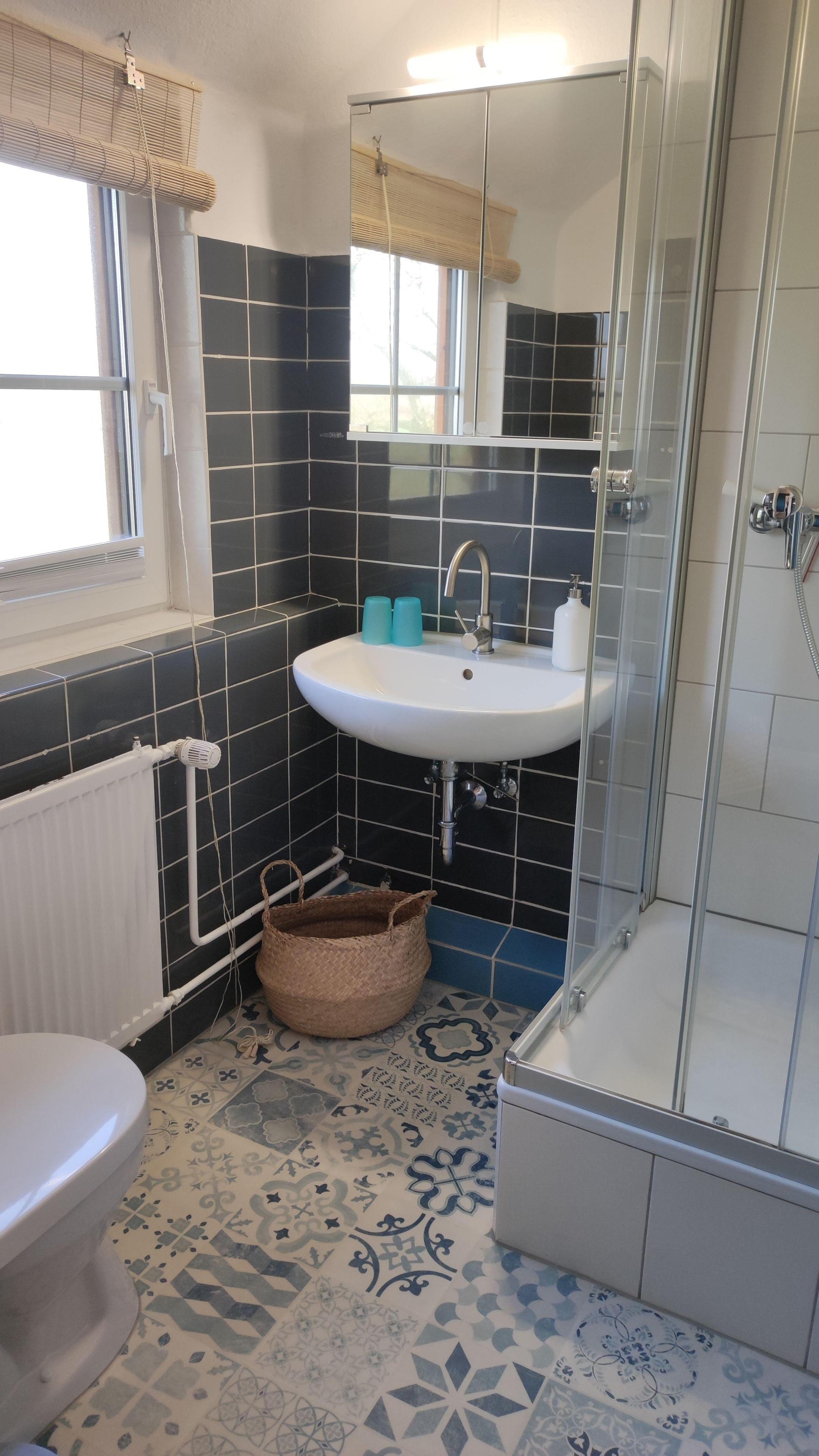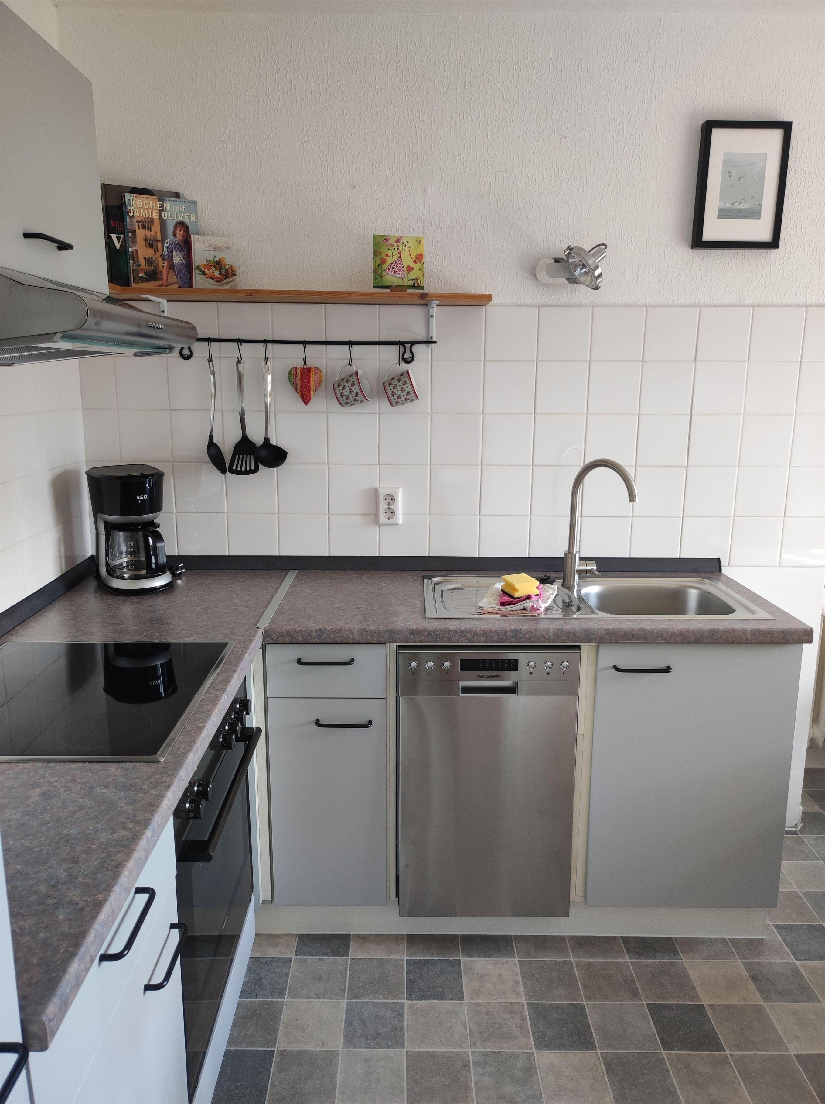 Die Wohnküche ist gut ausgestattet mit einer Spülmaschine, 4-Zonen Cerankochfeld und Backofen, Dunstabzugshaube, Kühlschrank mit Gefrierfach, Kaffeemaschine, Wasserkocher und ausreichend Geschirr, dass Sie nach Herzenslust kochen und backen können.