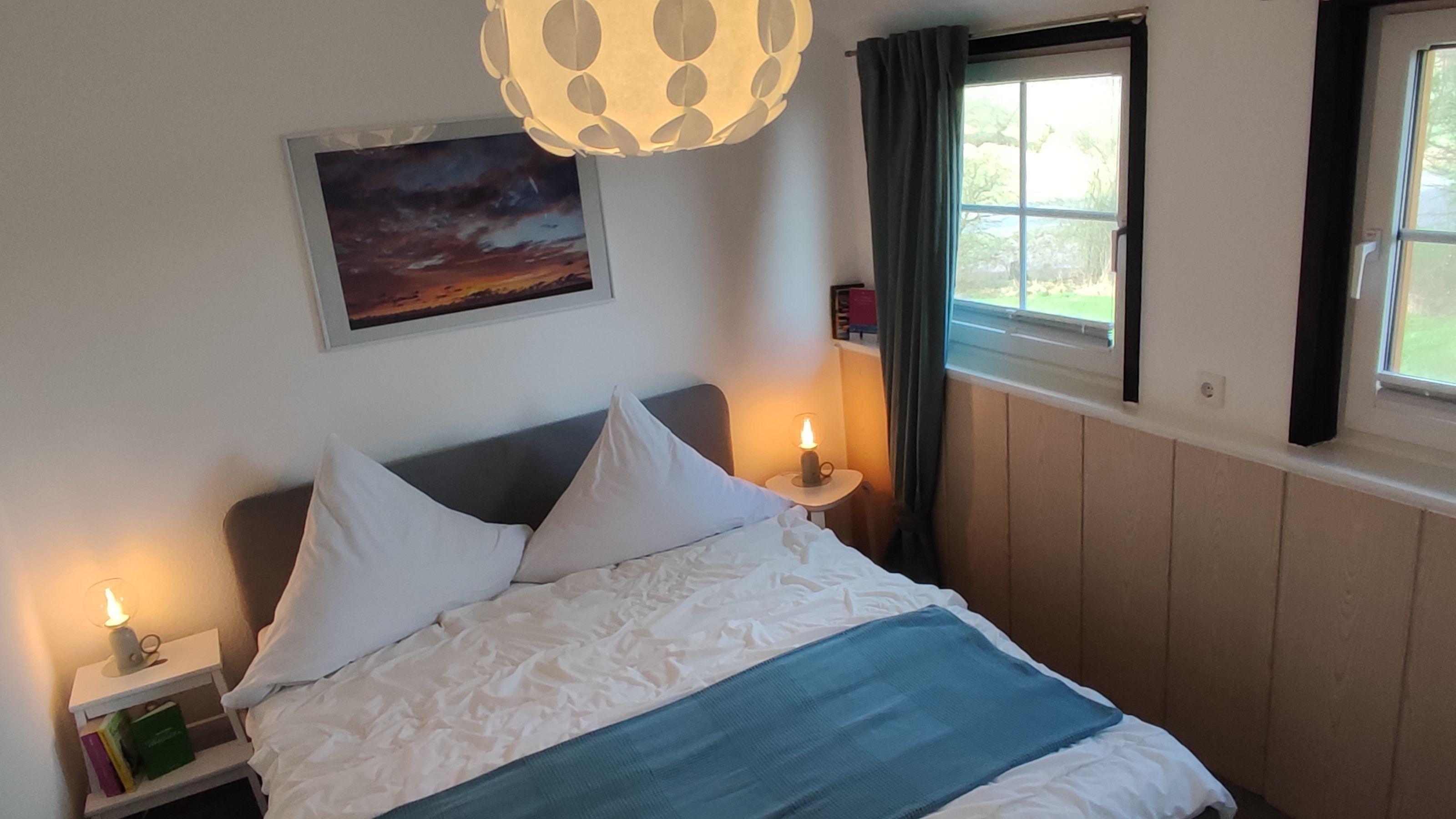 Über den Flur kommen Sie ins Schlafzimmer mit Doppelbett und Schiebe-Einbauschrank.