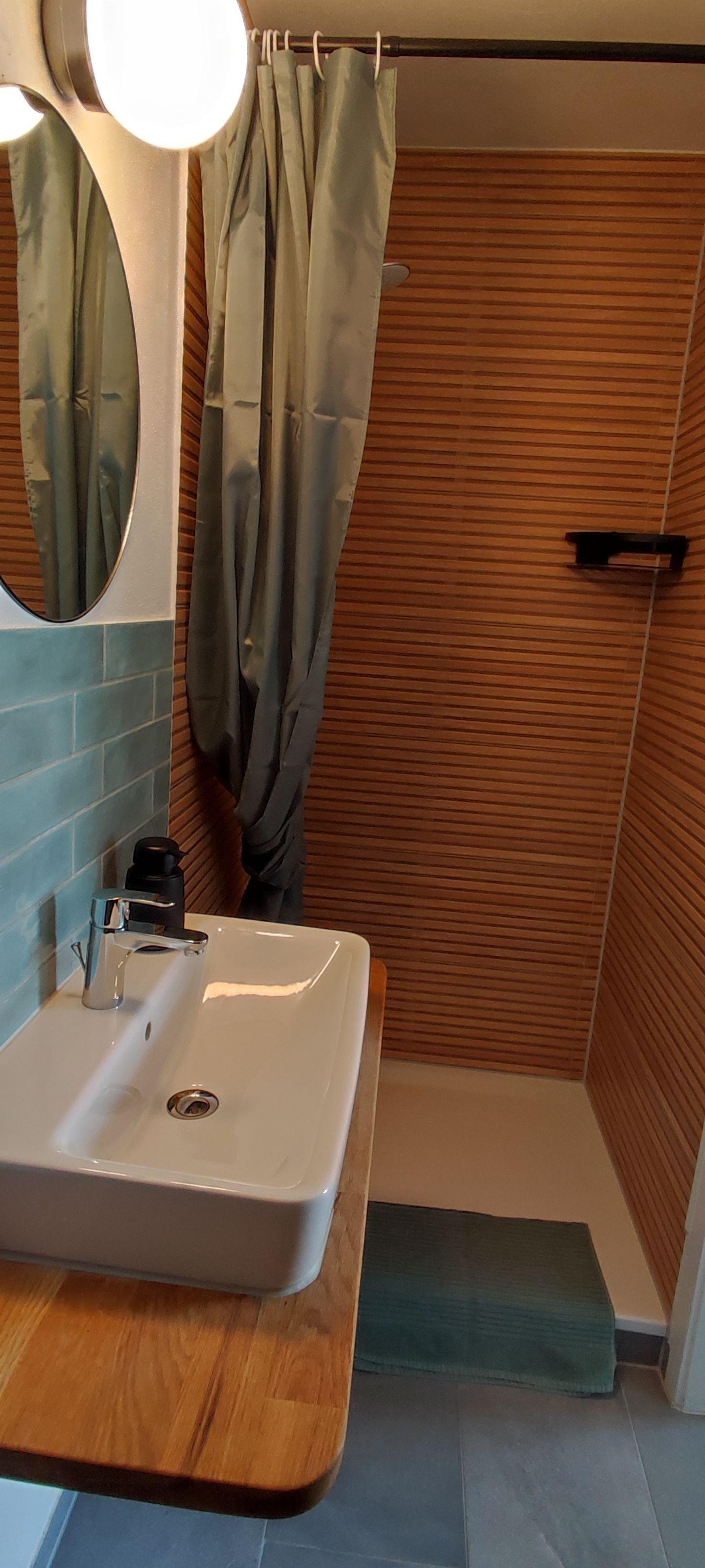 Über ein paar Stufen gelangt man in die Wohnküche und das daran angrenzende Duschbad. In der Wohnküche steht eine Sofaliege für eine dritte Person.