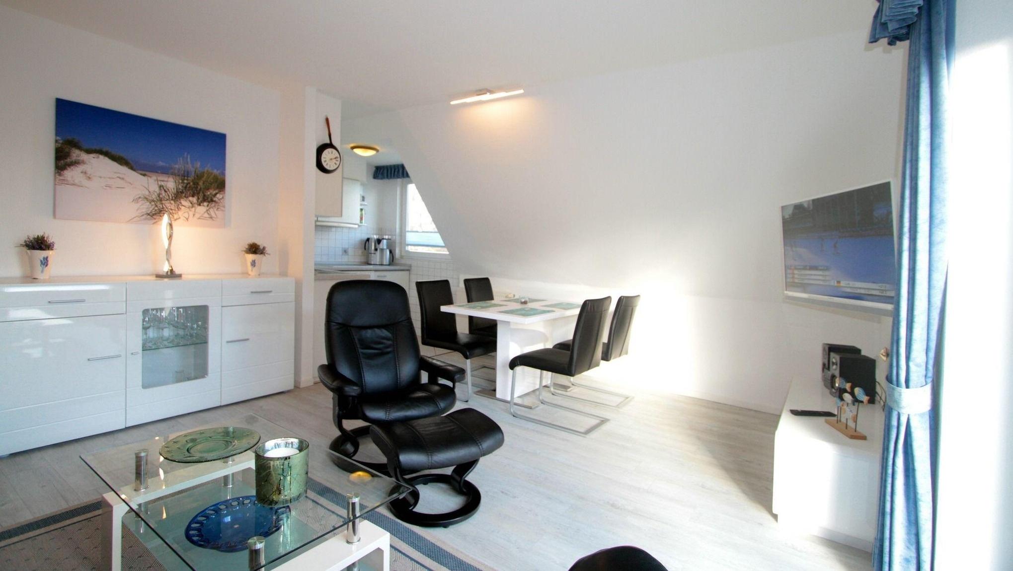 Genießen Sie Ihren Urlaub in der großen und komfortablen Ferienwohnung. Es erwartet Sie eine freundlich und komfortabel eingerichtete Unterkunft. Machen Sie es sich im Wohnzimmer schön gemütlich. Die bequem Sofagarnitur und der Essbereich laden zum klönen und schnacken ein. Ein Fernseher ist auch vorhanden. Die Küche ist in den Wohnbereich integriert. Die moderne Küchenausstattung macht Ihre Eigenversorgung kinderleicht. Spülmaschine, Wasserkocher, Eierkocher, Kaffeemaschine und viele andere Geräte stehen dort bereit.