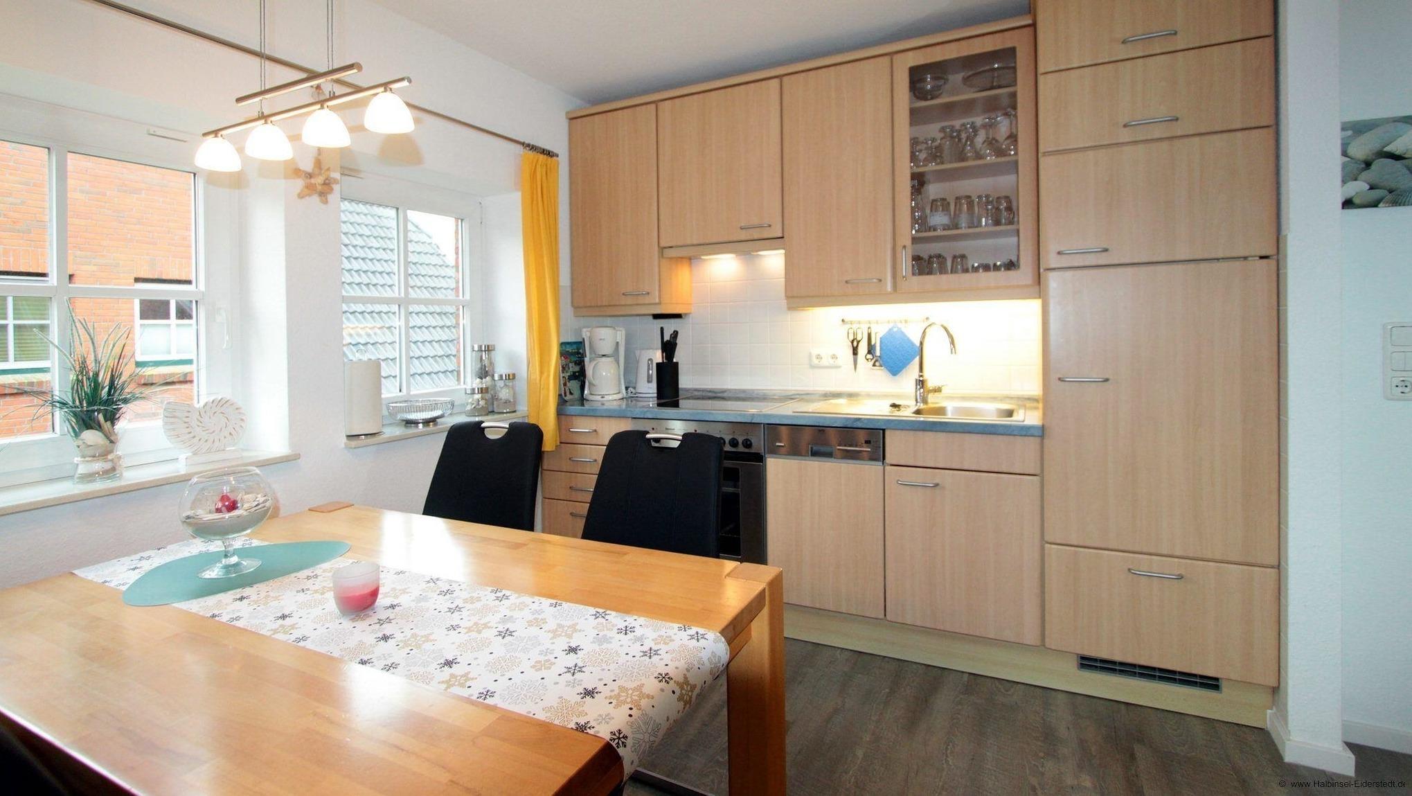 Ein Schlafzimmer ist mit einem Doppelbett einem großen Kleiderschrank eingerichtet. In dem zweiten Schlafraum stehen Ihnen zwei Einzelbetten, zwei schöne Rattern Sessel, ein Beistelltisch, sowie ein Fernseher zur Verfügung. Die sehr schöne Wohnküche ist mit allem Komfort ausgestattet. Einer herzhaften Götterspeise steht nichts im Wege.