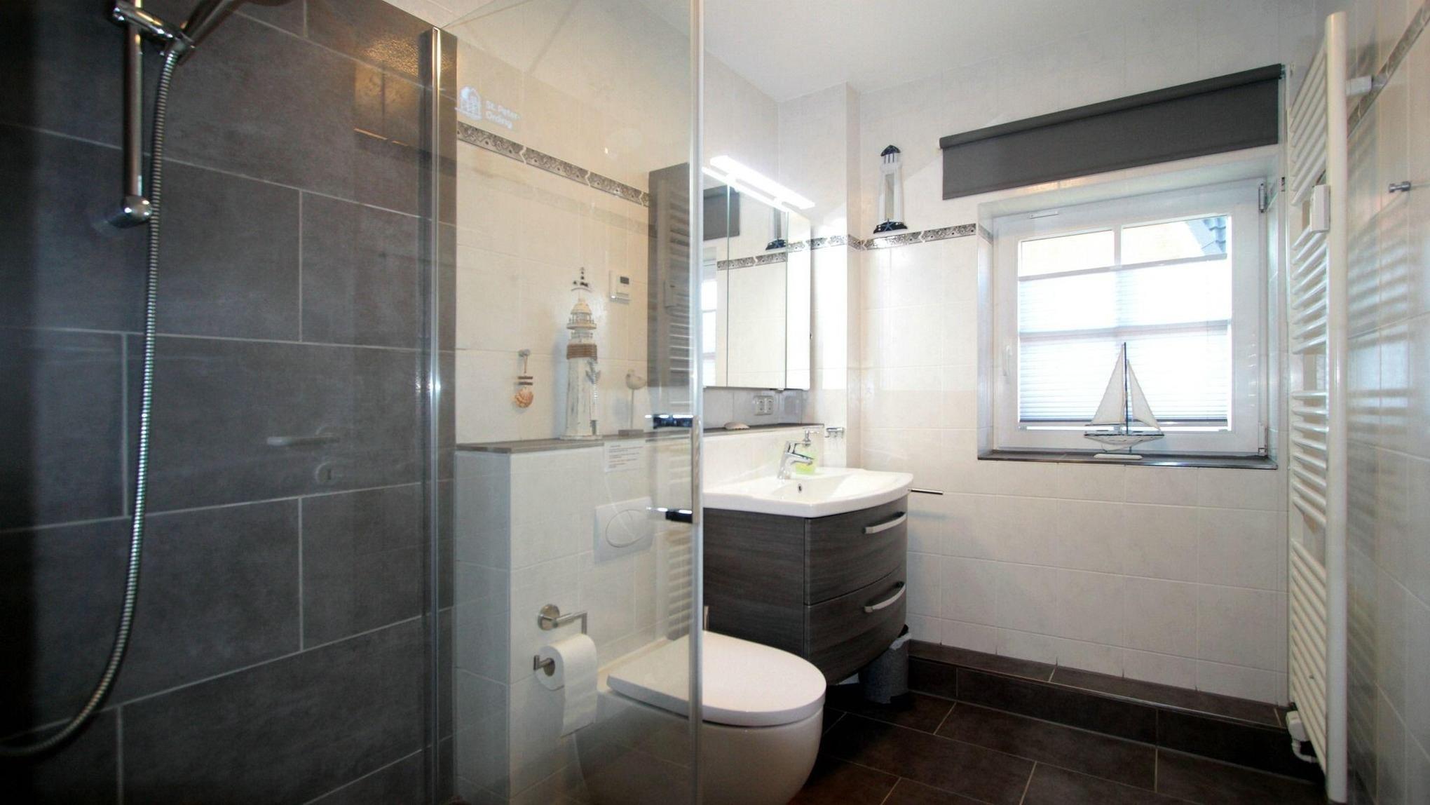 Das Duschbad mit Fenster ist großzügig eingerichtet. Es bietet genug Platz für Ihre Utensilien.