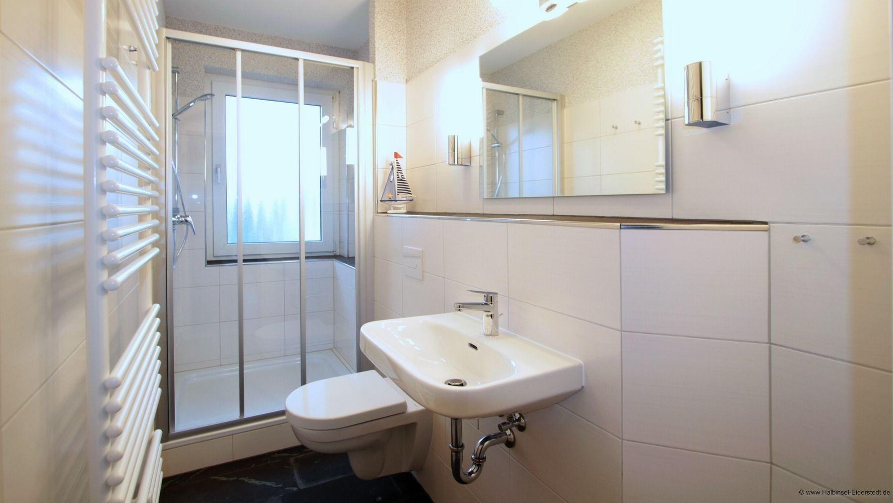 Das gepflegte Badezimmer ist mit Spiegelschrank, Dusche WC etc. eingerichtet.