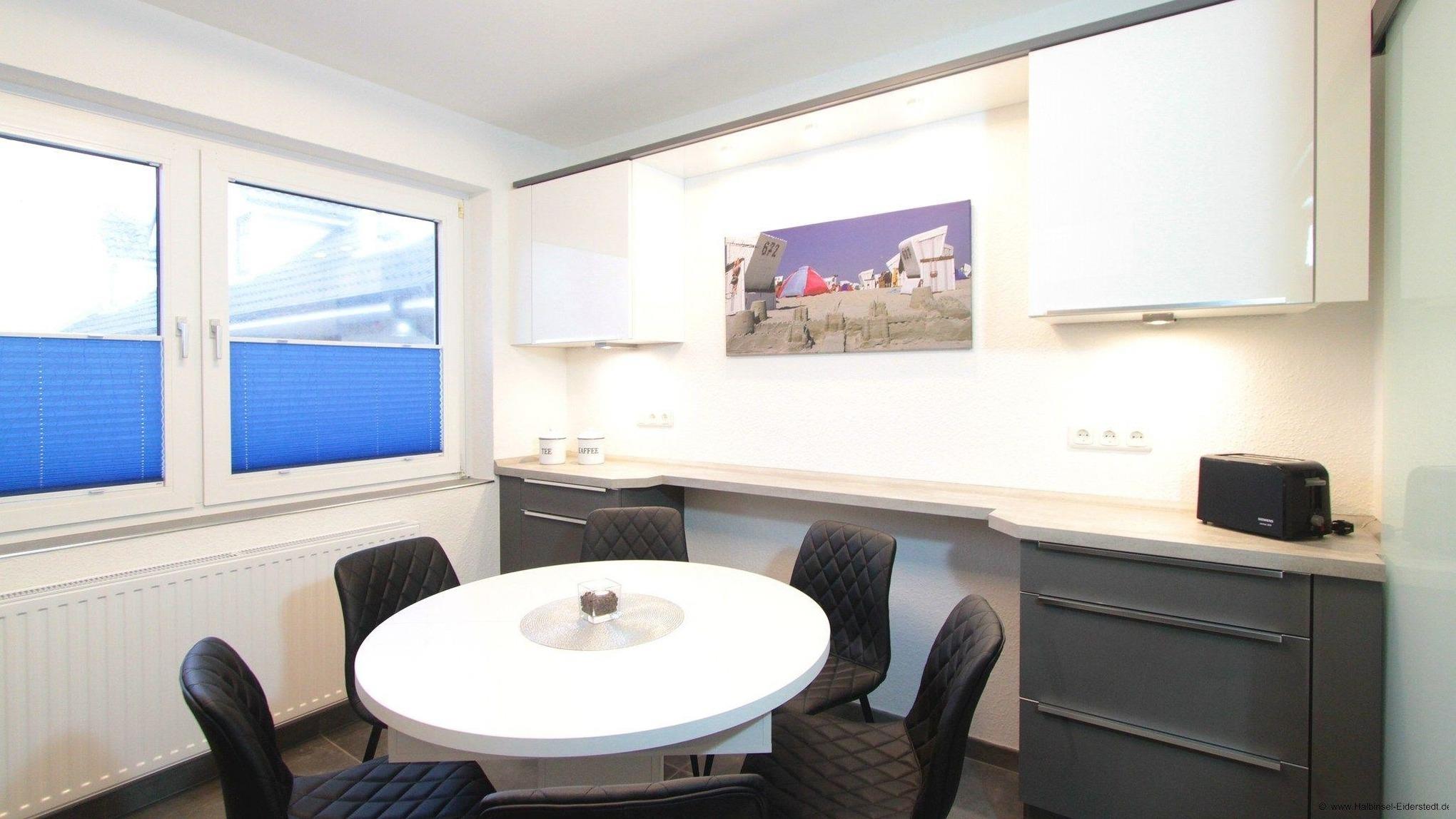 Die separate Küche ist sehr geräumig. Am Esstisch gibt es viel Platz für ausgiebige Mahlzeiten.