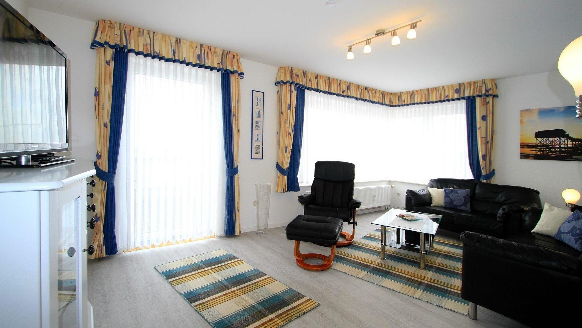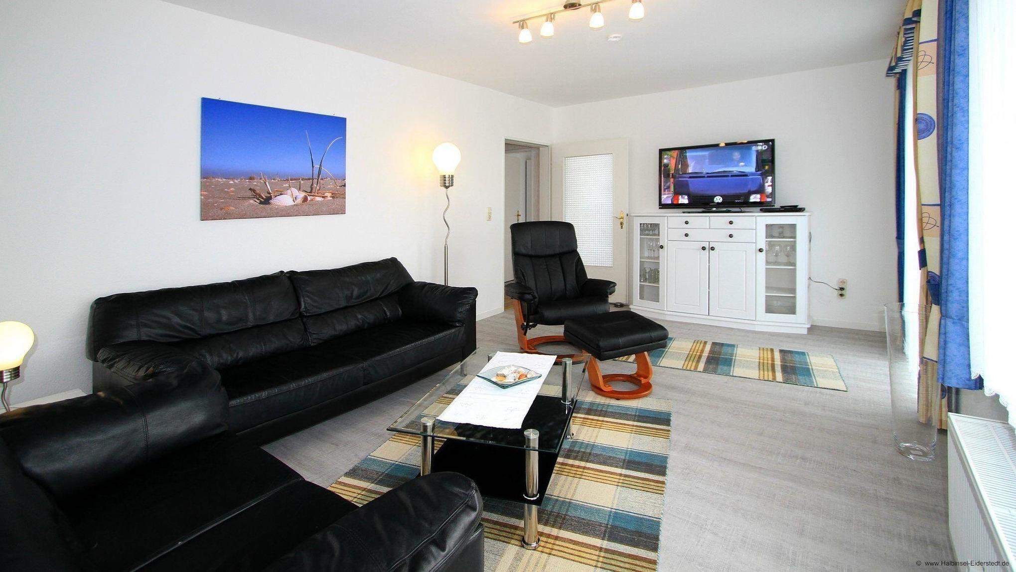 Das helle Wohnzimmer mit lederner Sitzgarnitur und TV-Gerät lädt zum abendlichen klönen ein. Die schönen Vorhänge und Leuchten machen den Raum sehr wohnlich.