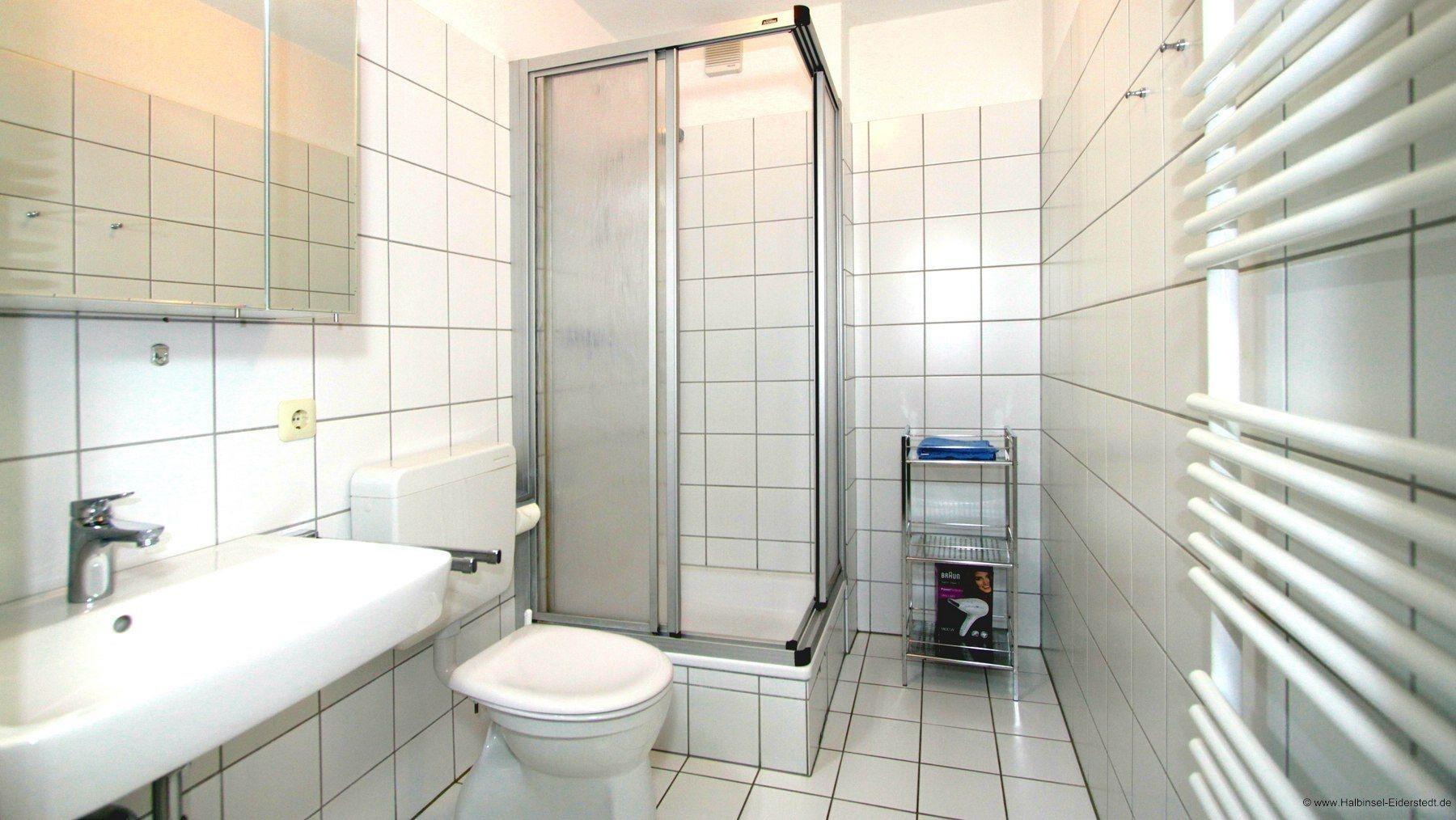 Im Badezimmer mit weißen Kacheln und Fliesen können Sie sich in Ruhe erfrischen. Spiegel Ablageflächen und Dusche sind dort vorhanden.