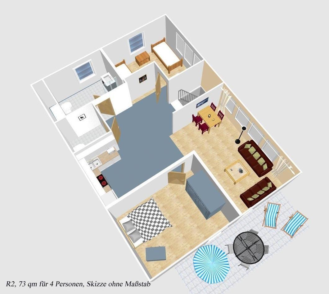 Ihr gemütliches Ferienhaus verfügt über 2 geräumige Schlafzimmer.Im großzügigen kombinierten Wohn- und Küchenbereich bereiten Sie Köstlichkeiten zu oder machen es sich einfach gemütlich. Starten Sie entspannt in den Tag im schönen Badezimmer, ein Gäste WC erhöht Ihren Wohnkomfort.Ihr sonniger Süd-Balkon mit Strandkorb und Gartenmöbeln, lädt zum entspannen ein.