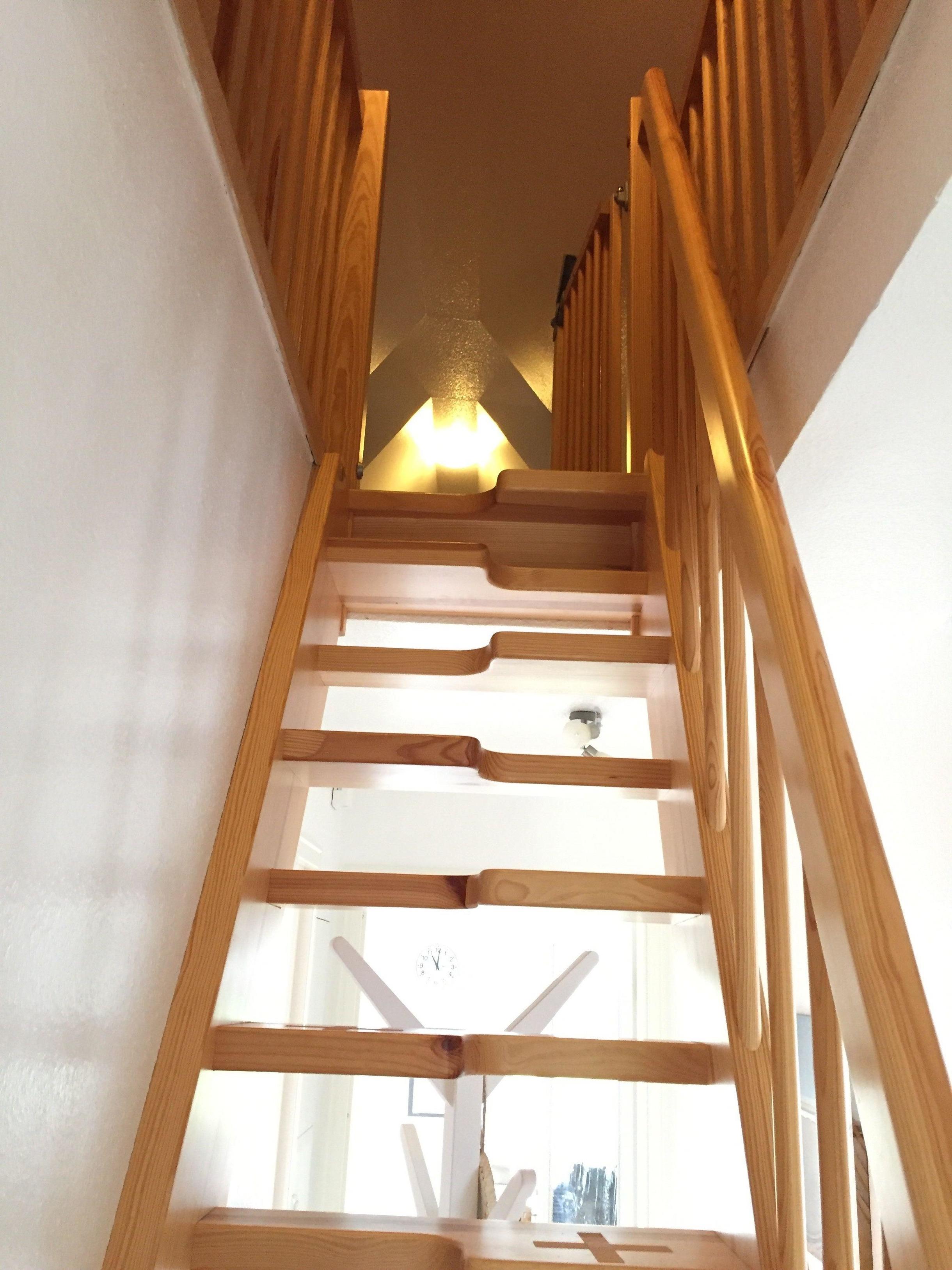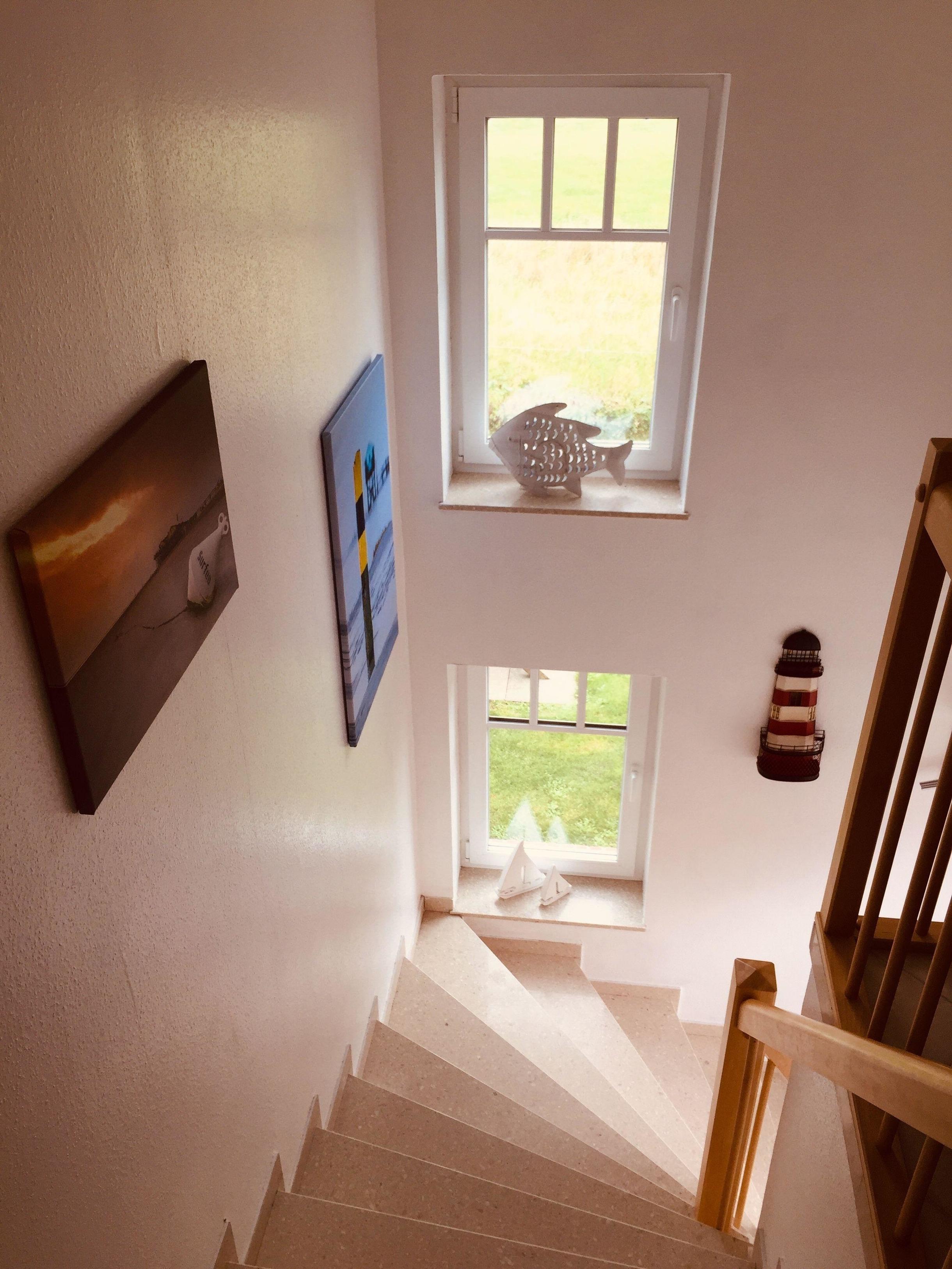 Obergeschoß, ca 50 qm Wohnfläche sowie ein Spitzboden, aufgeteilt in drei Zimmer (incl. Spitzboden) Wohn-Esszimmer mit offener Küche. Ausgang auf einen großen Ost-Süd-Westbalkon, ausgestattet mit Gartenmöbeln, Sonnenschirm sowie Strandkorb. Schlafzimmer mit einem großen Boxspringbett, im Spitzboden zwei Betten & Sitzgelegenheit, Duschbad/WC, separates WC, Abstellraum.