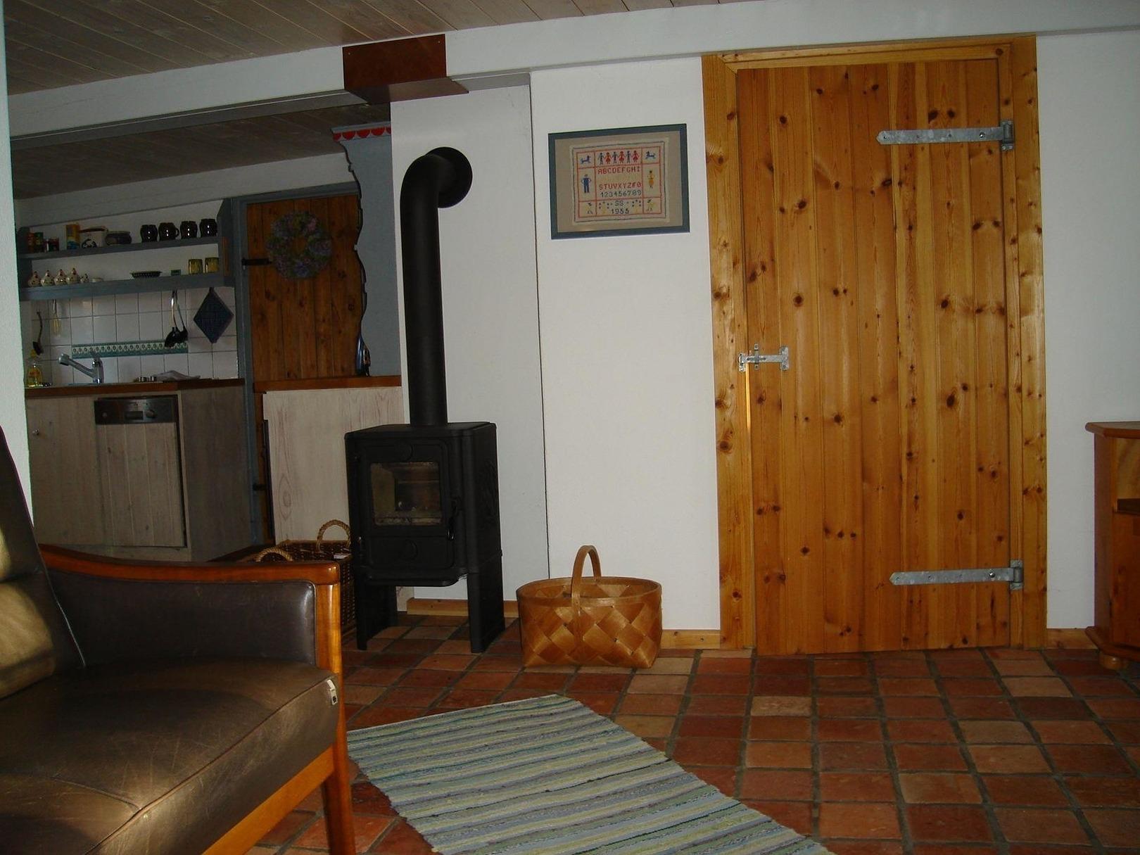 Vom Flur gelangen Sie in den offenen, sehr gemütlichen Wohnbereich mit Küche, gemütlicher Essecke, Geschirrspüler, Kaminofen etc. Unten befinden sich zwei Schlafstuben mit je einem Bett (eine Schlafstube mit direktem Zugang zum Garten) und oben unter dem Dach ist der Schlafraum mit Doppelbett und großem Einbauschrank. Im Treppenhaus oben befindet sich ein weiterer großer Einbauschrank. Außerdem haben wir oben einen großen Abstellraum für Ihre Koffer etc. Zwei Duschbäder, davon eines mit Waschmaschine, stehen für Sie bereit. - Für Ihre Fahrräder haben wir einen separaten geräumigen abschließbaren Schuppen und für Ihr Auto steht ein Carport bereit.