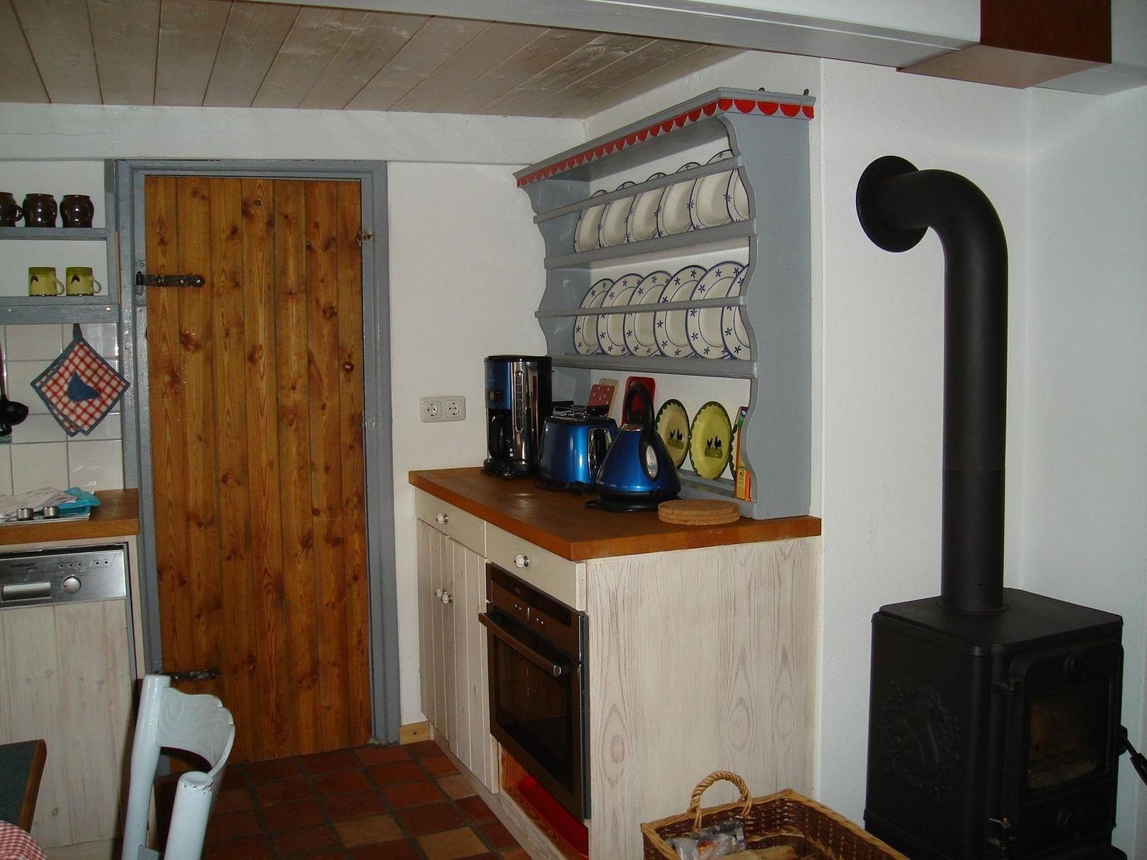 Cerankochfeld, Backofen, Geschirrspüler in der Küche. Kühl/Gefrierschrank in der Speisekammer.