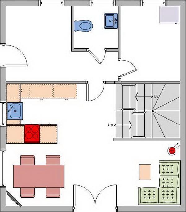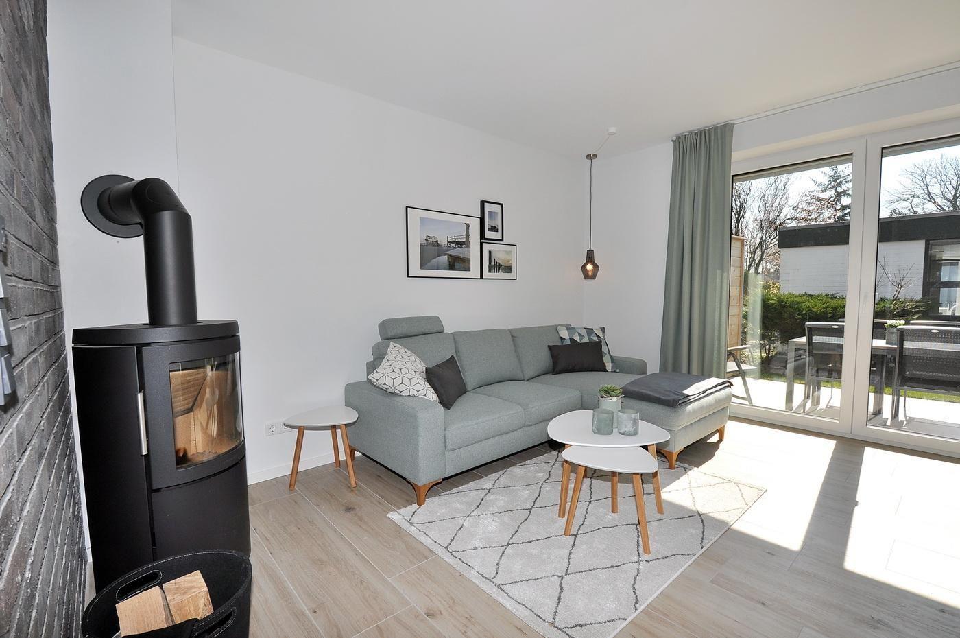Erdgeschoss: Eingangsbereich, Wohnraum mit offener Küche, Essbereich, Kamin und Zugang zur Terrasse, ein Gäste-WC, ein Hauswirtschaftsraum