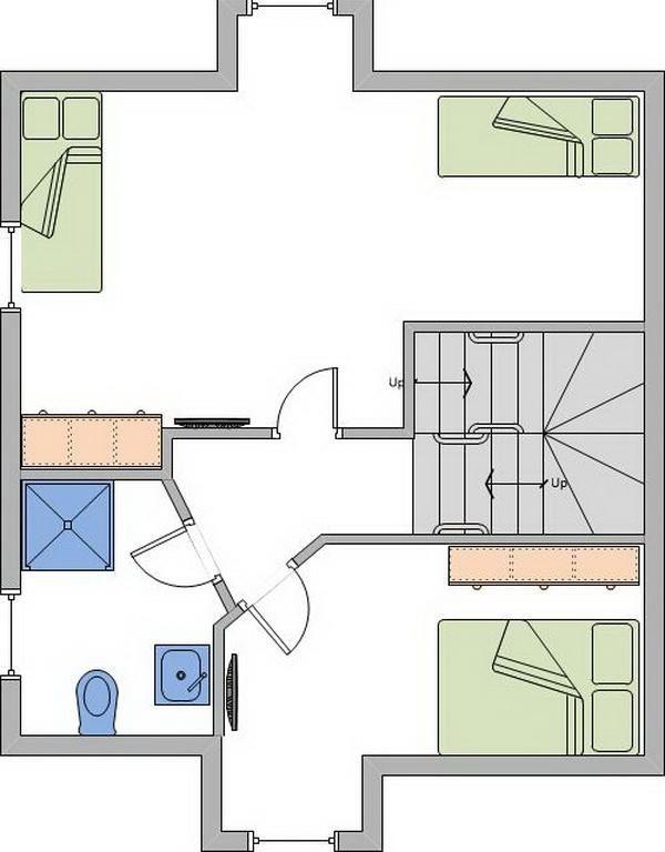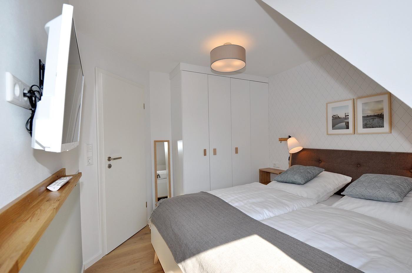 Obergeschoss: ein Schlafzimmer mit Doppelbett (180 x 200 cm - Einzelmatratzen) und TV, ein Schlafzimmer mit 2 Einzelbetten (90 x 190 cm) und TV, ein Duschbad/ WC