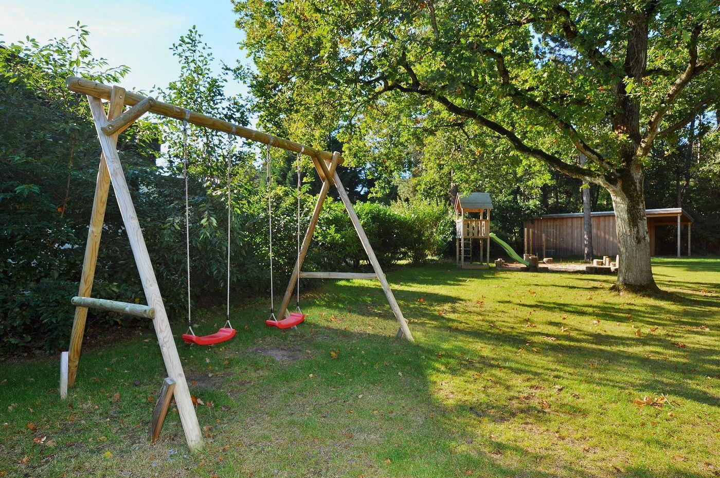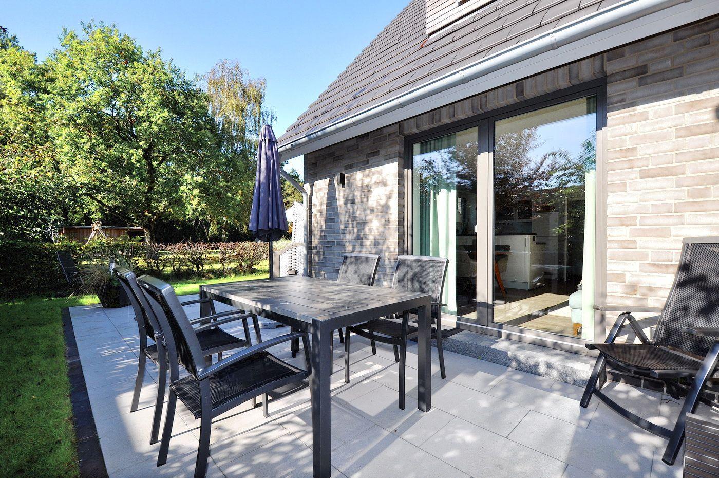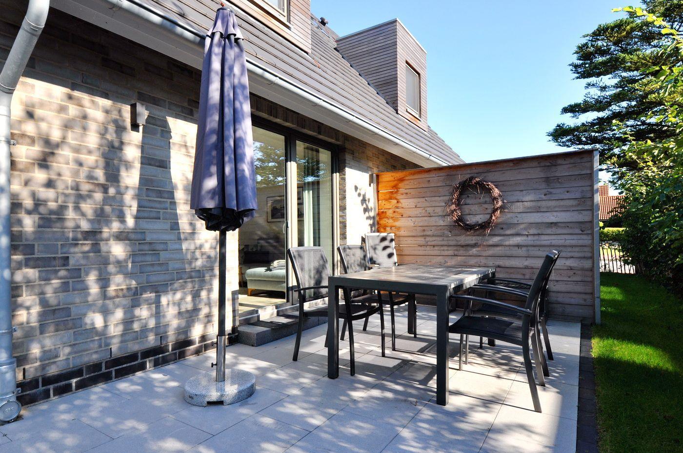 Auf der Terrasse befinden sich Gartenmöbel und ein Strandkorb, zudem gibt es einen kleinen Gemeinschaftsspielplatz im Außenbereich.