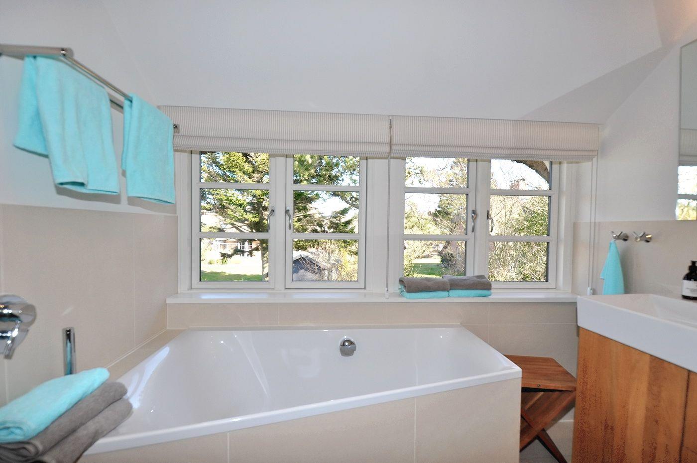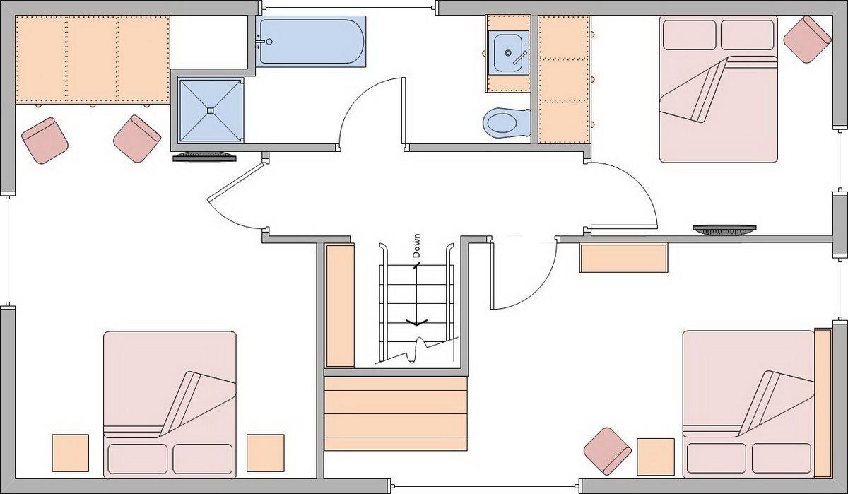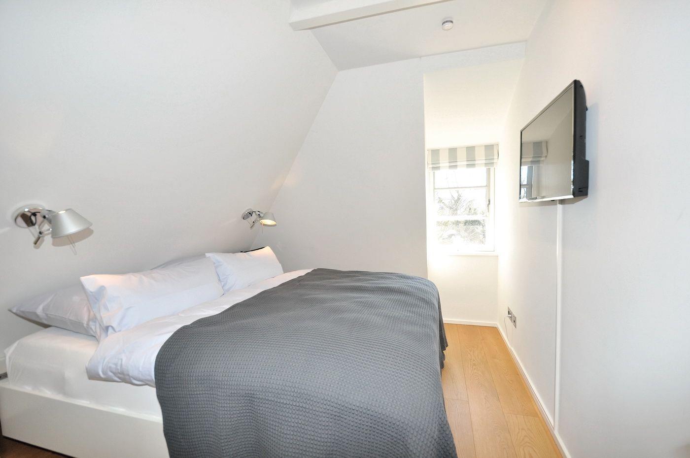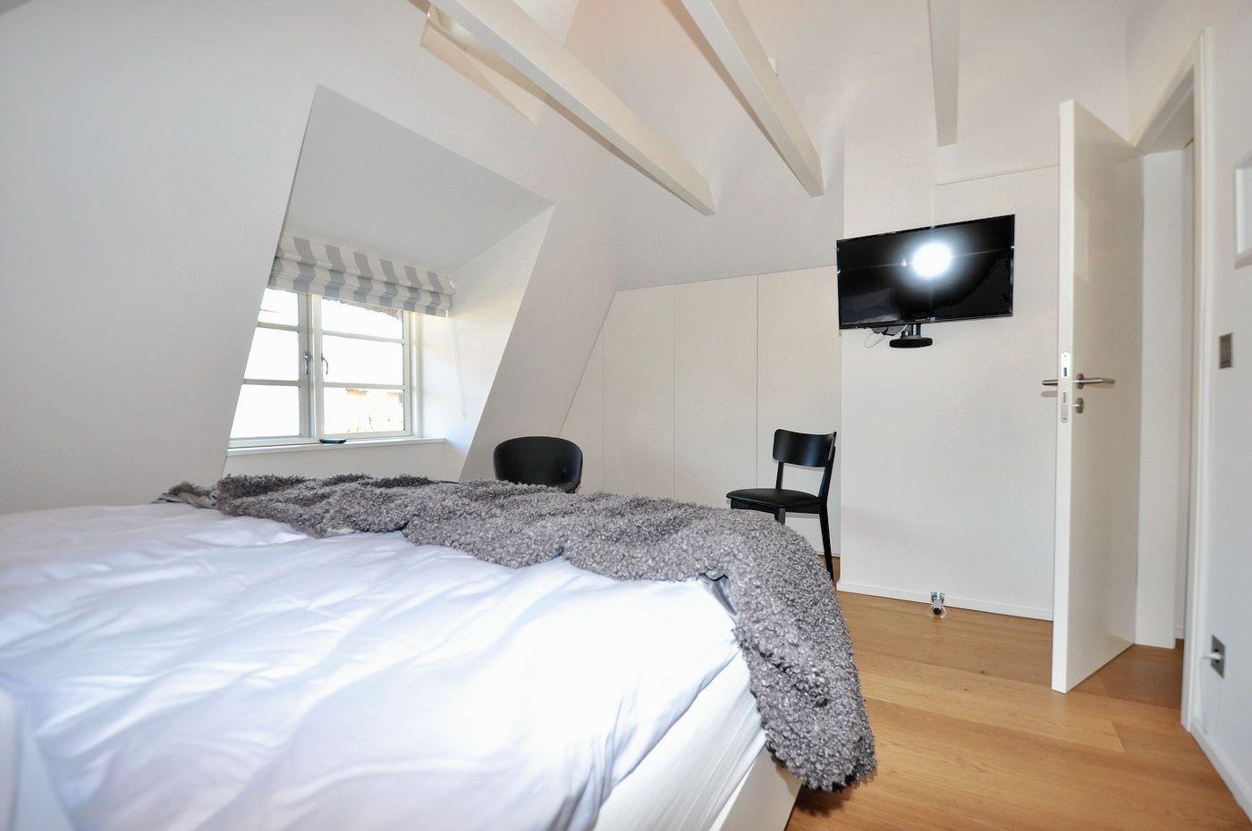 Obergeschoss: ein Schlafzimmer mit Doppelbett (180 x 200 cm) und TV, ein Schlafzimmer mit Doppelbett (160 x 200 cm) und TV, ein Schlafzimmer mit Doppelbett (180 x 200 cm - Einzelbetten), ein Wannenbad/ WC mit separater Dusche