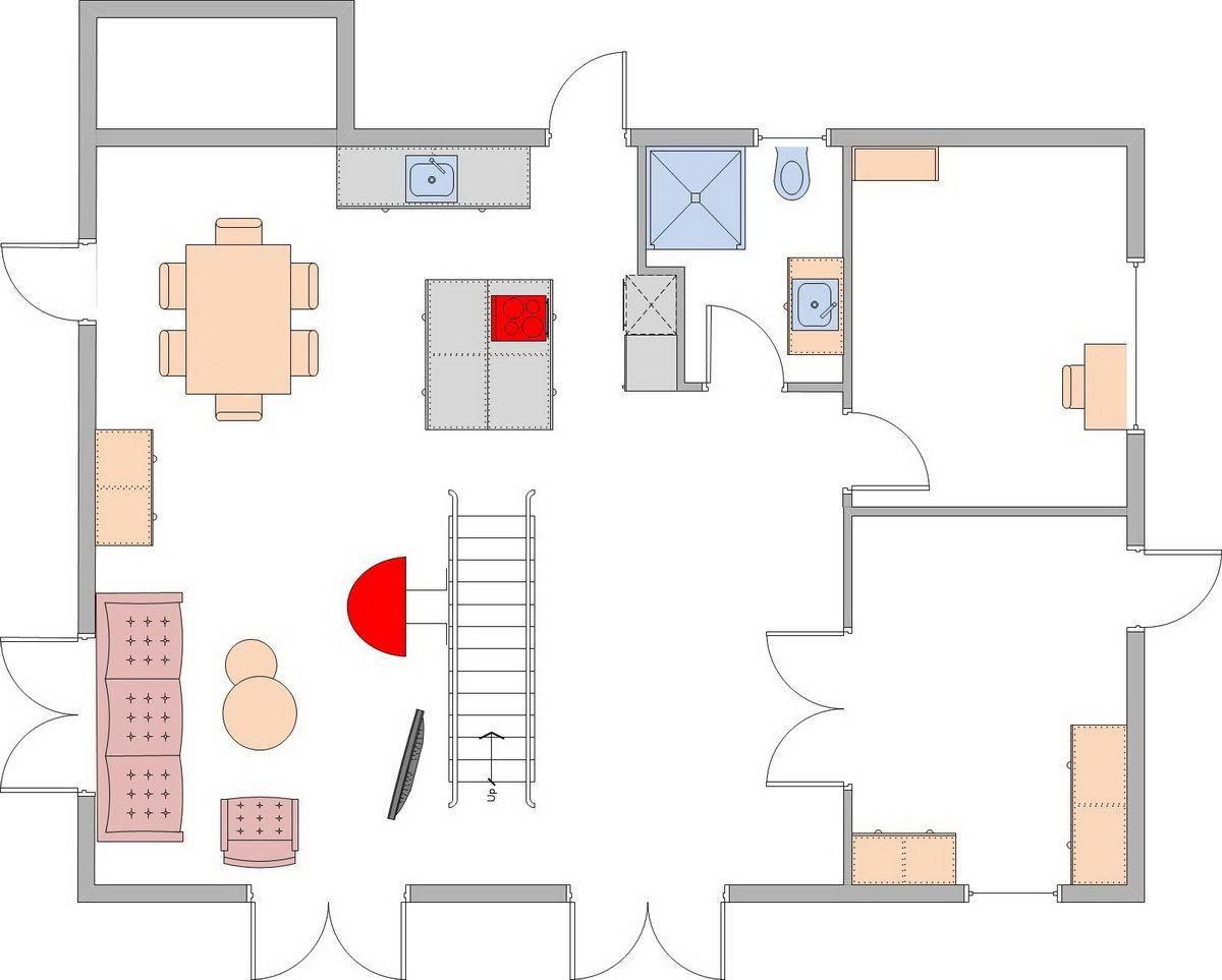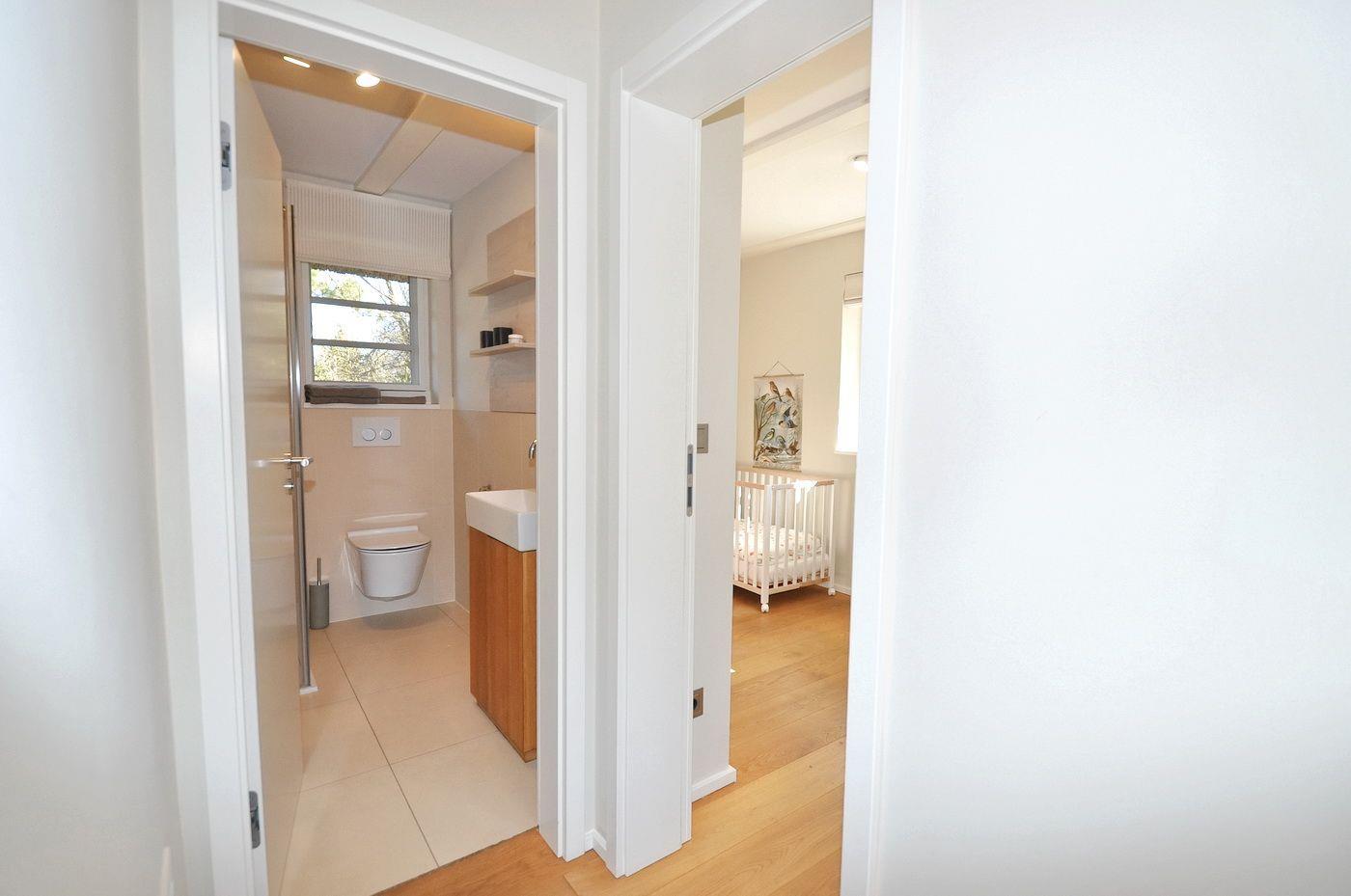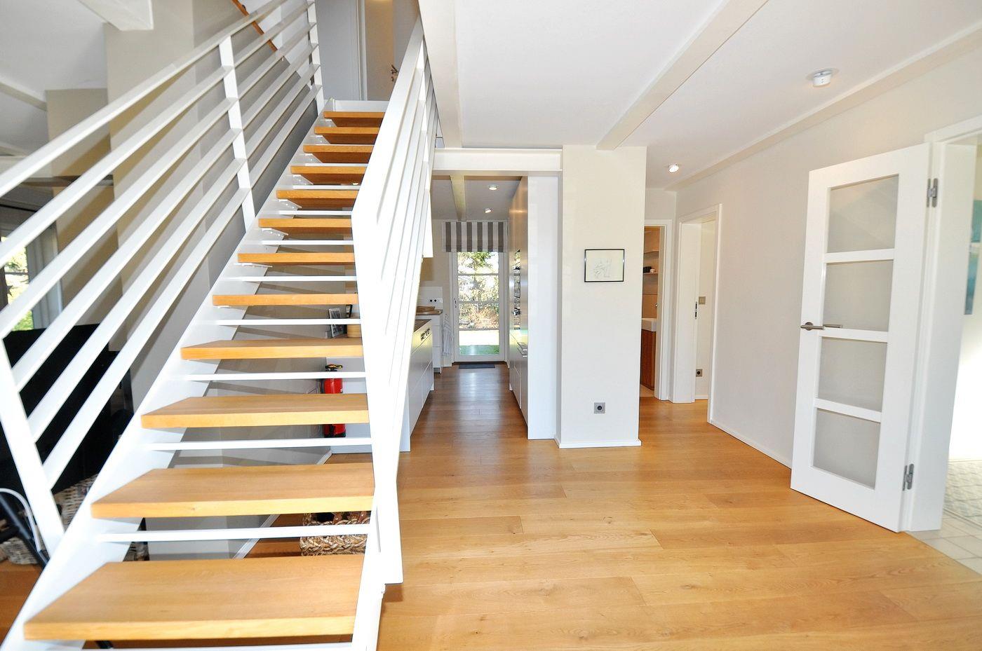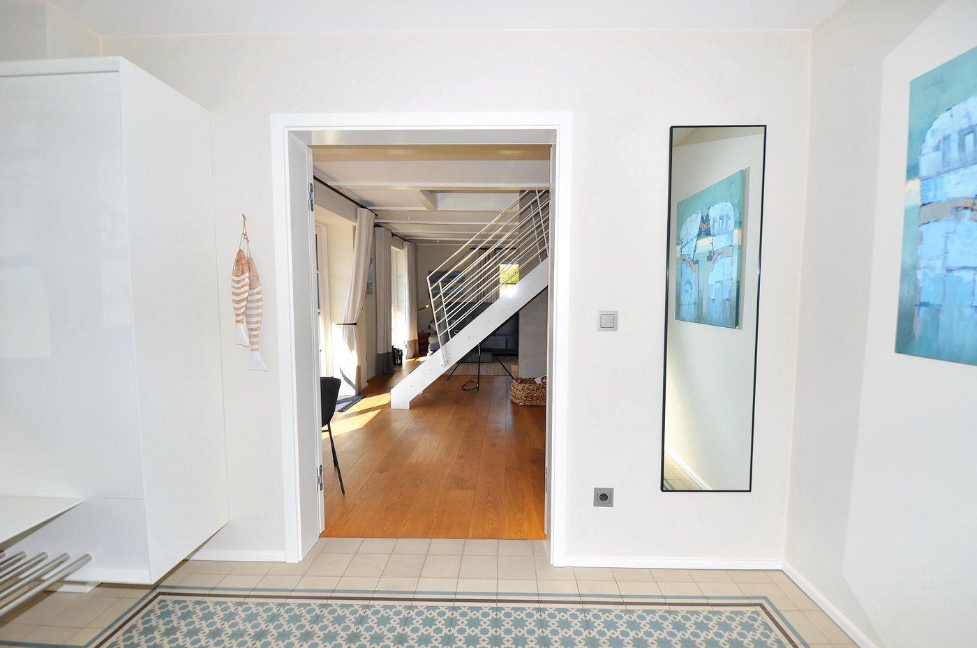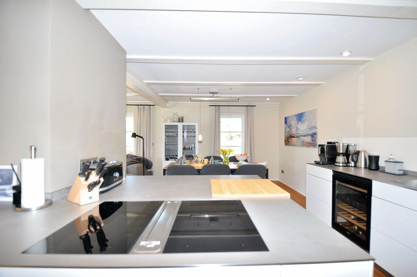 Erdgeschoss: Eingangsbereich, Wohnraum mit integrierter Bulthaup-Küche und Kochinsel, Essbereich, Kamin und Zugang zur Terrasse, ein Duschbad/ WC, ein Arbeitszimmer
