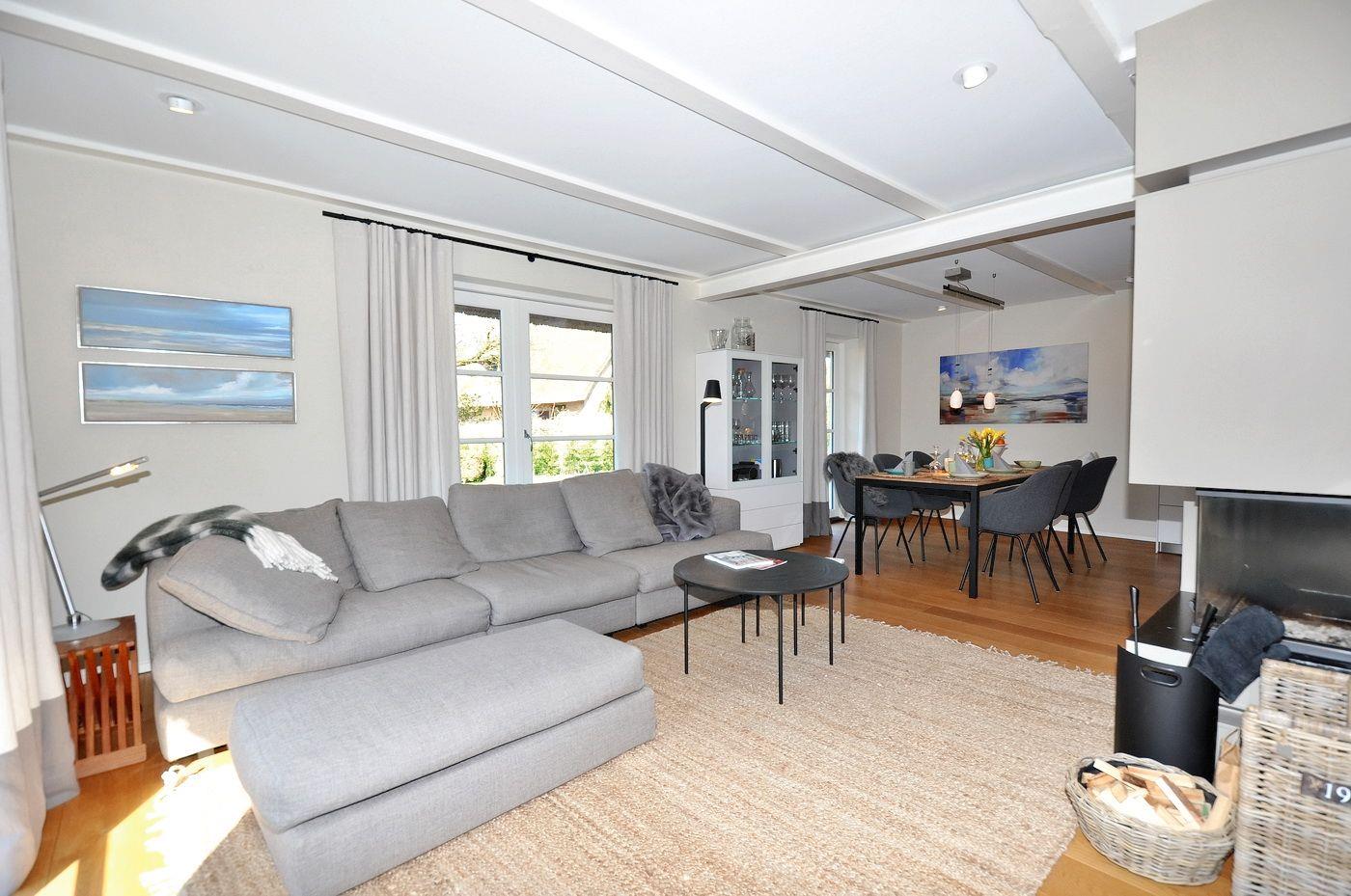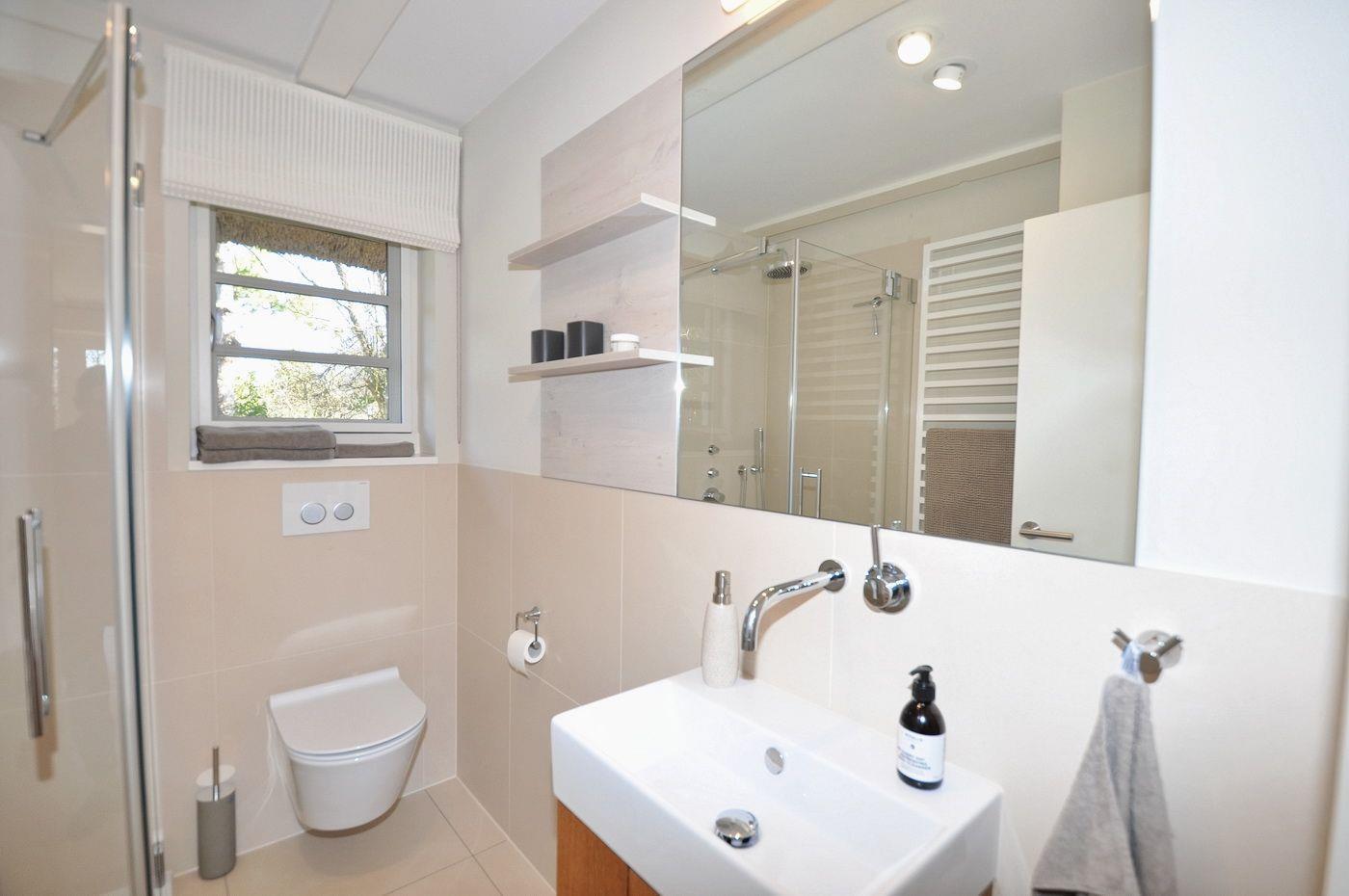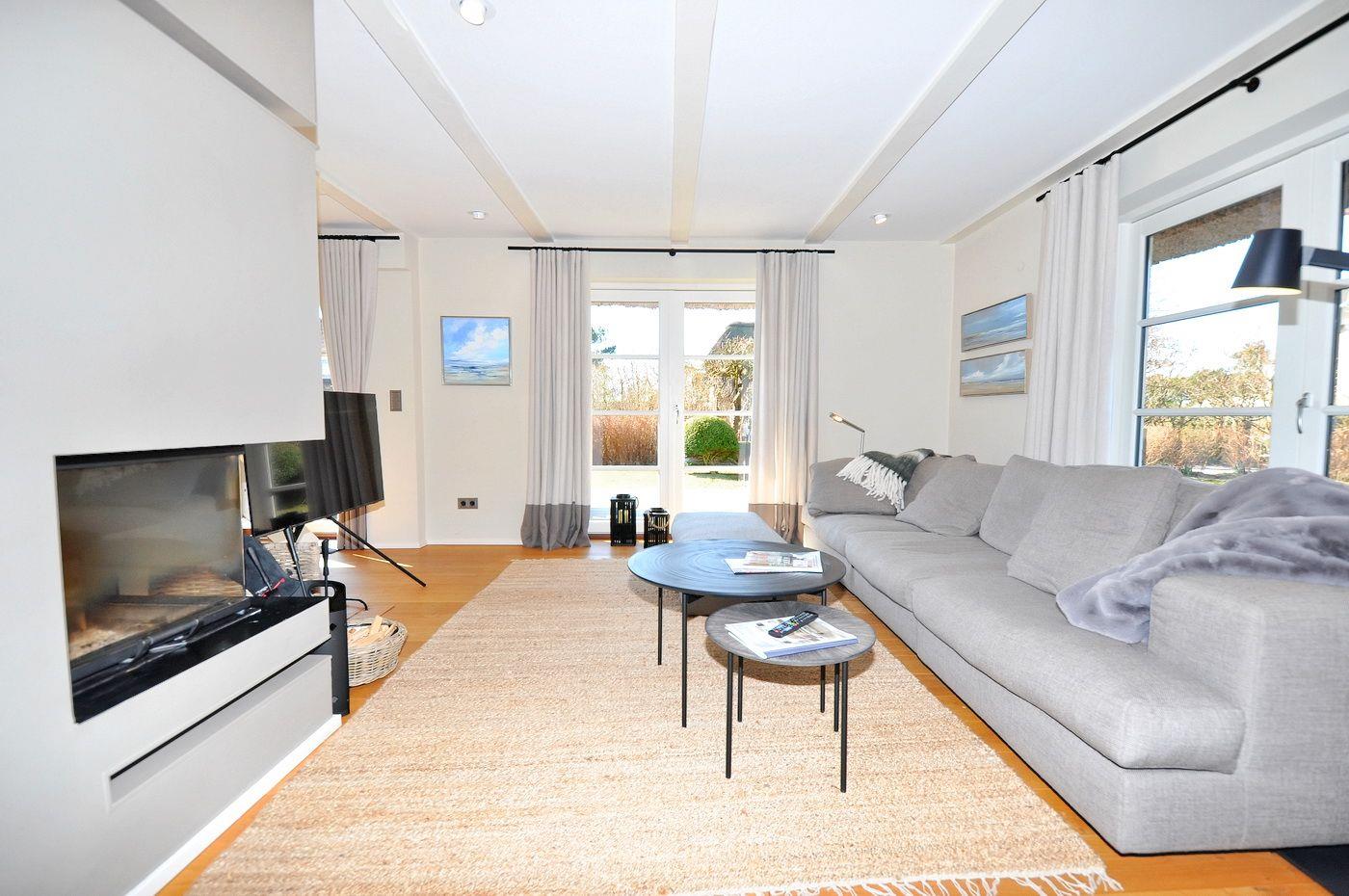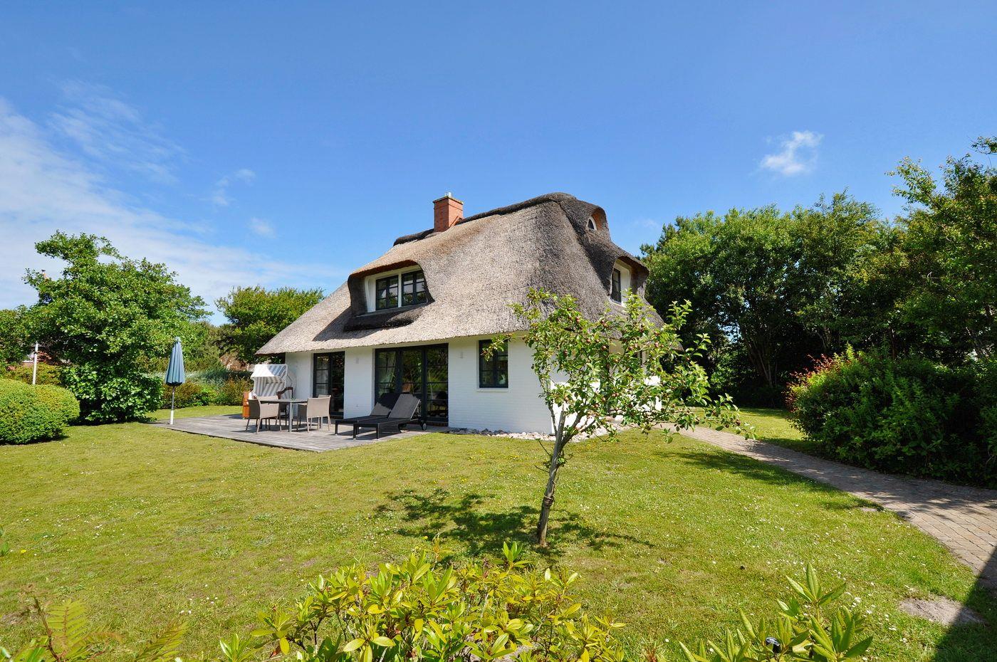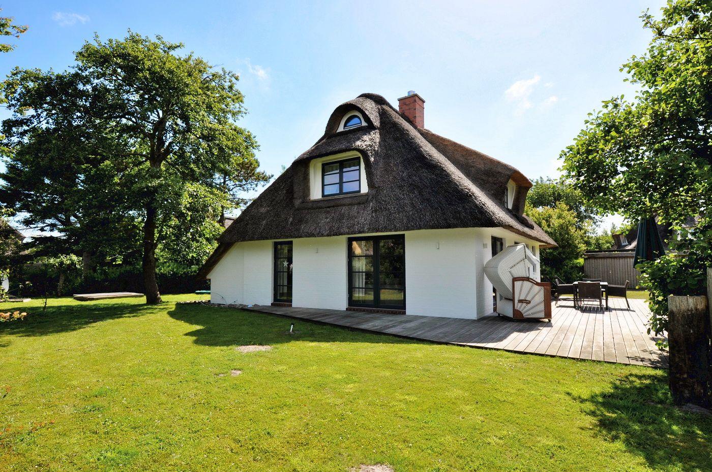 Modernes Reetdachhaus mit Sauna und Garten in ruhiger Lage nahe Strand und Dorfzentrum.