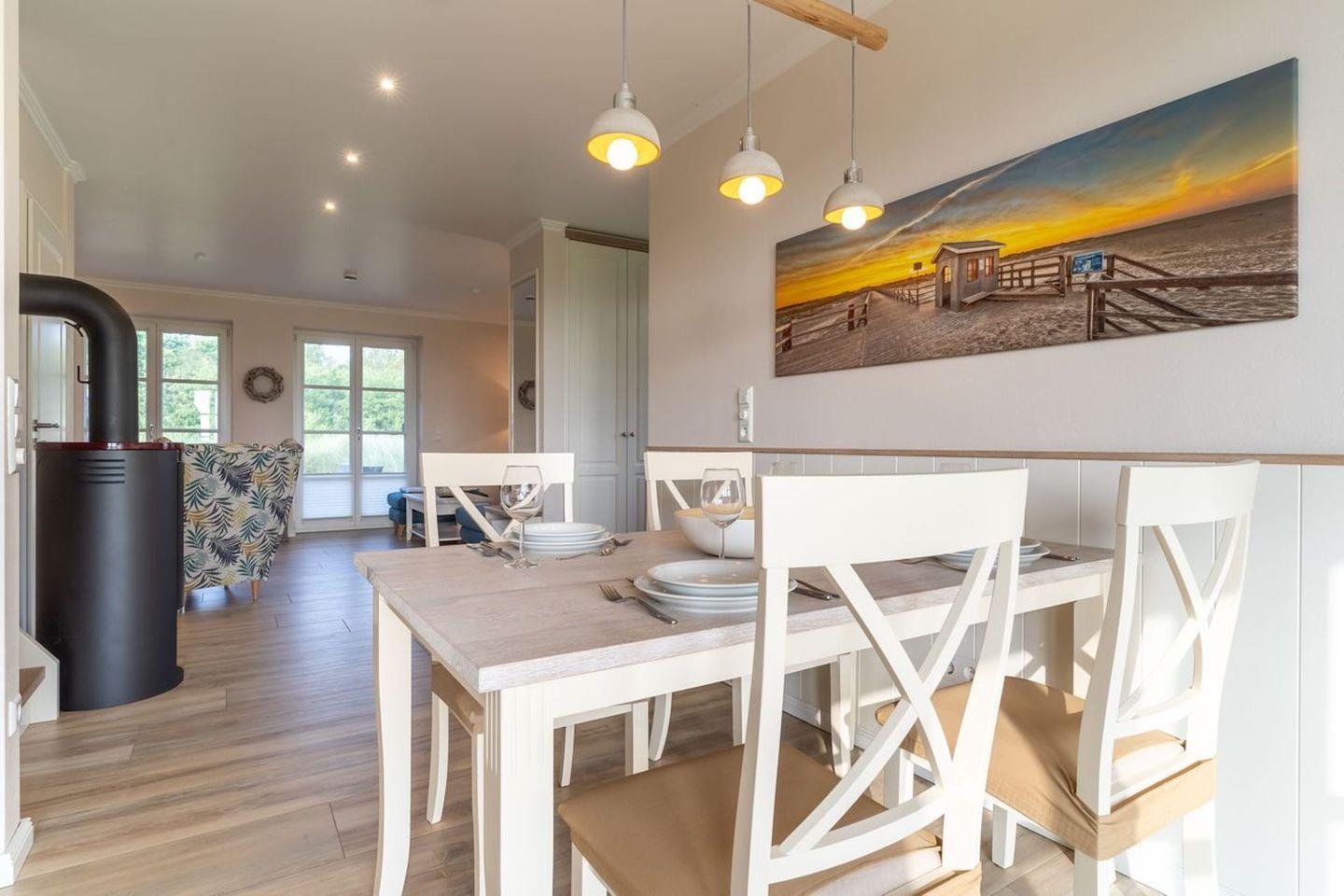 Im Erdgeschoss befindet sich der lichtdurchflutete Wohnraum mit TV, Kamin, einer offenen Küche sowie einem stilvollen Essbereich.