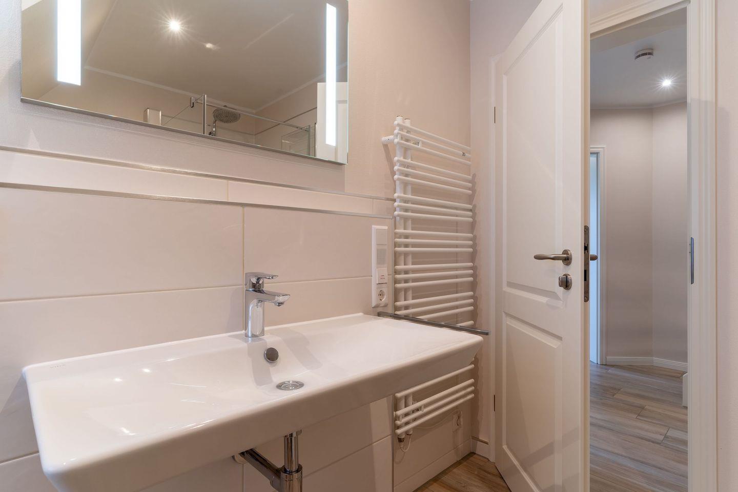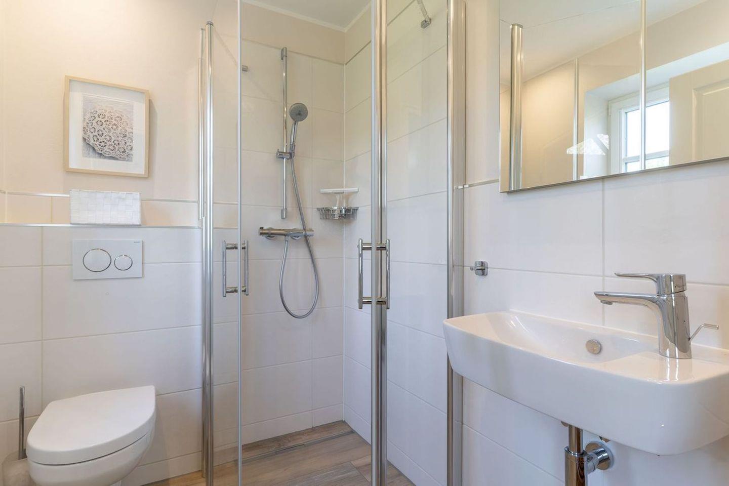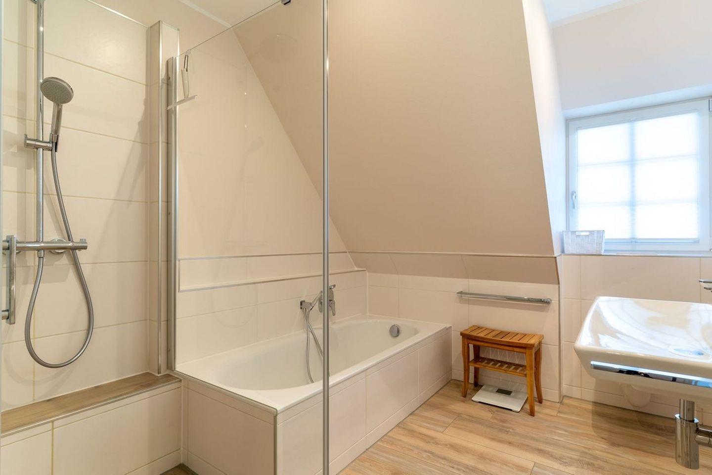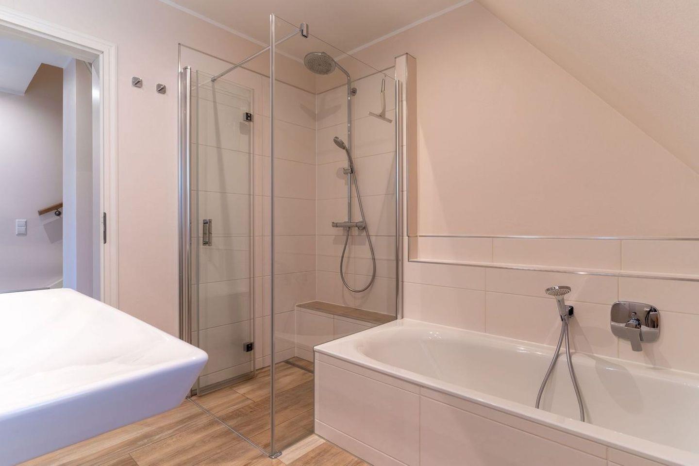 Darüber hinaus befindet sich im Obergeschoss ein weiteres, geräumiges Bad mit Dusche und Badewanne.