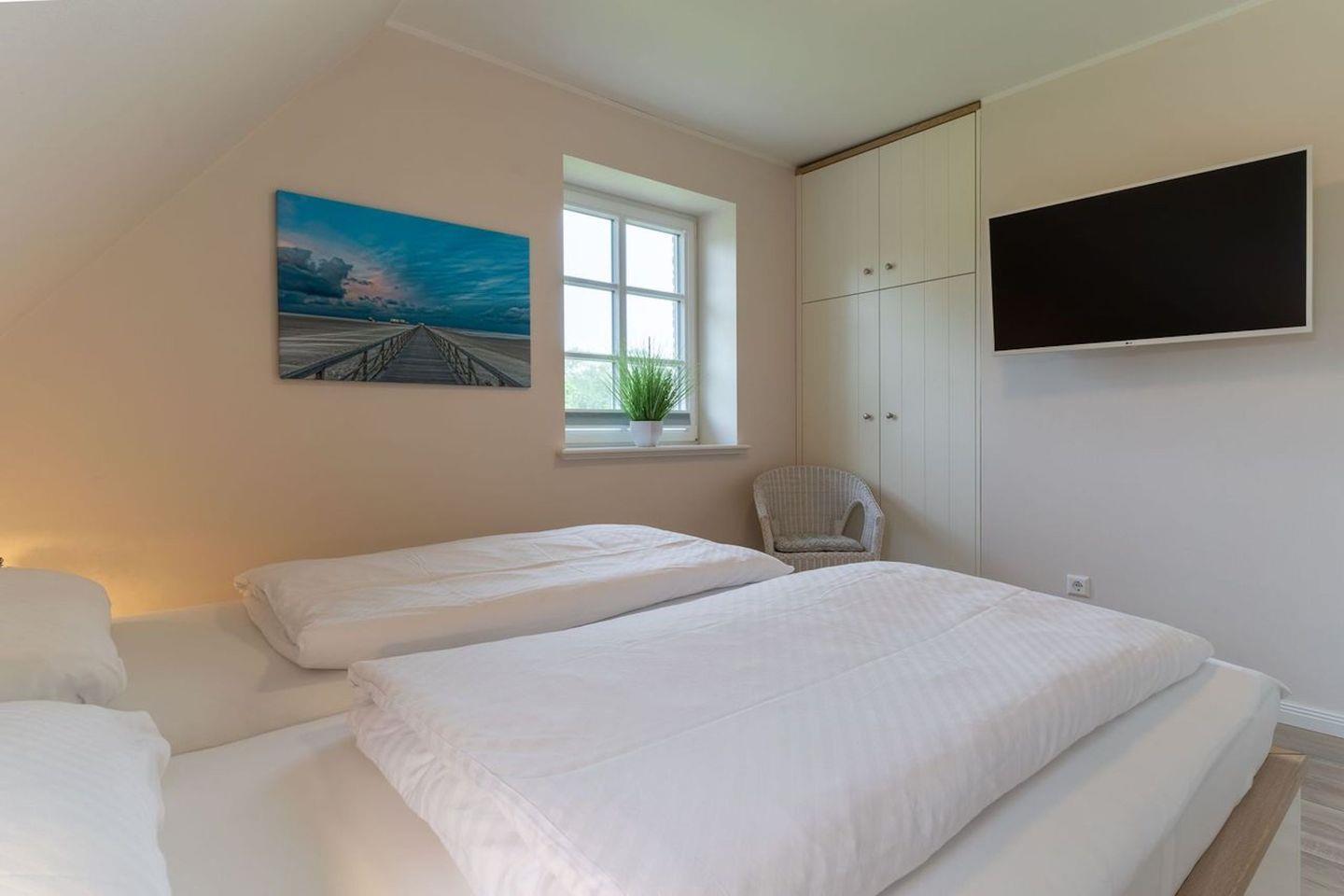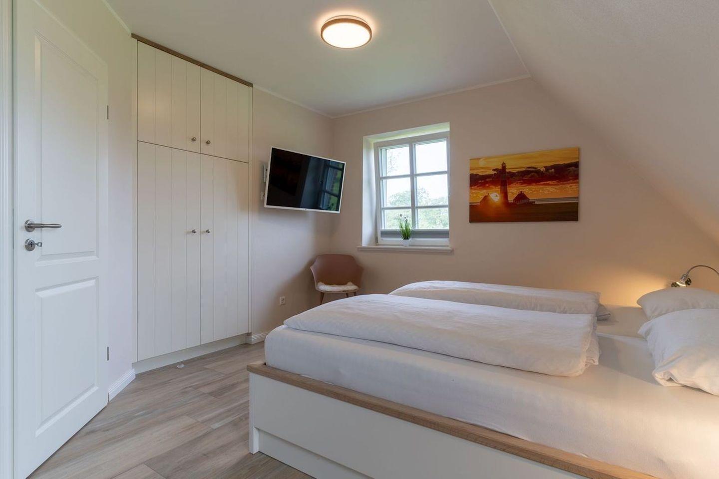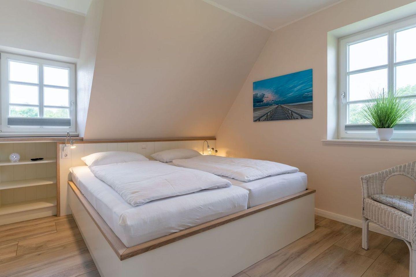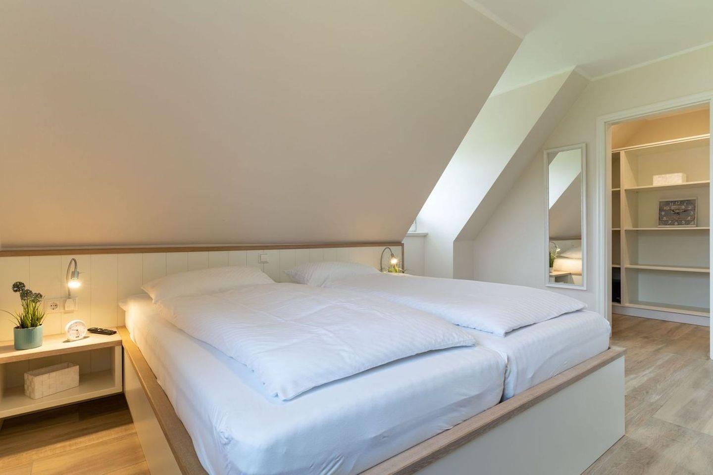 Über eine Holztreppe gelangt man in das Obergeschoss. Die beiden Schlafzimmer, jeweils mit einem Doppelbett sorgen für ruhevolle Erholung. Einbauschränke gewähren Ihnen hinreichend Ablageflächen.
