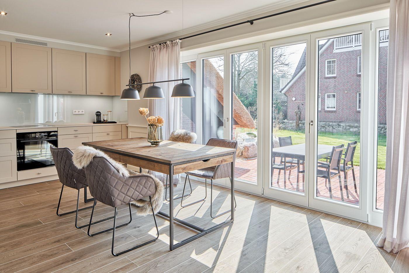 Modernes Reetdach-Appartement LYKKE 2 in St. Peter-Bad mit Sauna, Terrasse und E-Ladestation für entspannten Urlaub.