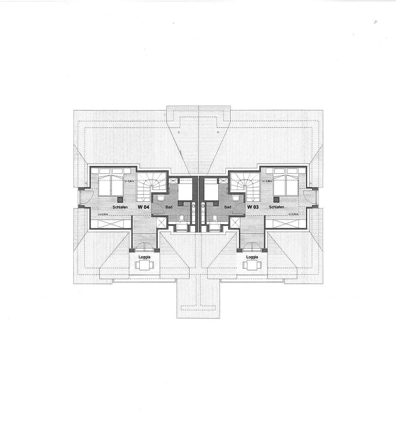 Dachgeschoss: ein offenes Schlafzimmer mit Doppelbett (180 x 200 cm) mit Zugang zur Loggia, ein Duschbad