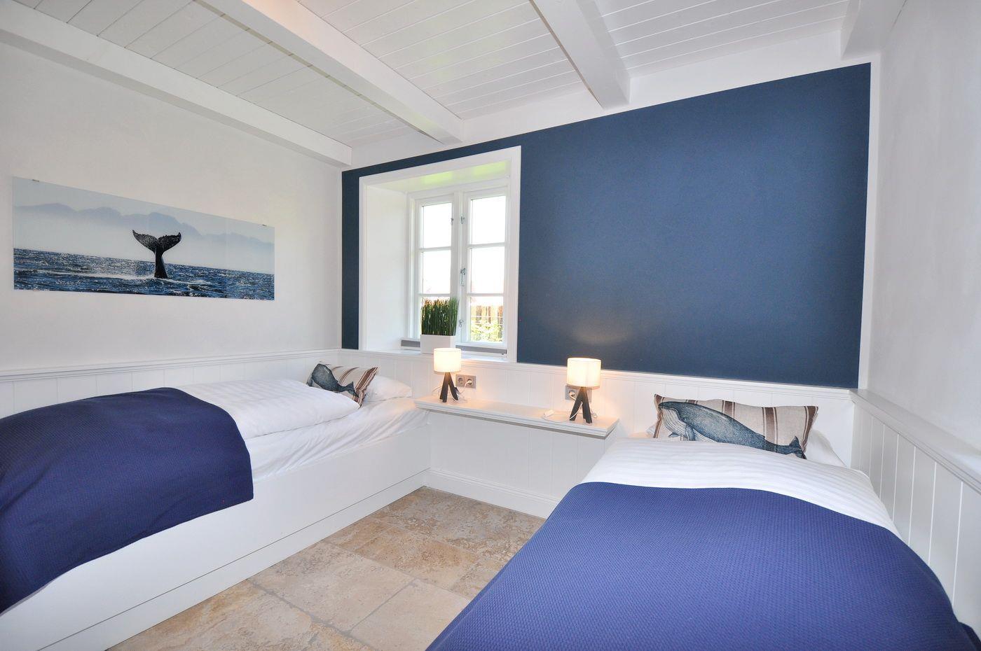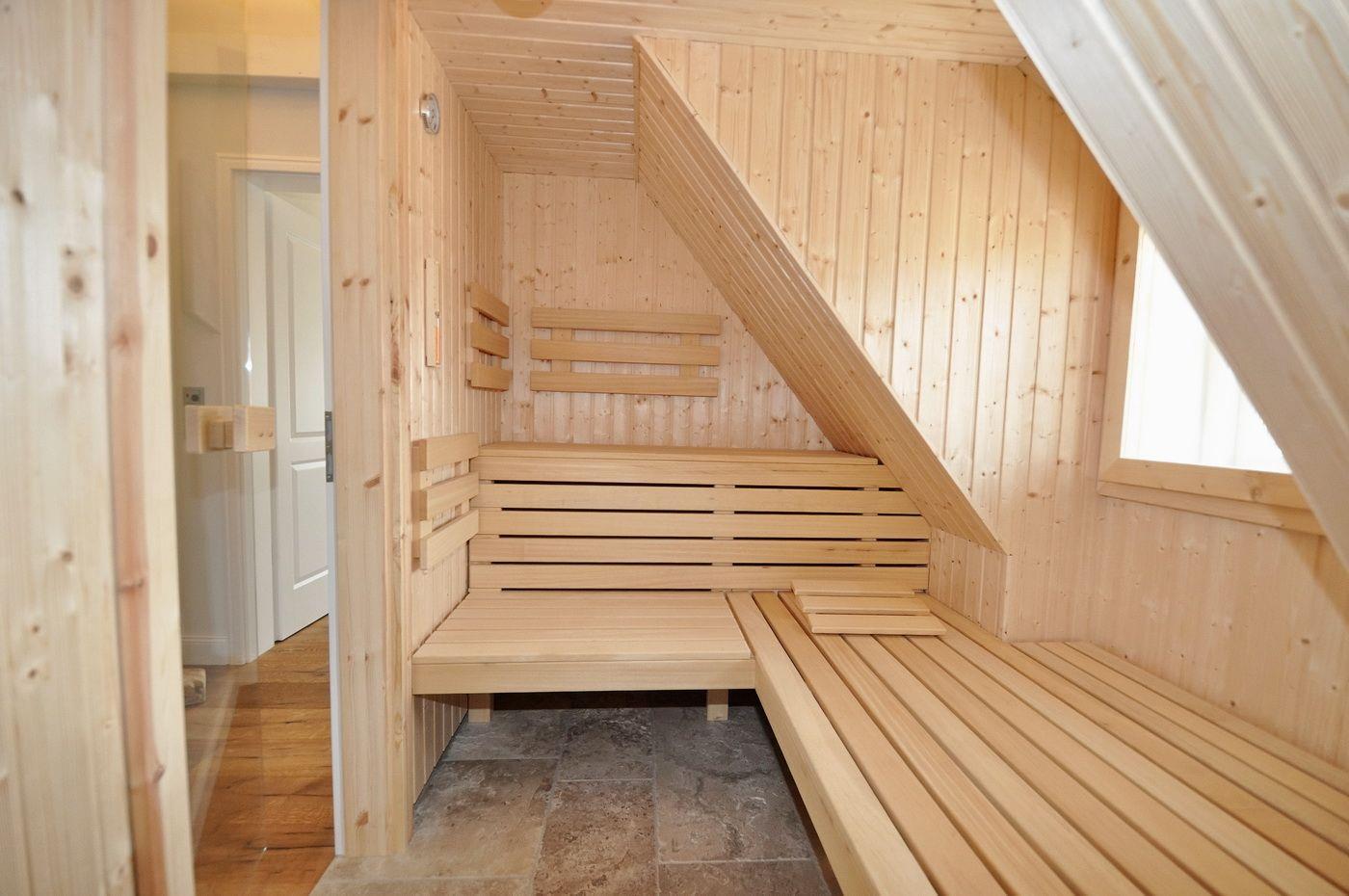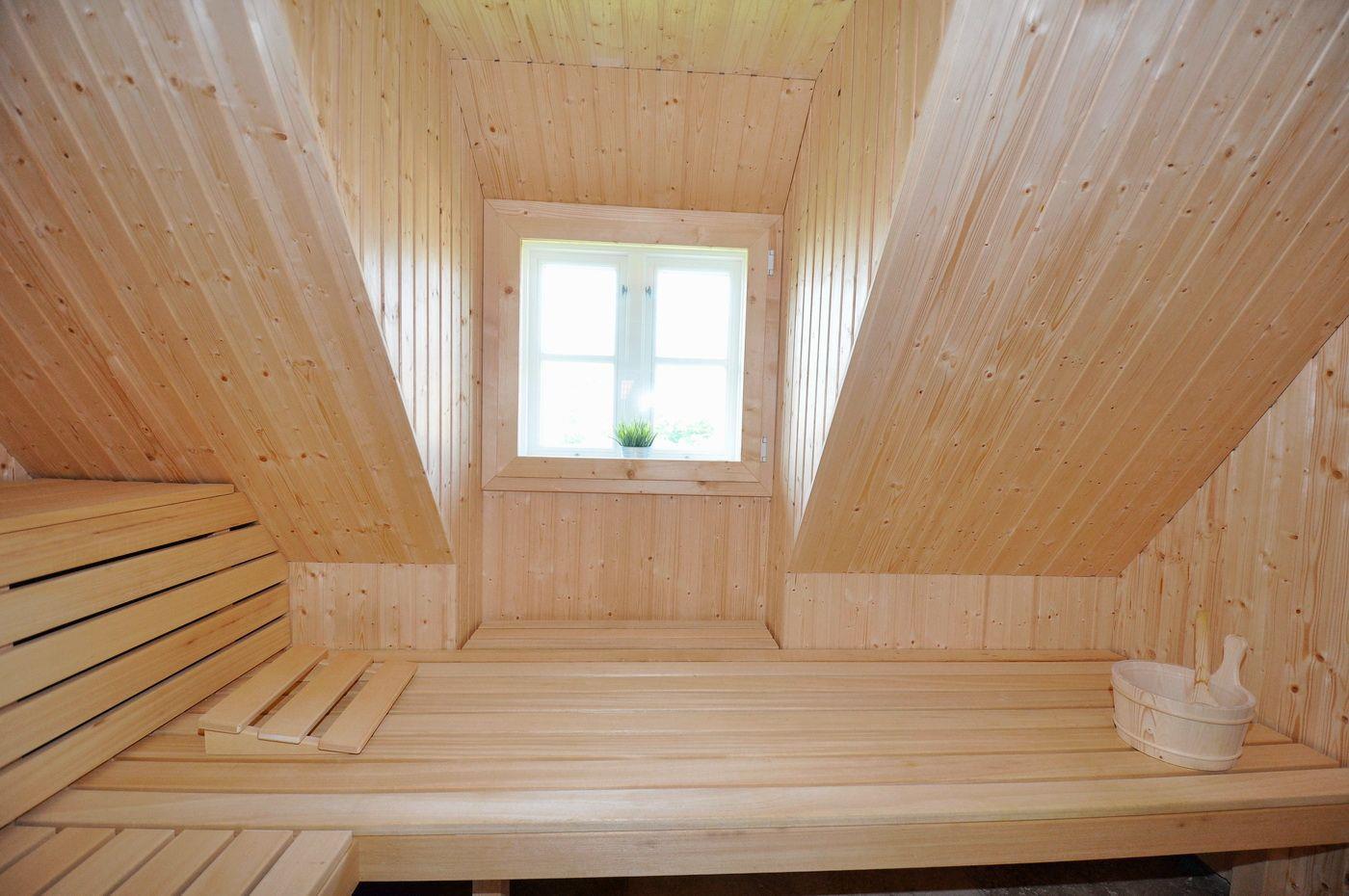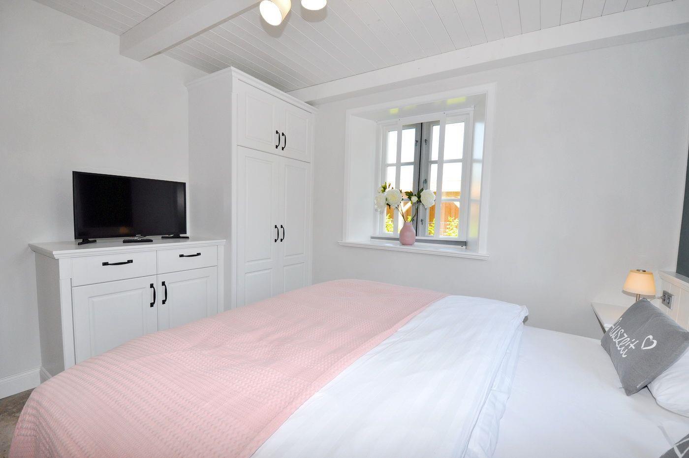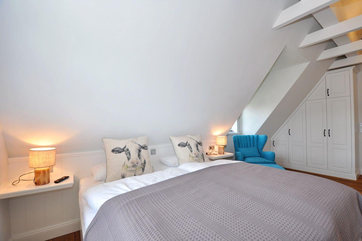 Obergeschoss: zwei Schlafzimmer mit Doppelbett (je 180 x 200 cm), TV und jeweils einem Duschbad en Suite, eine Sauna