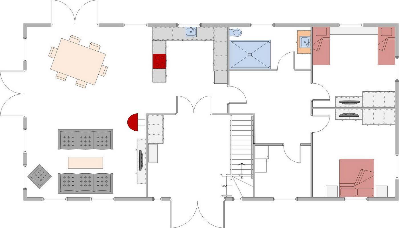 Erdgeschoss: Eingangsbereich, Wohnraum mit integrierter Küche, Essbereich, Mylin-Kachelofen und Zugang zu den Terrassen, ein Schlafzimmer mit Doppelbett (180 x 200 cm) und TV, ein Schlafzimmer mit zwei Einzelbetten (je 90 x 200 cm), ein Duschbad, ein Hauswirtschaftsraum