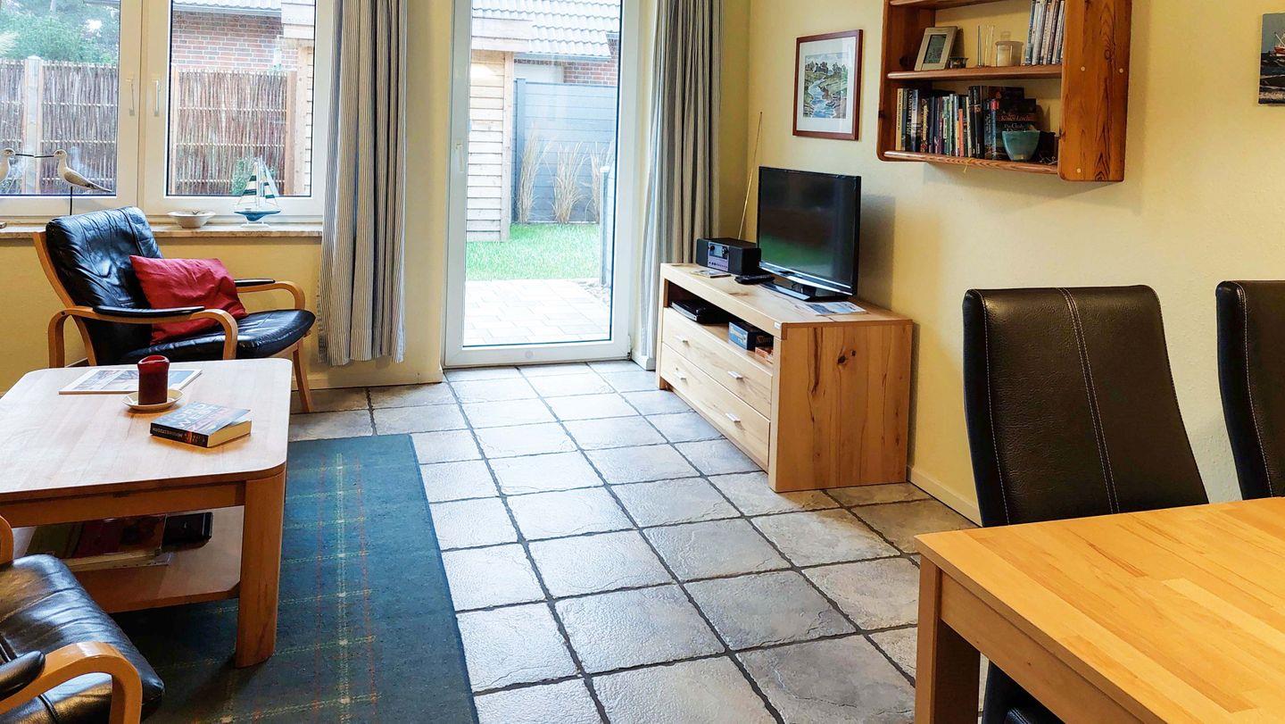 1995 erbaute, ruhige Reetdach-Reihenhausanlage im idyllischen Dorfteil hinter den Dünen. Dorfzentrum mit Restaurants, Cafés und Einkaufsmöglichkeiten in 3 Gehminuten erreichbar. Seedeich mit Strandübergang nach ca. 8 Minuten Fußweg durch die Dünen. Das 50 qm große Reihenmittelhaus erstreckt sich über 2 Etagen im dänischen Stil. Ausgestattet mit Kabel-TV, WLAN, Mikrowelle, Geschirrspüler, Fußbodenheizung. Terrasse mit Gartenmöbeln, PKW-Stellplatz am Haus. Erdgeschoss: Wohnraum mit Essecke und offener Küche, kleines Duschbad/WC, Abstellraum. Obergeschoss: 2 Schlafräume, 5 Betten (1 Doppelbett, 3 Einzelbetten).