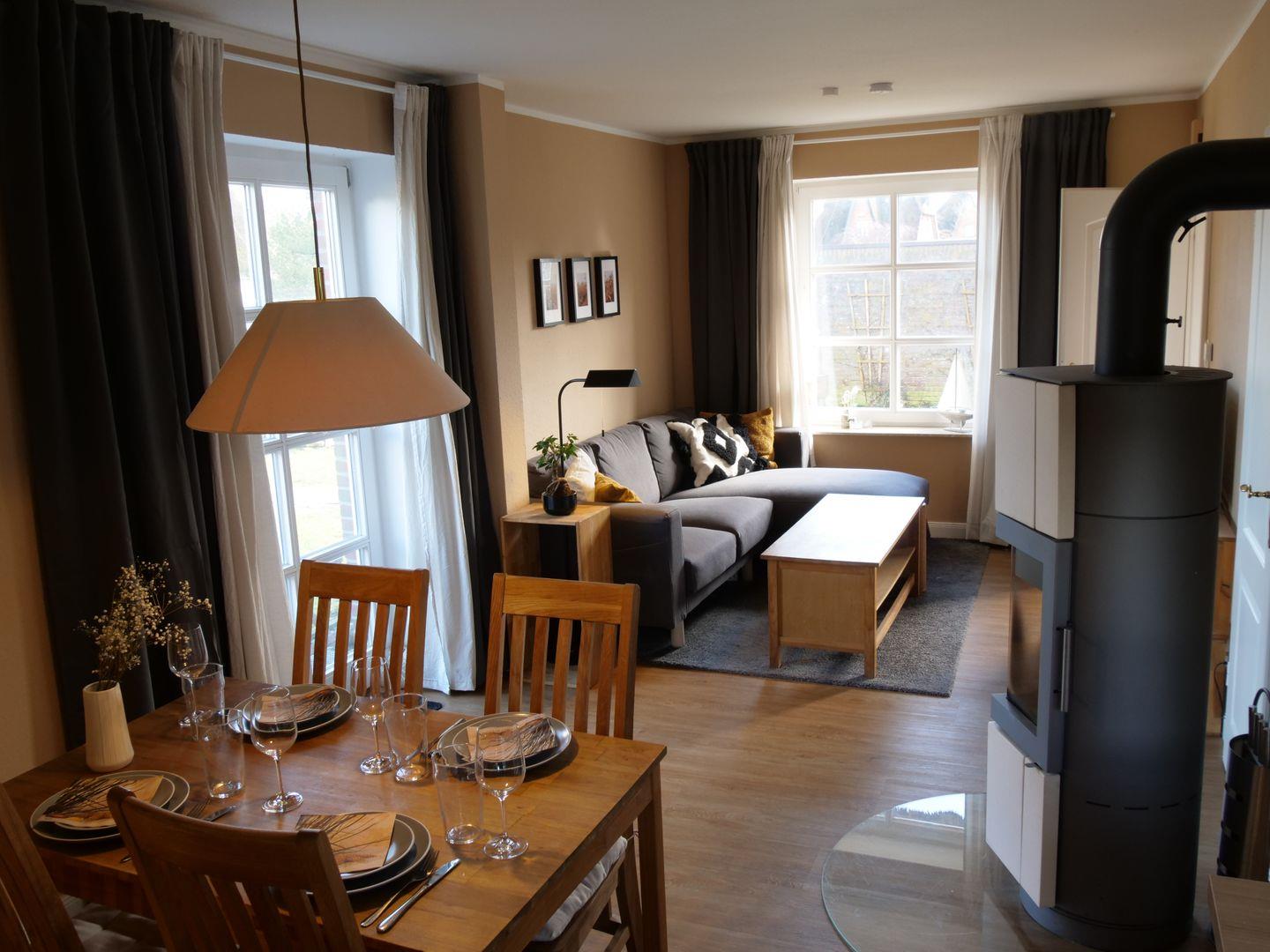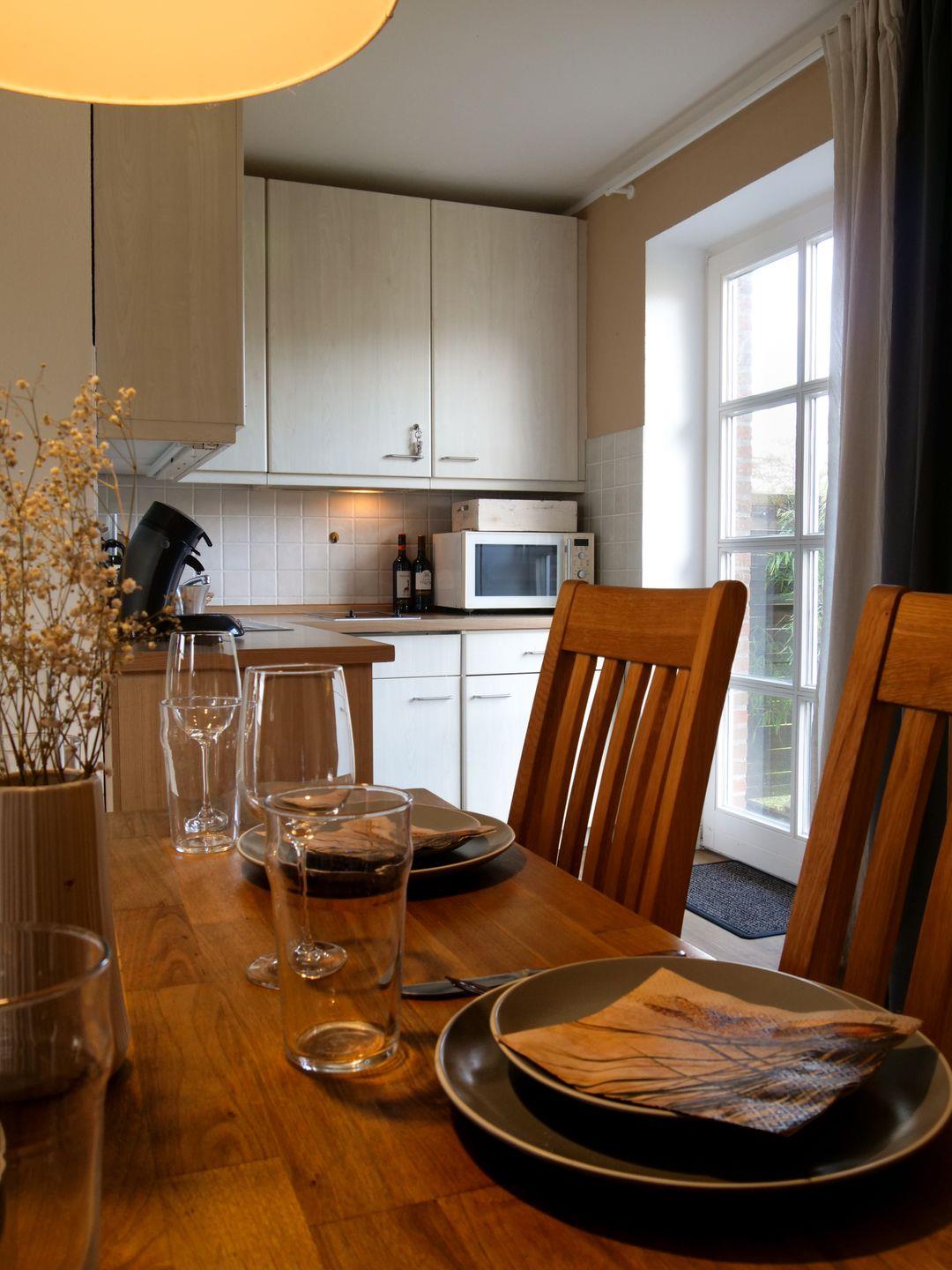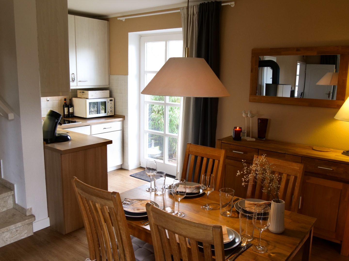 Im Erdgeschoss erwartet Sie ein Kamin, der den Wohn- und Essbereich beheizt und eine wunderbare Gemütlichkeit schafft. Die offene Küche ist bestens ausgestattet und lädt zum gemeinsamen Kochen und Genießen ein. Hier finden Sie unter anderem einen Geschirrspüler und eine Mikrowelle vor.
