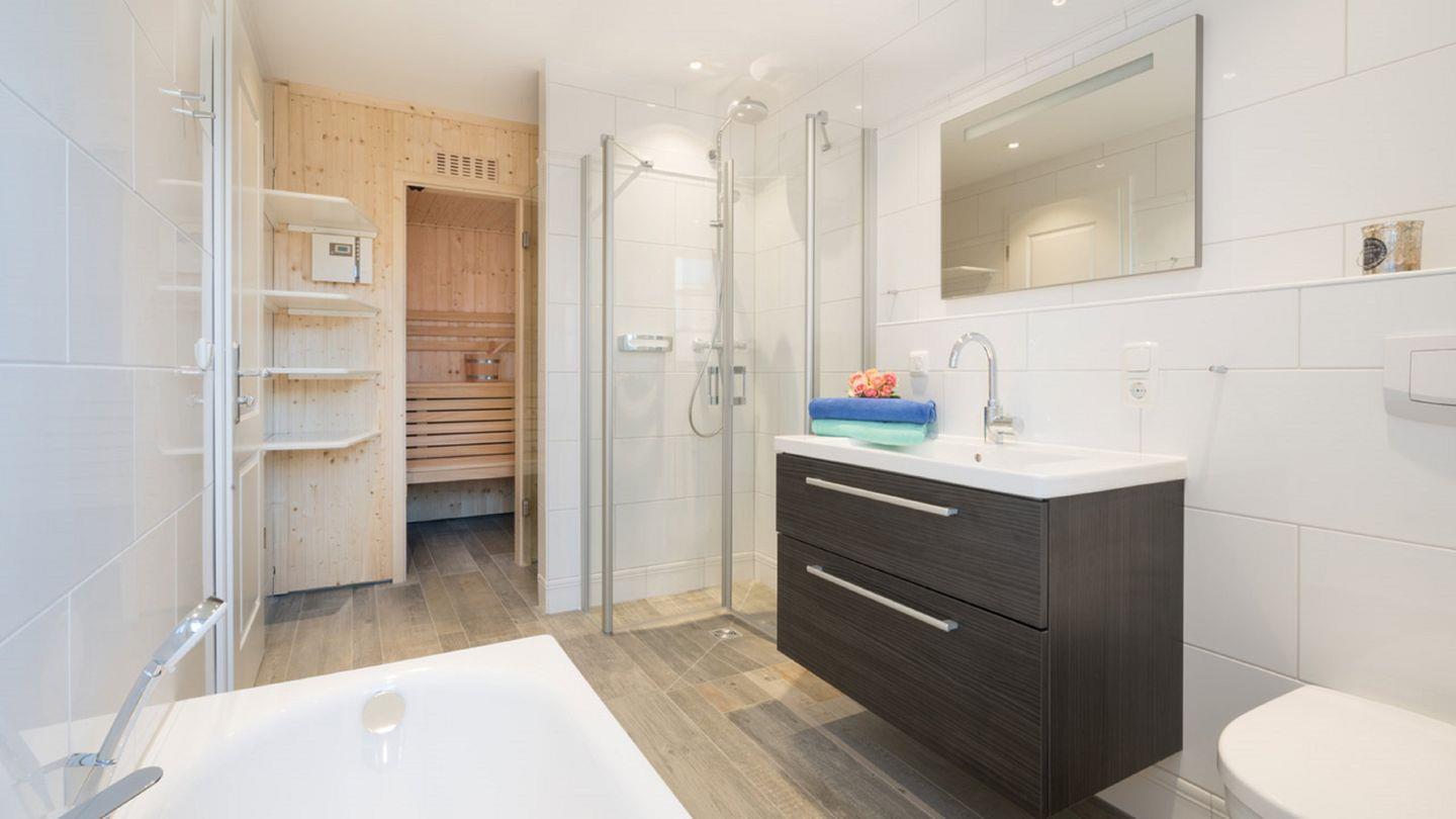 Ein absolutes Highlight der Wohnung ist die private Sauna, die sich in einem der Badezimmer befindet, das zudem eine entspannende Badewanne bietet. Es gibt außerdem ein separates Duschbad sowie eine praktische Waschmaschine und einen Trockner für Ihre Wäsche.