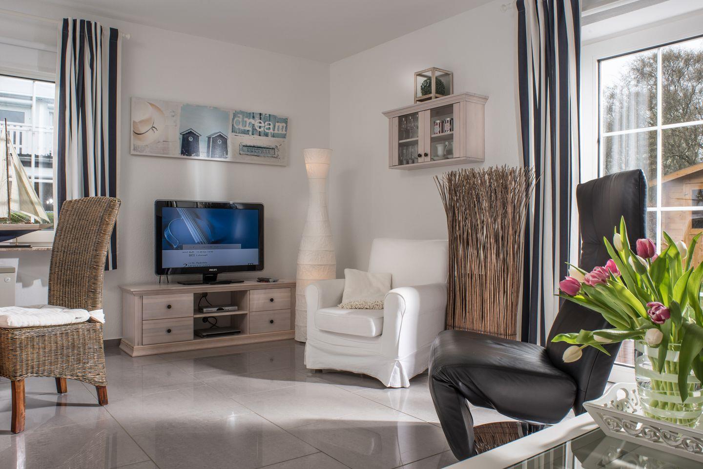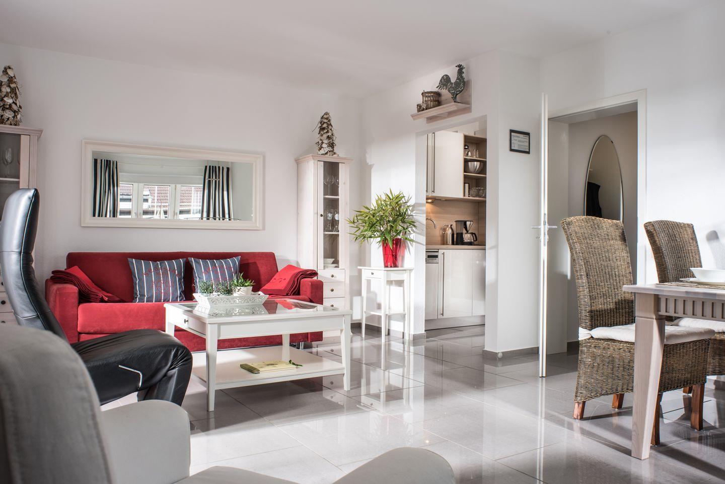 Die ca. 50 qm große Wohnung beeindruckt mit hochwertiger Ausstattung. Hier erwartet Sie eine moderne, dennoch landestypische und gemütliche 2-Zimmer-Wohnung mit Terrasse. Die integrierte Küchenzeile bietet Cerankochfeld und Kühlschrank.