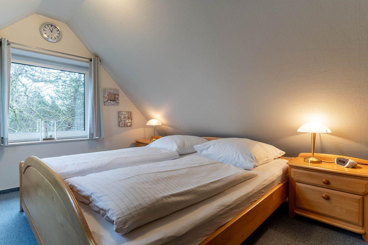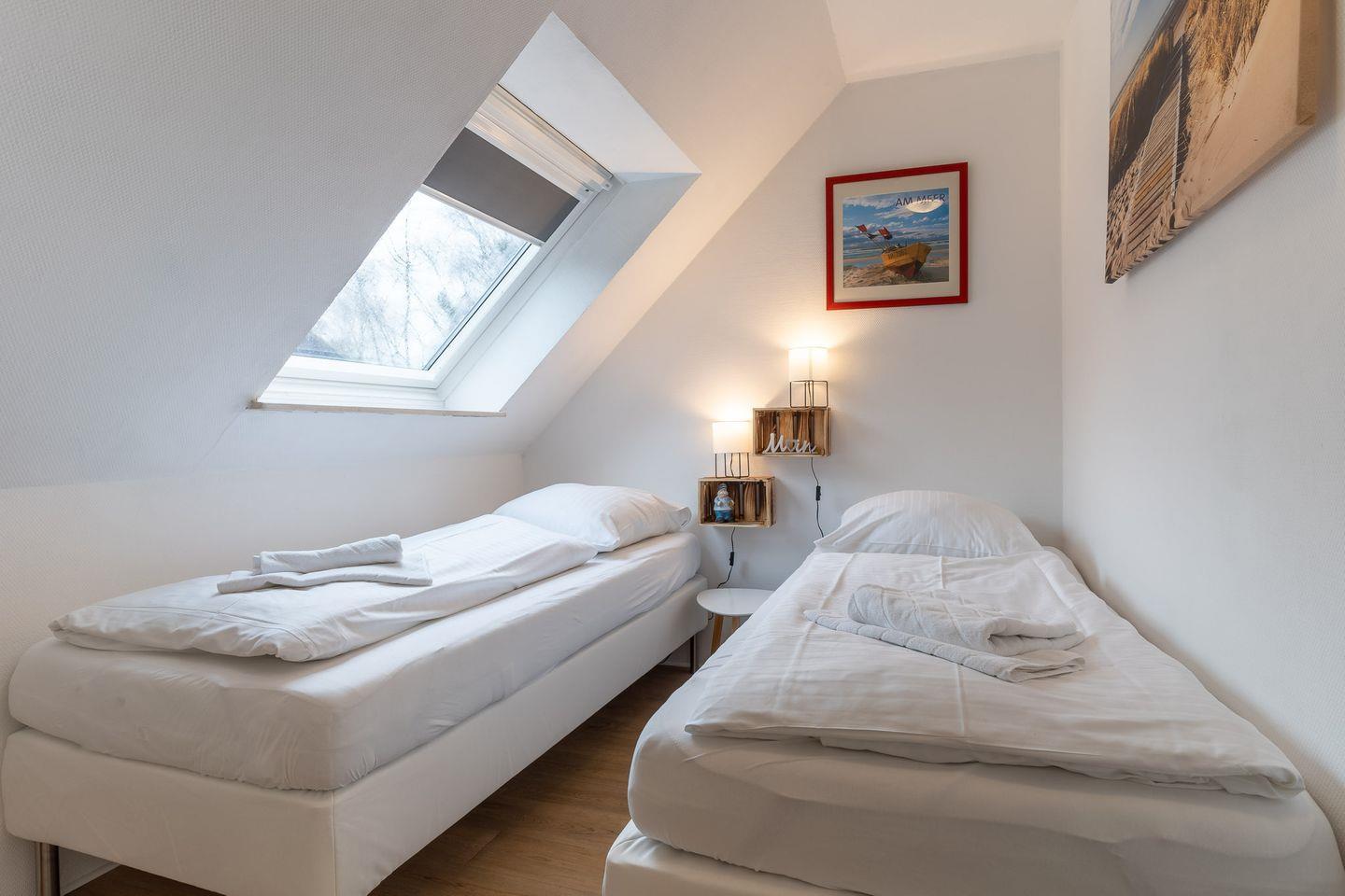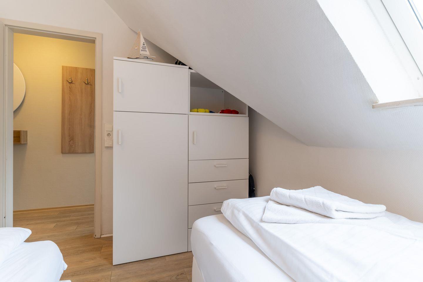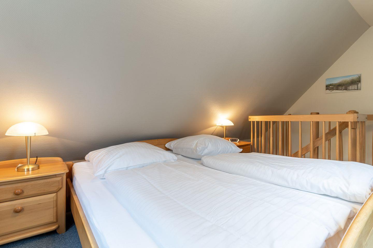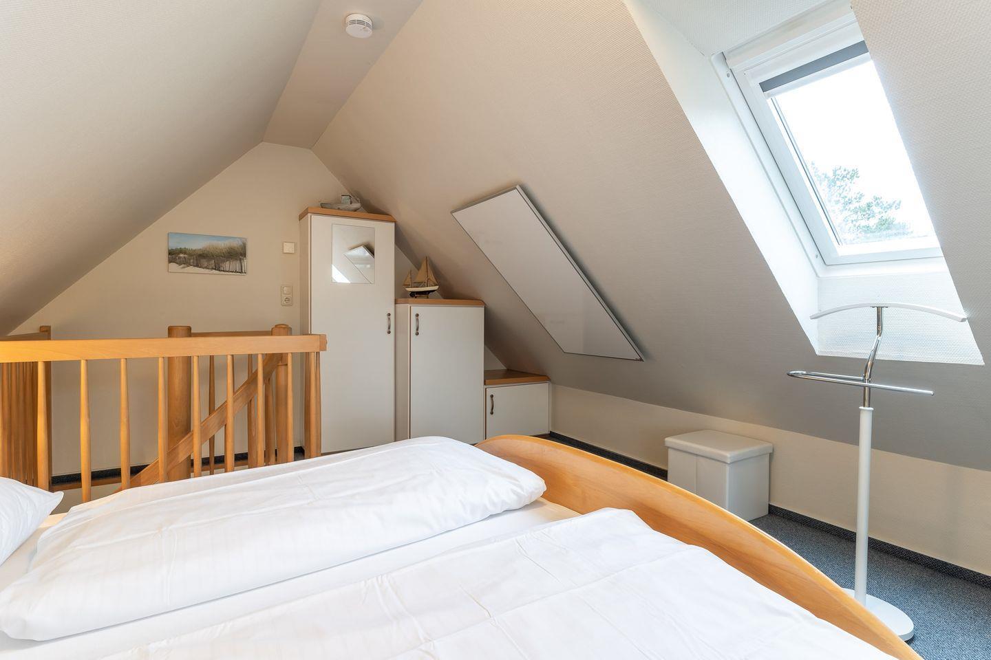 Der Balkon mit Gartenmöbeln verspricht gemütliche Sommerabende und lädt zum Verweilen ein. Über eine Wendeltreppe gelangen Sie zum Schlafzimmer mit Doppelbett im Staffelgeschoss. Ein weiteres Schlafzimmer mit zwei Einzelbetten befindet sich auf der ersten Etage. Das Duschbad/WC mit Fenster erreichen Sie ebenfalls auf dieser Ebene.