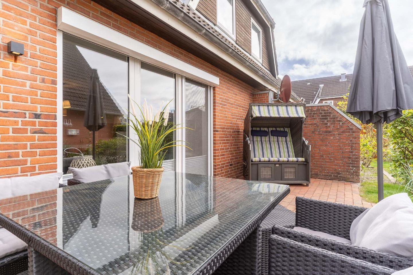 Terrasse mit Gartenmöbeln und Strandkorb (Ostern bis Oktober). PKW-Stellplatz vorhanden.