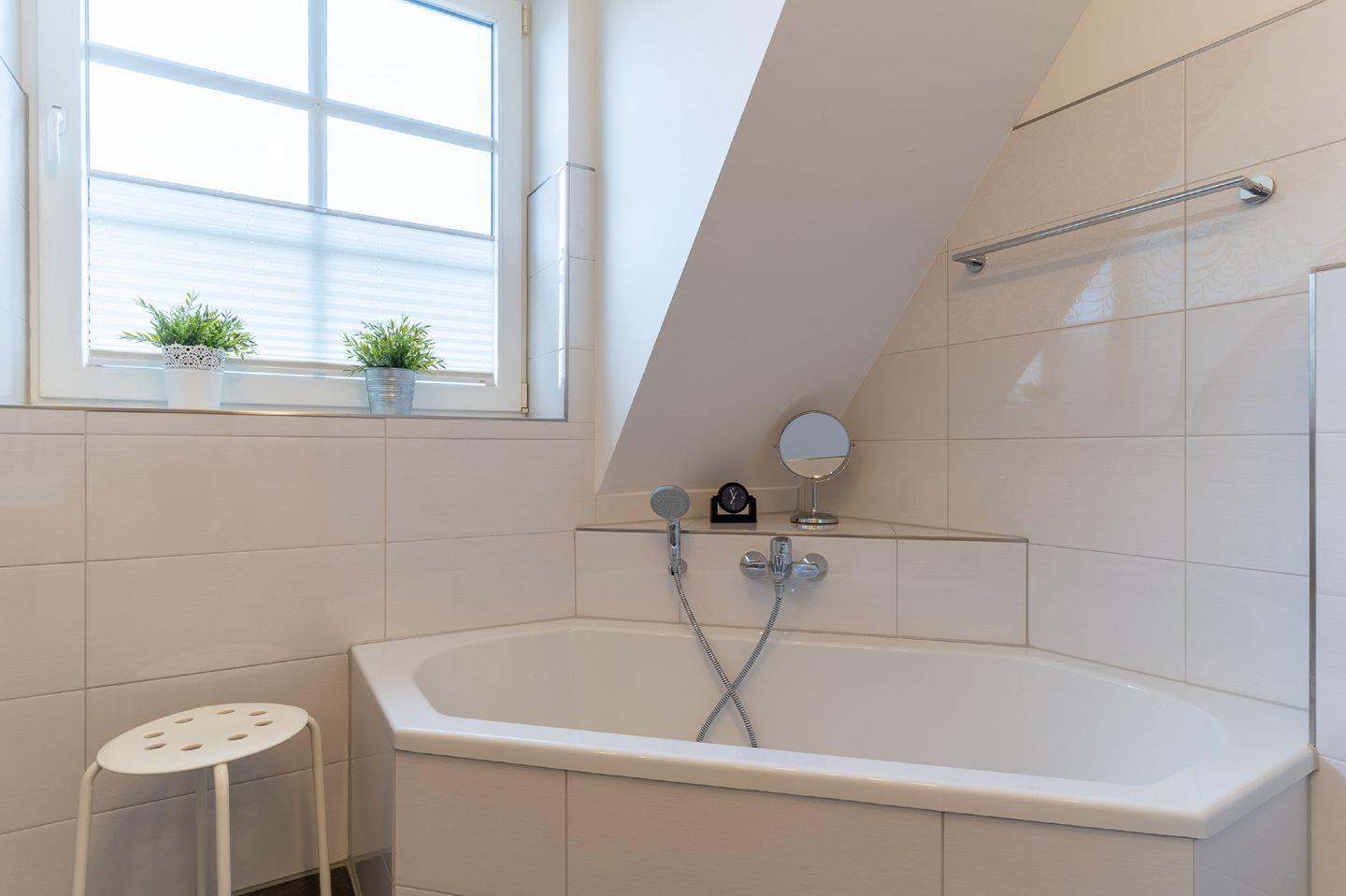 Im 1. OG befinden sich 2 Schlafzimmer mit Doppelbett (eines mit Fernseher) und ein Bad mit Dusche und Wanne.