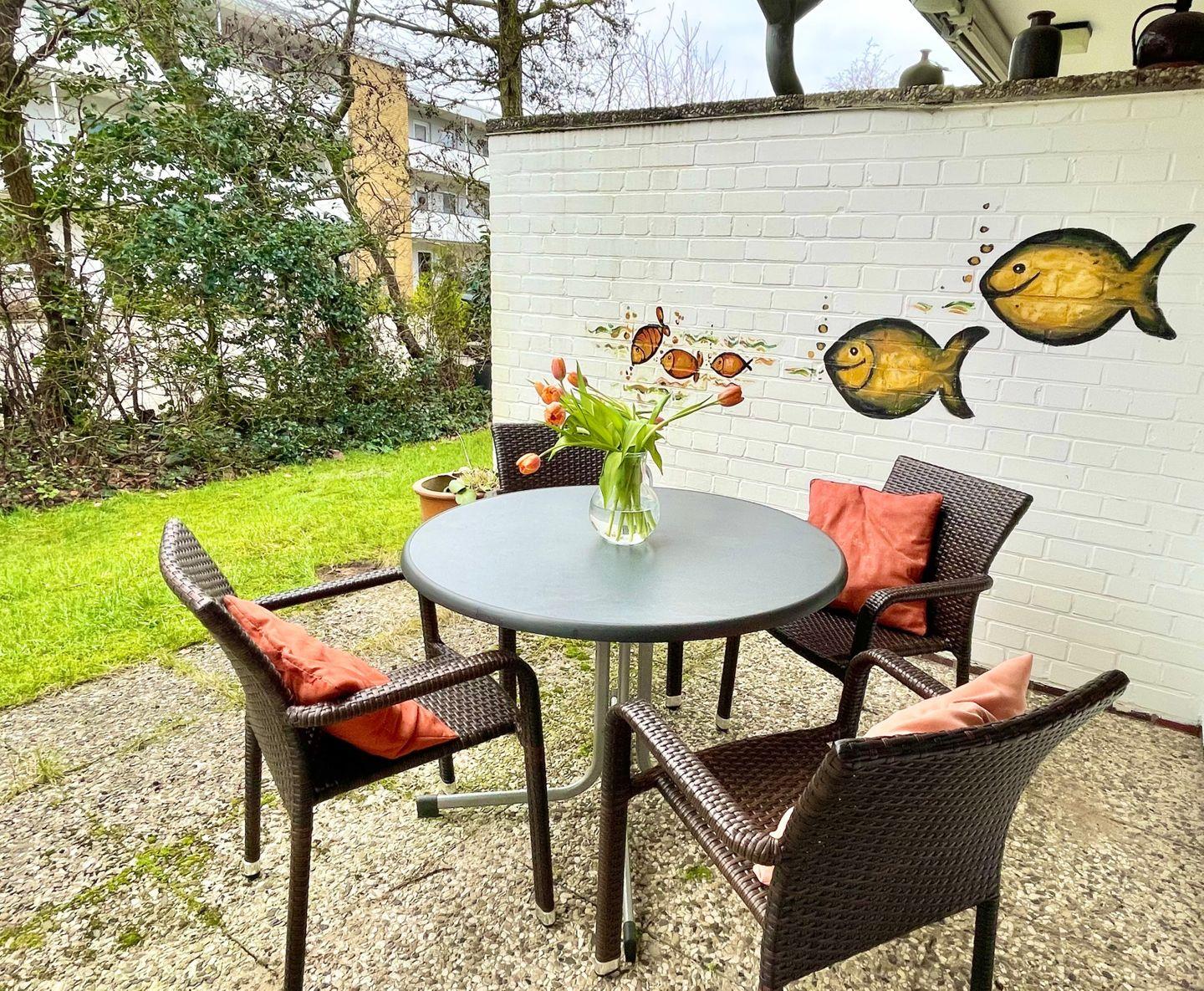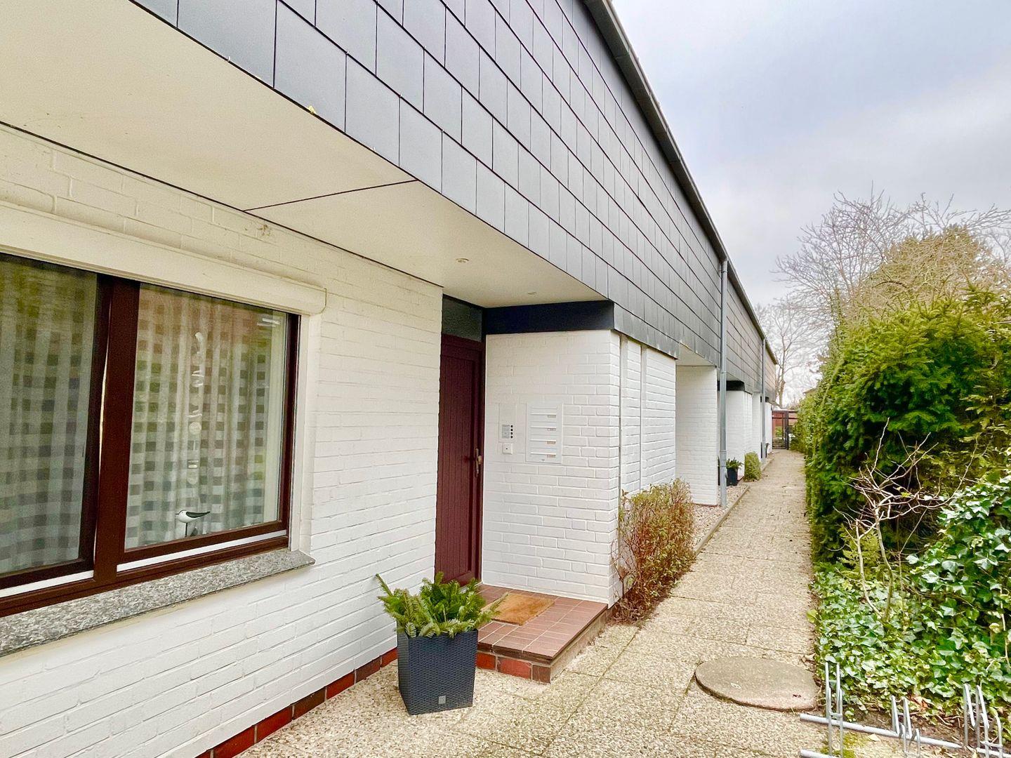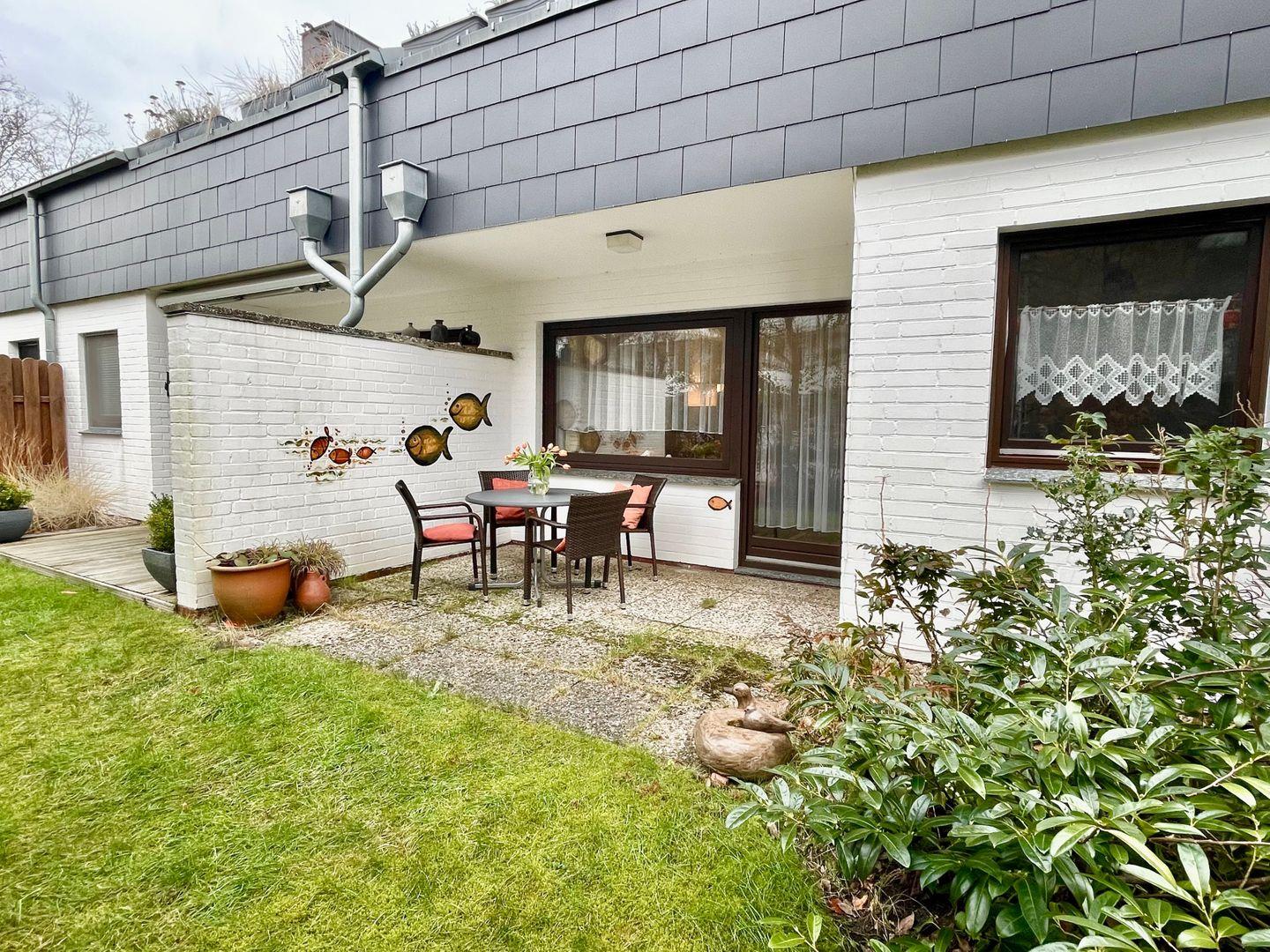 Gemütliche Ferienwohnung in St. Peter-Ording mit Terrasse, Gartenmöbeln und PKW-Stellplatz, ideal für 2 Personen im Erdgeschoss gelegen.