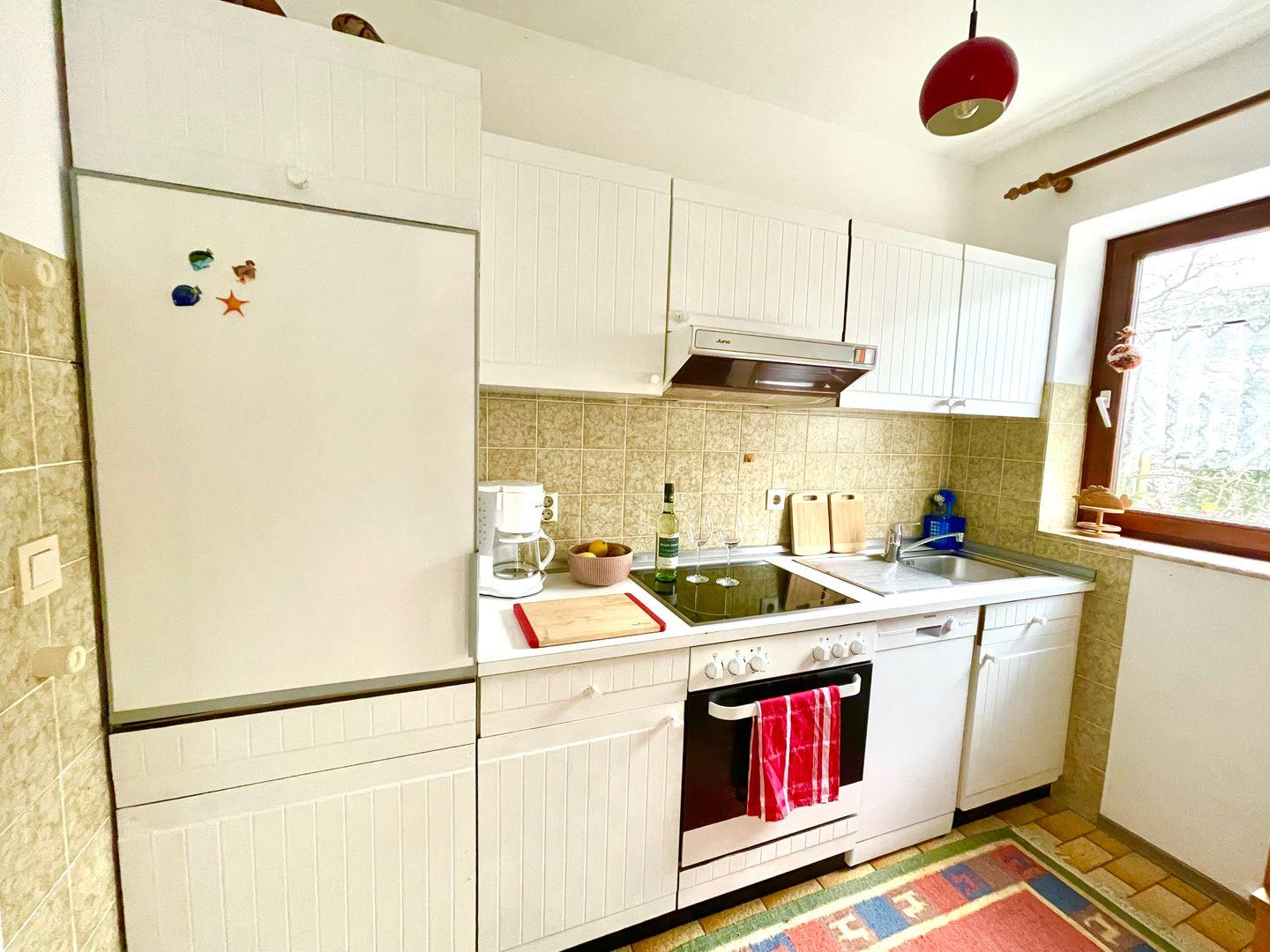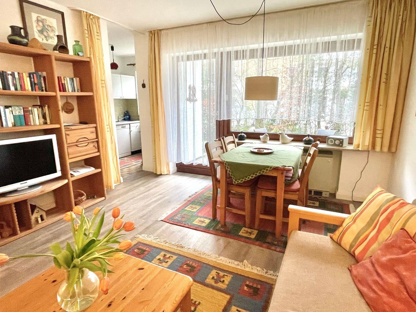 Die Wohnung erstreckt sich über ca. 50 qm und ist hell und freundlich eingerichtet. Das Wohnzimmer mit Essecke erhält viel Tageslicht durch die Fensterfront, die zum Zugang auf die Terrasse führt. Die offene Küche ist gut ausgestattet und verfügt über einen Backofen und einen Geschirrspüler. WLAN ist vorhanden.